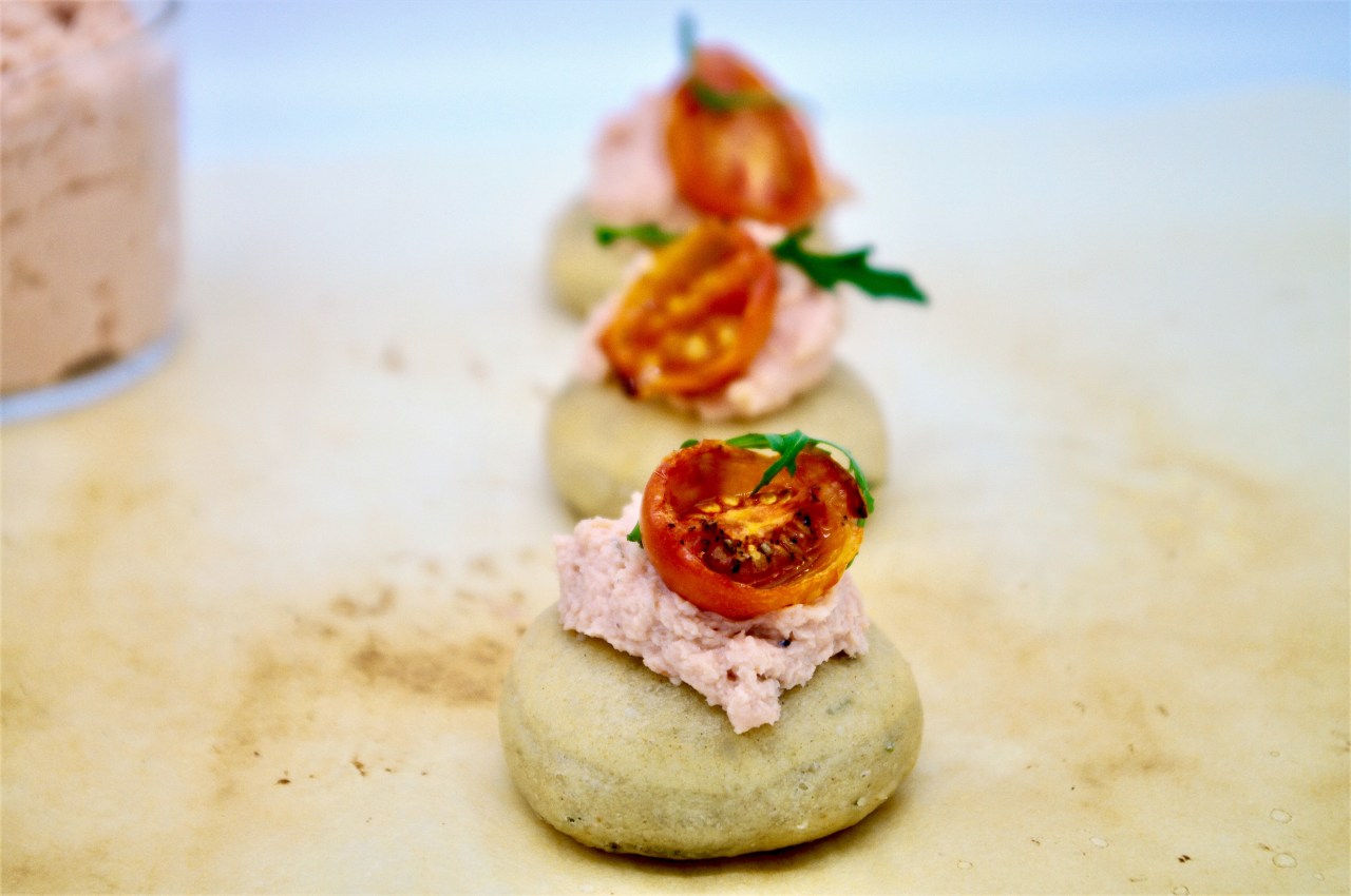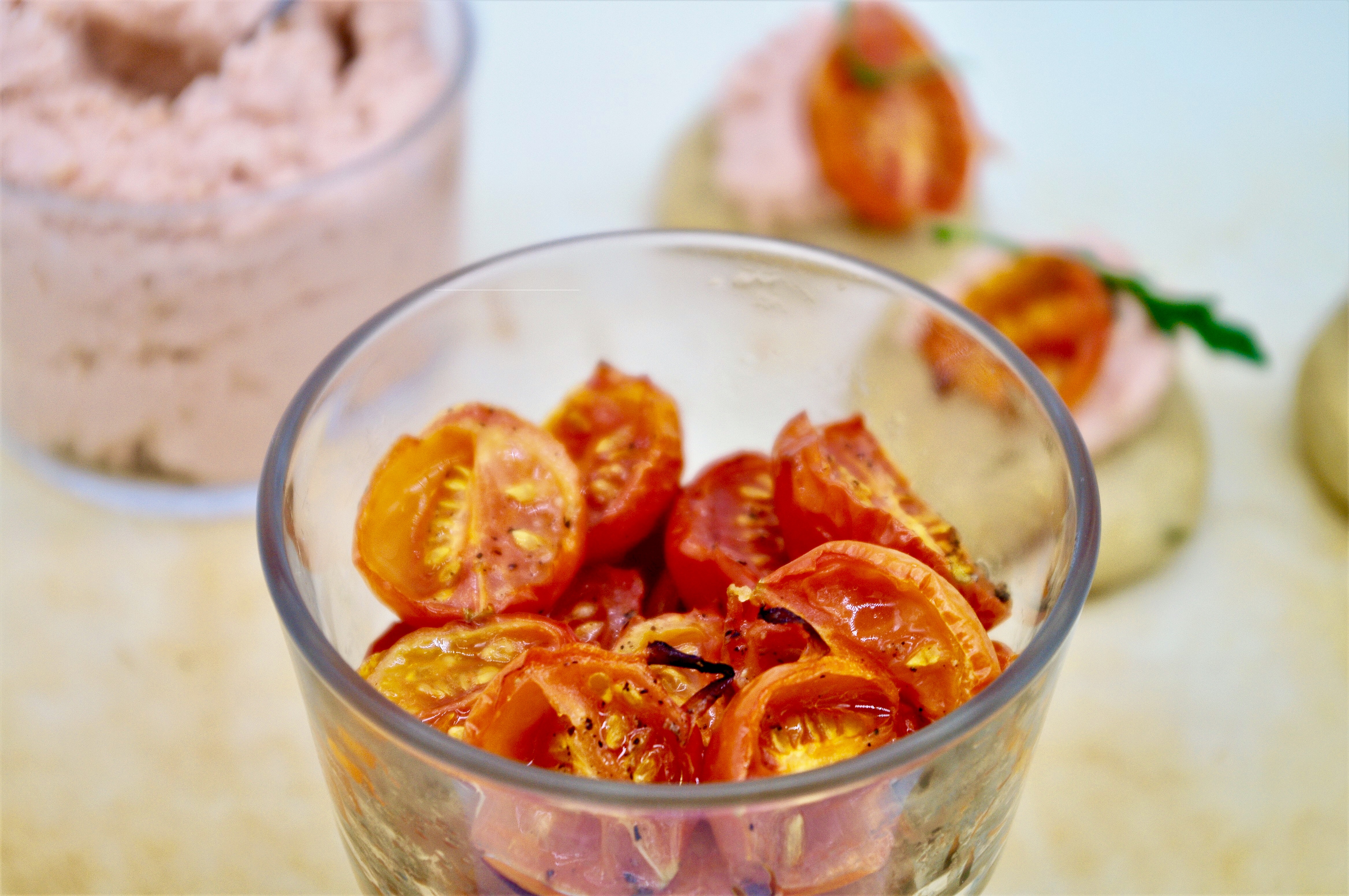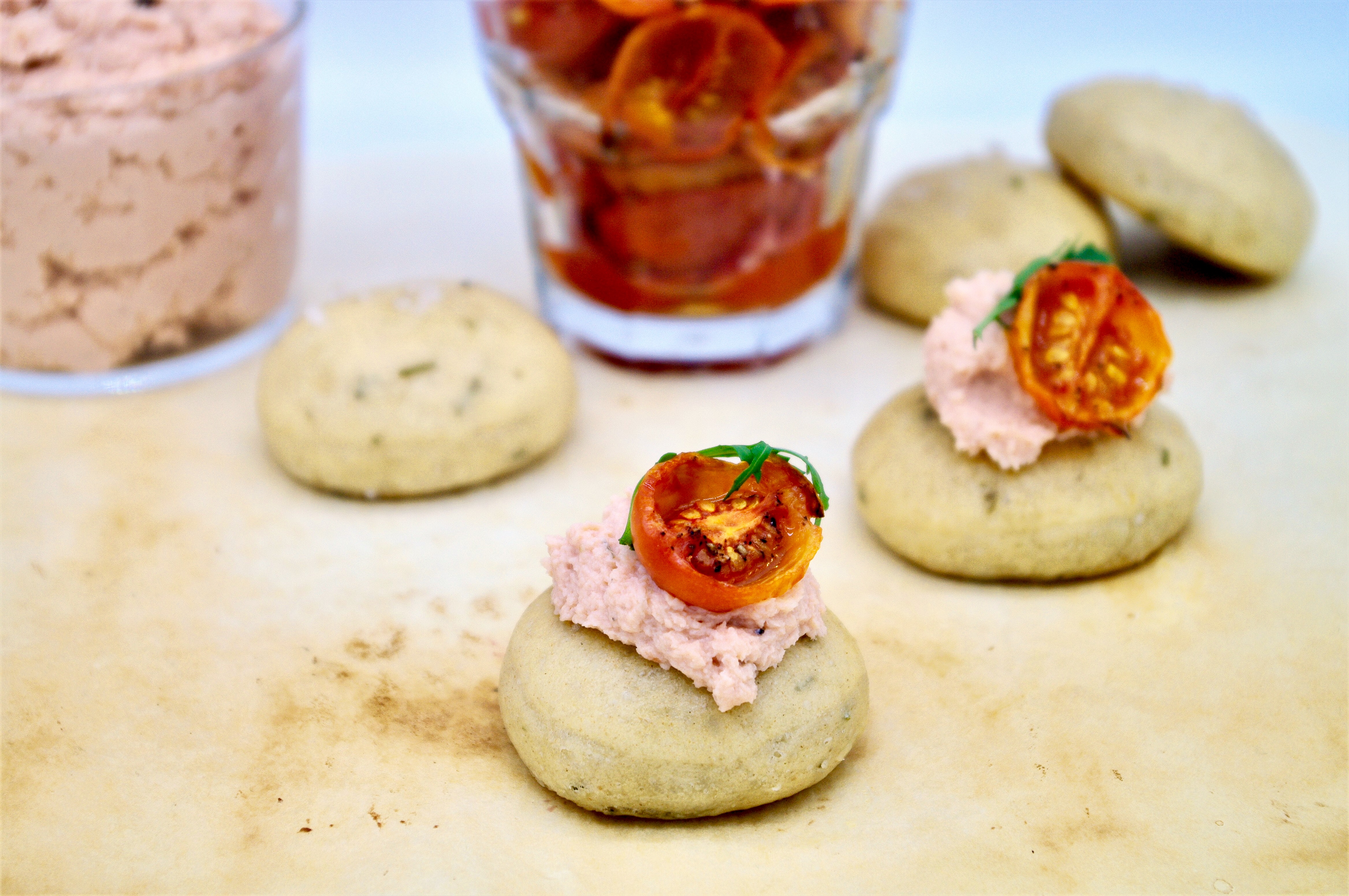 Garnish scones with salmon cream and half a tomato and place on serving plate. Alternatively you can serve everything in small bowls and let each person make his own canapé. ENJOY!