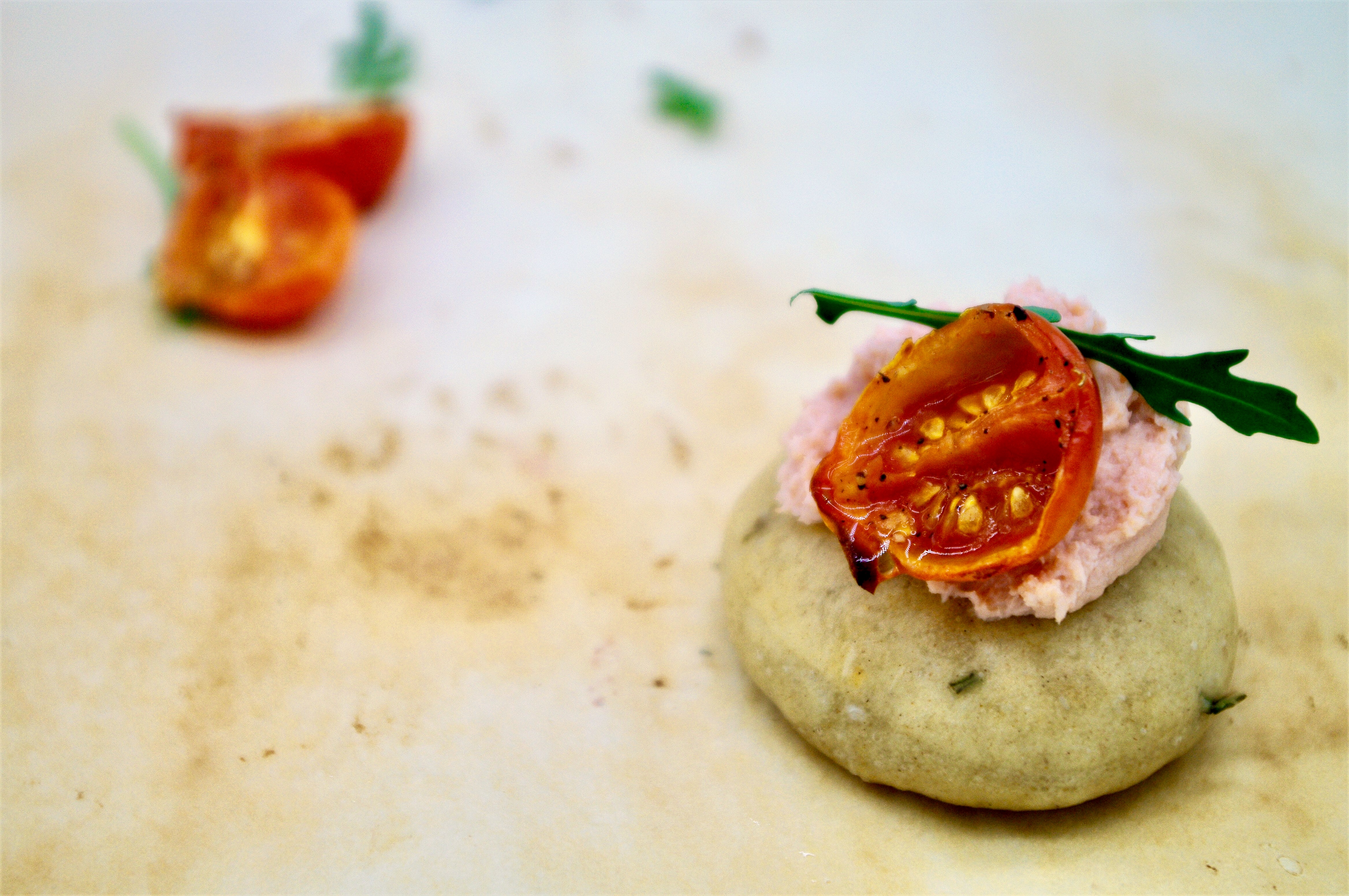 Questa è l’unione di tre ricettine diverse, tre chicche da salvare e riutilizzare in svariati modi. La focaccia può essere fatta in forma unica e mangiata al posto del pane oppure a quadrotti in svariati antipasti; la crema al salmone è ottima per condire la pasta o da spalmare nei panini del pranzo; idem per i pomodorini. In questa versione, insieme creano un finger-food niente male, dal gusto completo, perfetto per un buffet, un aperitivo in piedi, un antipasto gustoso. Qualsiasi erba aromatica può essere sostituita con una più gradita, l’aglio può essere evitato o sostituito con scalogno / cipolla. Viva la fantasia e gli antipasti sostanziosi.