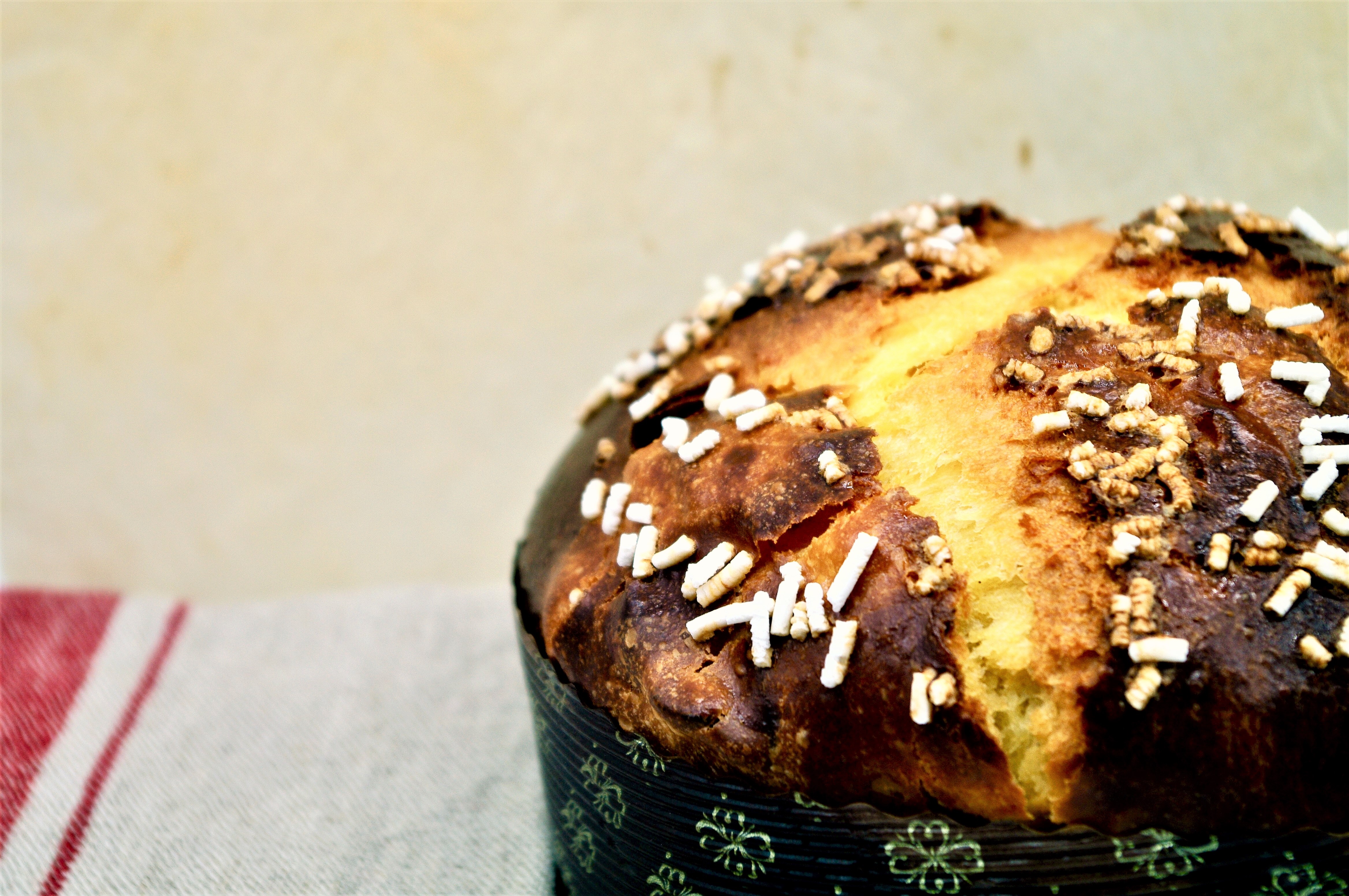 After rising, deflate the dough, weigh it and divide it into two pieces. Give each piece a round shape and place them in the molds (I used two low panettone paper molds, but you can also make 6 balls, and place 3 for each plum-cake mold, covered with parchment paper). Cover molds with film and let rise at 25° until doubling (5-7h). Remove the film, brush the surface with yolk mixed with milk and garnish with pearl sugar. Bake in preheated static oven, on the lower step, at 180° for 40′. Remove from oven and allow to cool well before tasting. ENJOY!