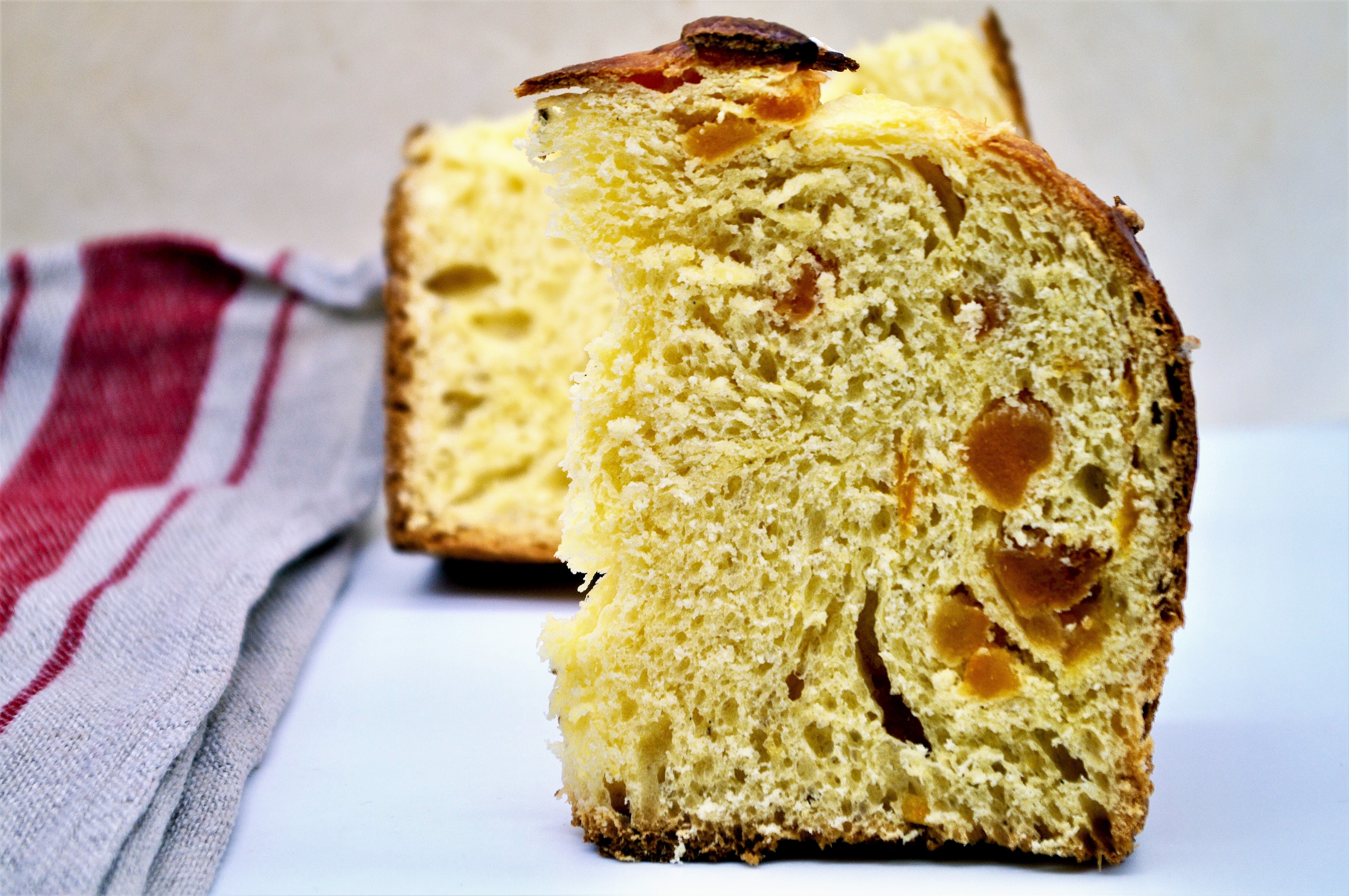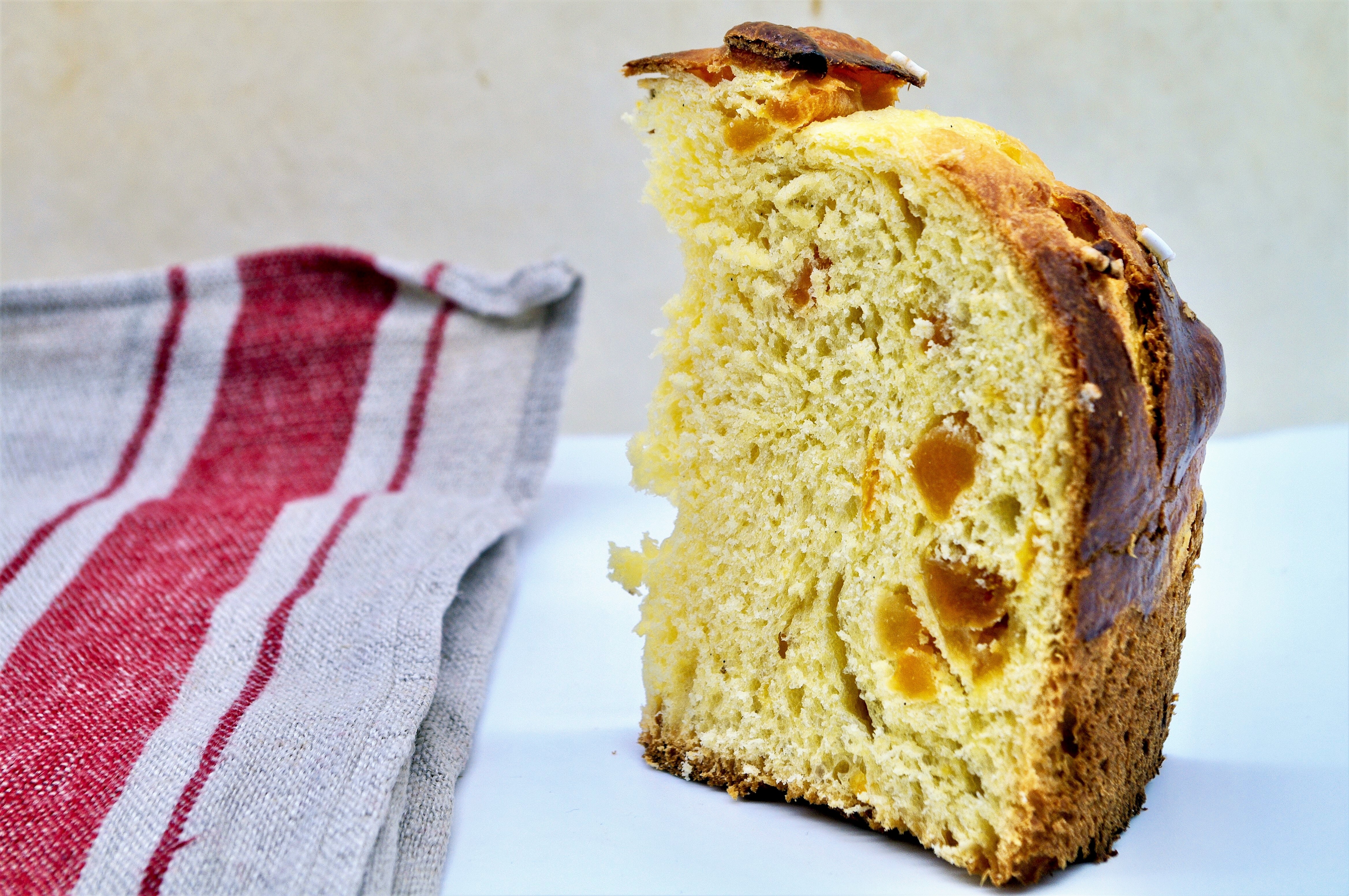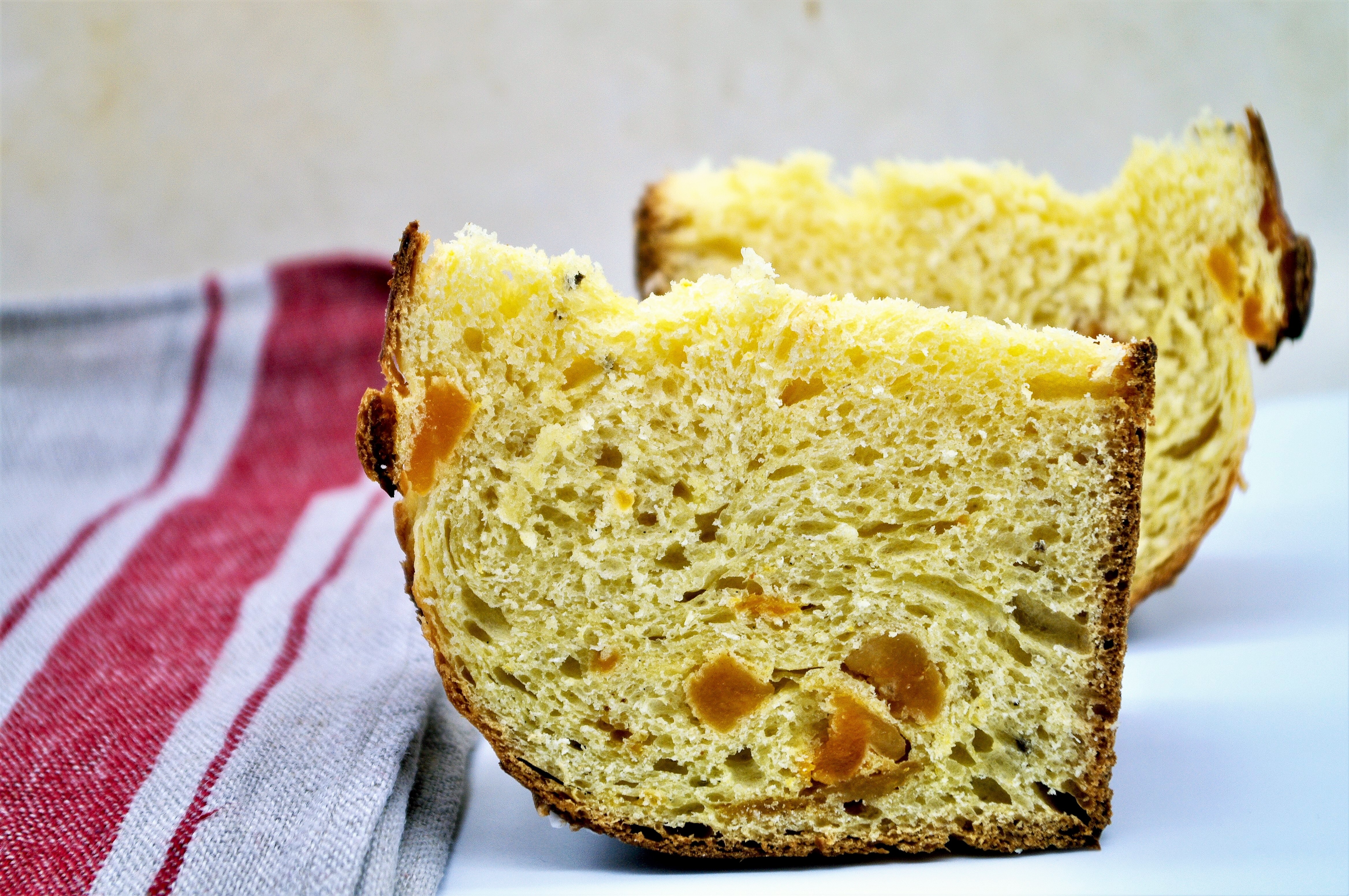 In the bowl of a mixer put flour, sourdough (refreshed 4 hours before), yeast and whole eggs: mix with dough hook until you obtain a very firm and homogeneous mixture. Add salt and keep mixing. Add sugar in 3 times, always waiting for the previous one to be absorbed: you will no longer see sugar crystals at the end (mix even for 30′, don’t rush). When the dough is perfectly rolled around the dough hook, and with a smooth aspect, insert aromatic paste and let it absorb. Now incorporate egg yolks in 3 times, making the dough well absorb the previous dose before adding the next. Finally add soft butter, always in 3 times and always paying attention to the absorption. At this point the dough will be smooth and velvety and rolled around the dough hook. Add apricots cut into small pieces (I get 6 pieces of big apricots) and mix: if the dough is well done it will be difficult to incorporate them, then turn off the machine twice and overturn the dough, eventually finishing the insertion by hand . Transfer the dough, which will be soft but perfectly manageable, on the work surface, roll it to give it a round shape and place it in a film-covered bowl and let rise for 12h at 14-16°.