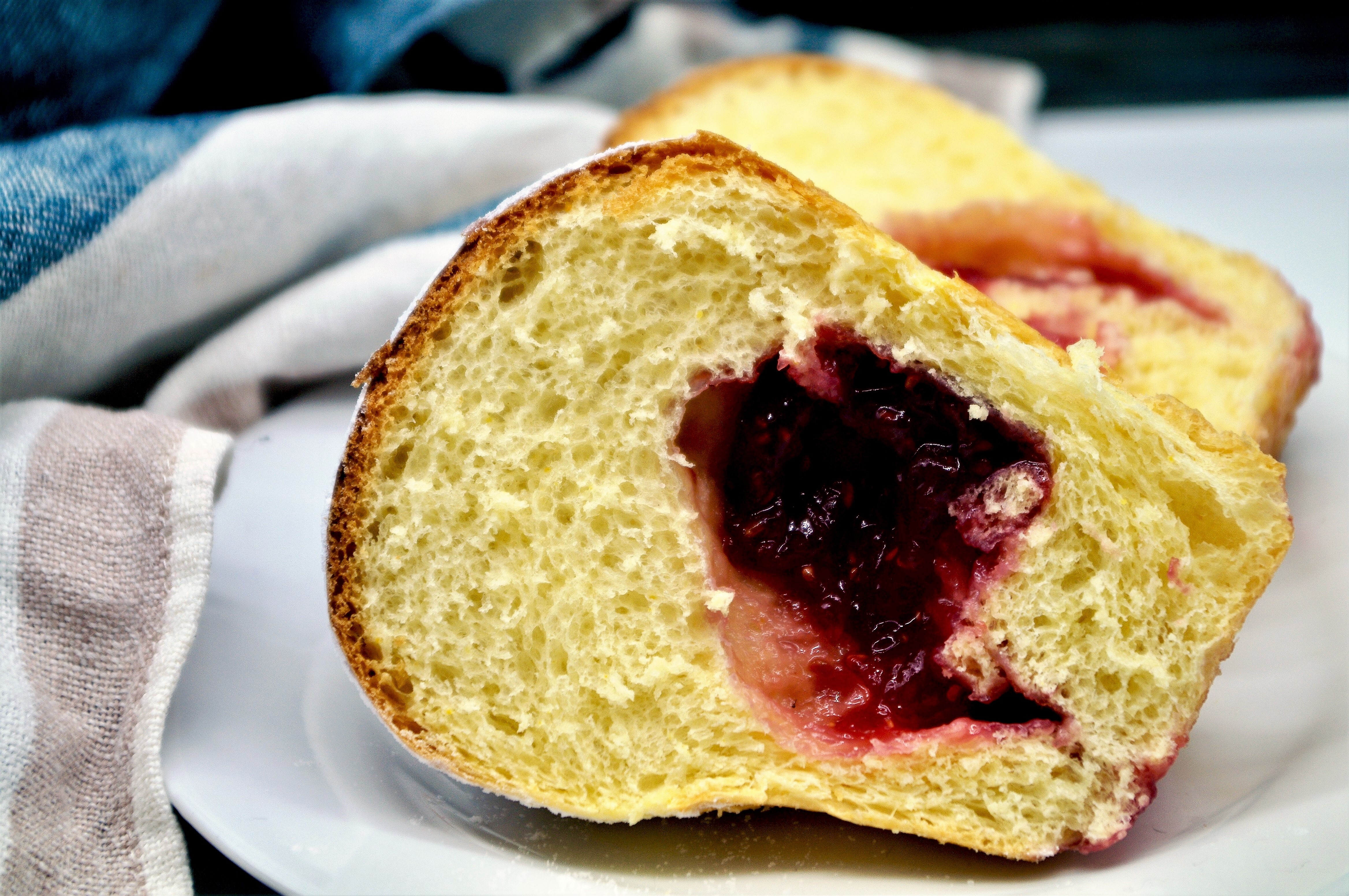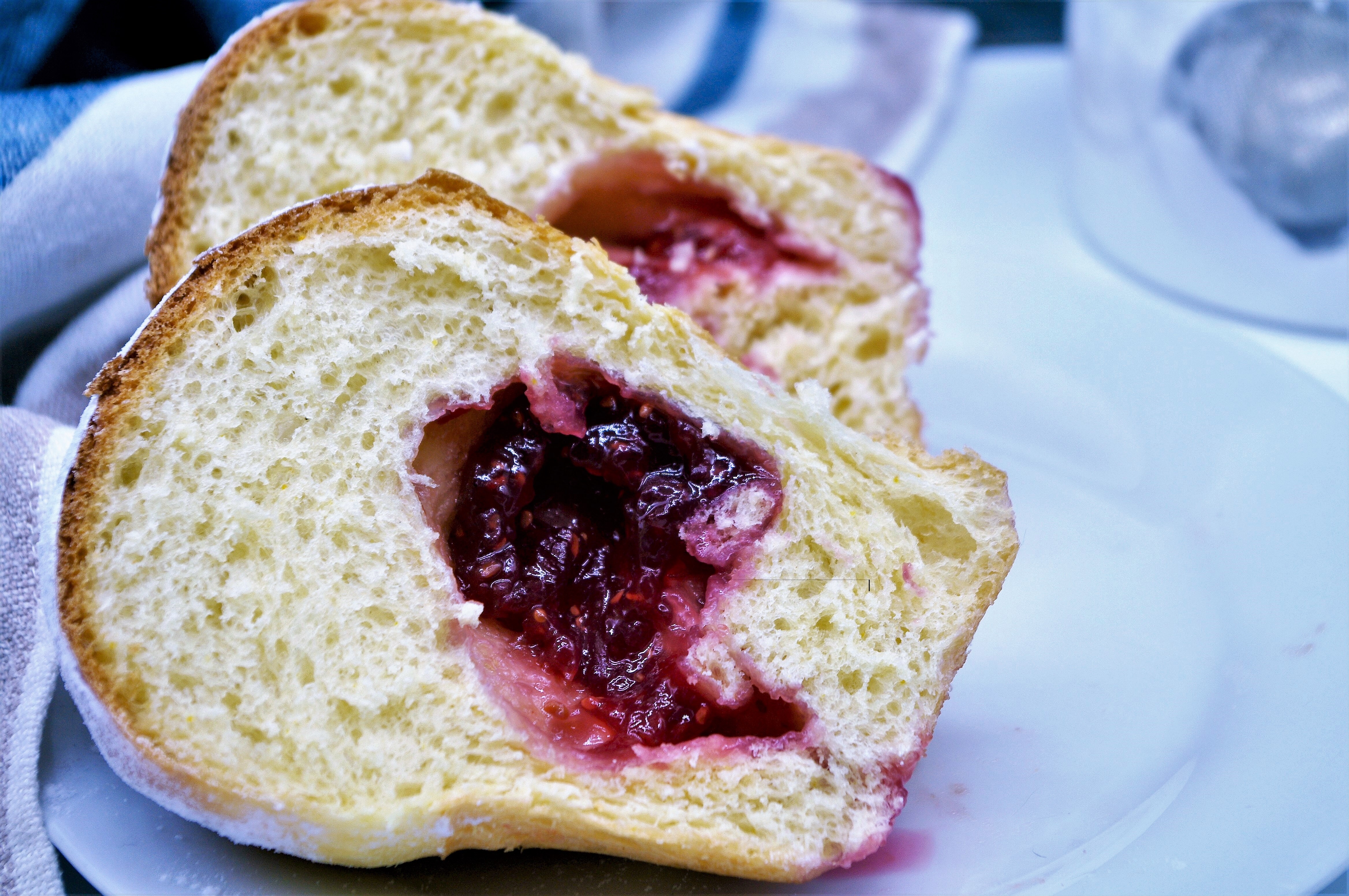 Stendere l’impasto, che sarà ben lievitato, su un piano infarinato allo spessore di 1 cm: ritagliare tanti cerchi con un coppapasta da 8cm di diametro (io ne ho ottenuti 12, più un altro leggermente più grande che ho messo in uno stampino da tortina e cotto singolarmente). Disporre al centro del cerchio un cucchiaino abbondante di marmellata, chiudere i cerchi formando una pallina col ripieno ben chiuso. Disporre le palline ottenute, con la chiusura verso il basso e lasciando dello spazio fra l’una e l’altra, nella pirofila ricoperta di carta forno, coprire con pellicola e far lievitare 1h in luogo tiepido. Spennellare con latte la superficie (le palline si saranno unite, lievitando) e cuocere in forno statico preriscaldato a 180° per 30′. Sfornare, spostare le palline su una gratella (aiutandosi con i lembi di carta forno) e far raffreddare prima di servire, con un’abbondante spolverata di zucchero a velo). ENJOY!