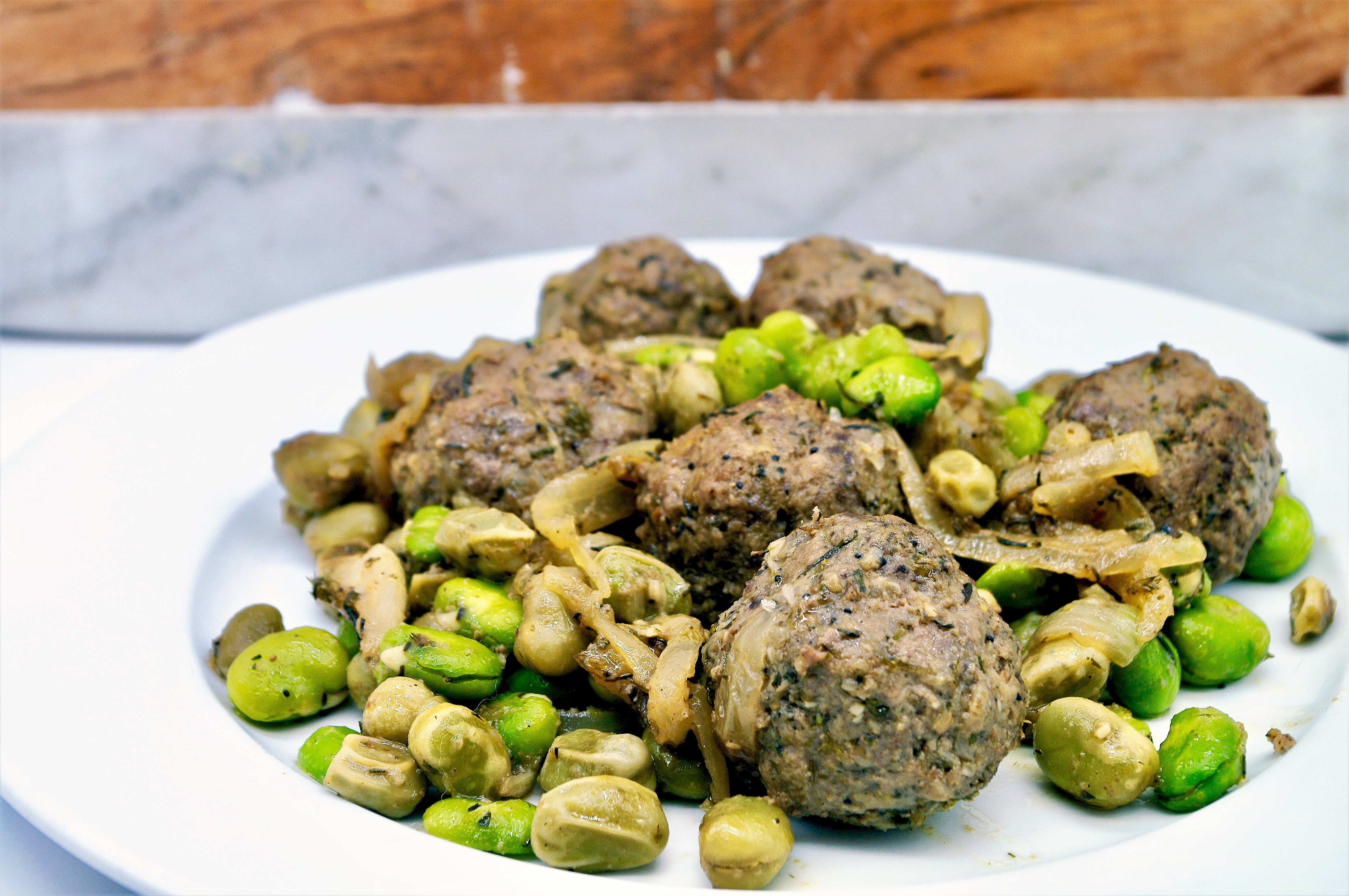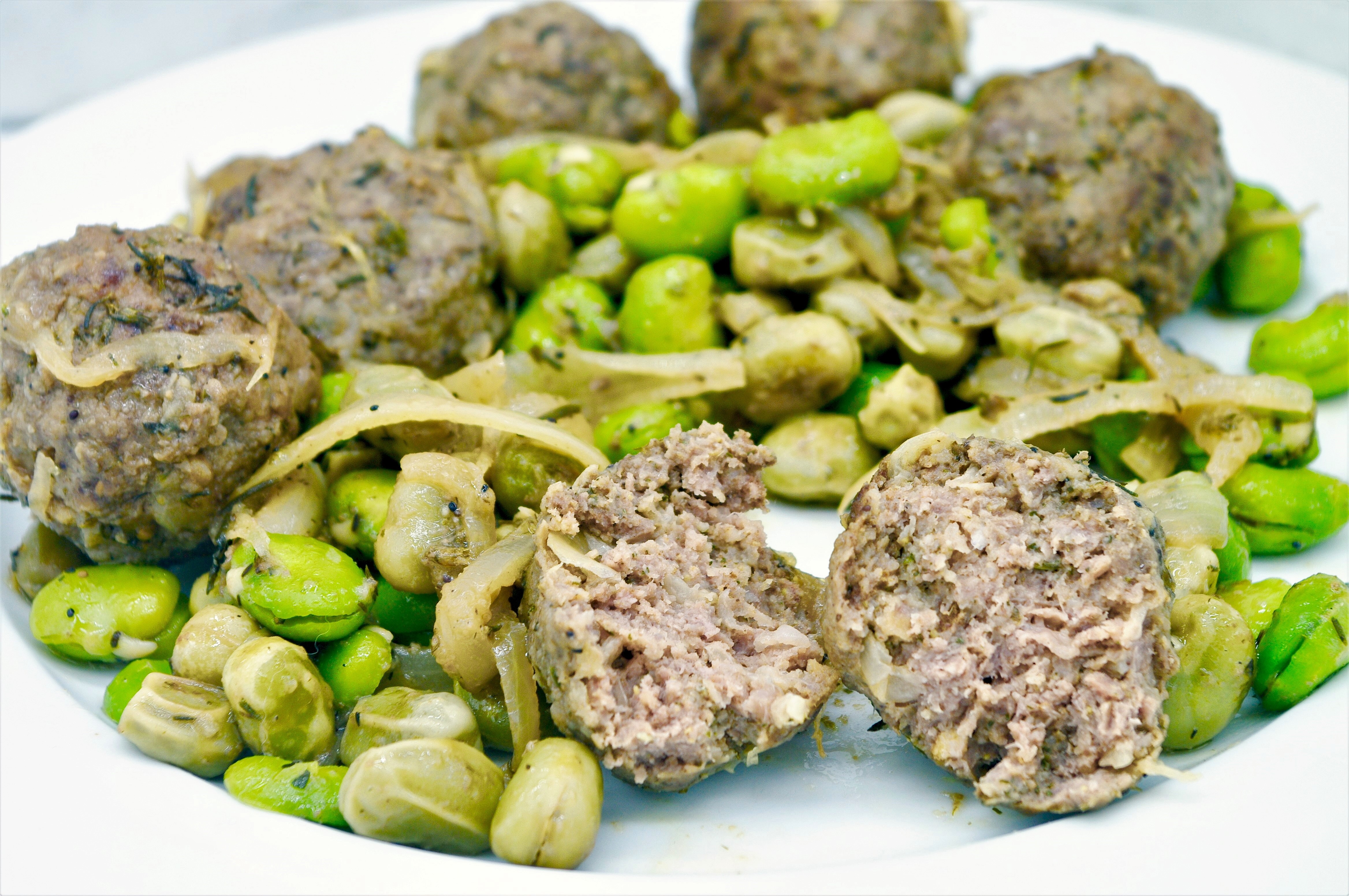 For the seasoning: cook broad beans for 2′ in boiling water, drain and peel about half of them. In a large non-stick pan put oil, onion cut into thin slices, minced garlic, thyme, unpeeled broad beans and cook for 10′ on high heat. Add lemon juice and meatballs and brown them well on all sides. Add a few ladles of broth, cover the pan with the lid and cook for 20′ on very low heat. Uncover, cook for a few minutes if the sauce is still liquid, add peeled broad beans and mix well. Serve hot, perhaps with a delicious freshly baked focaccia bread. ENJOY!