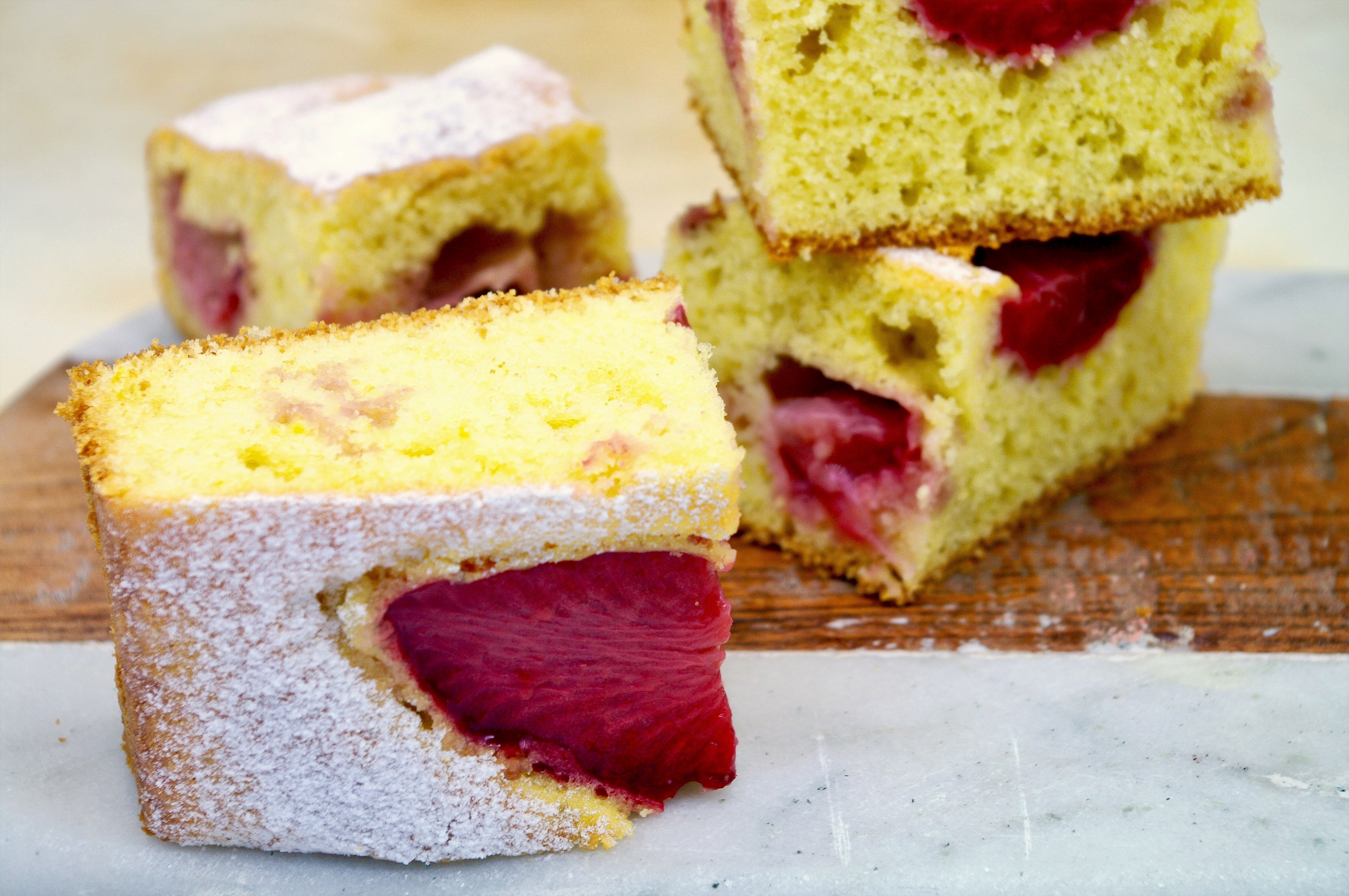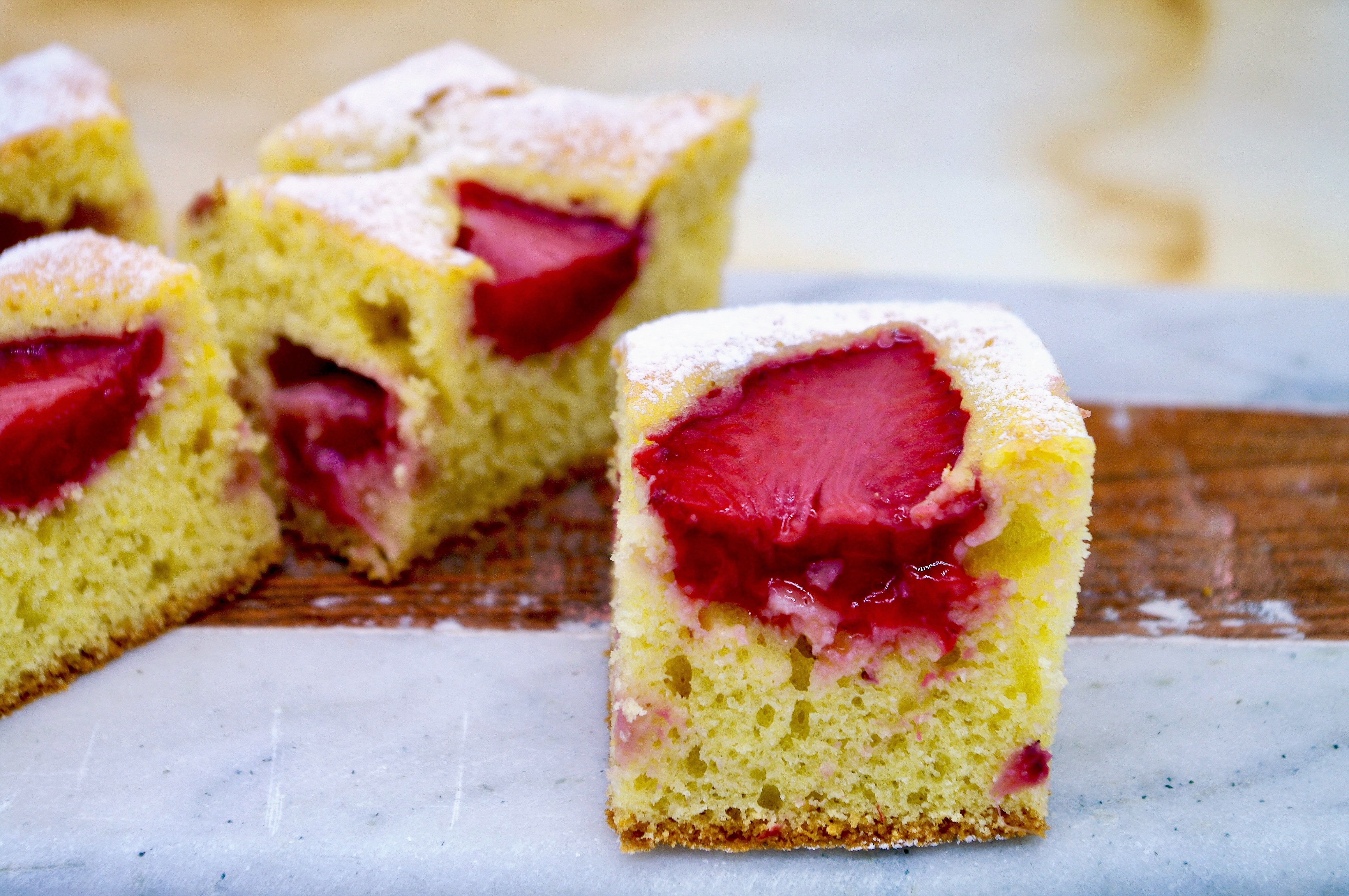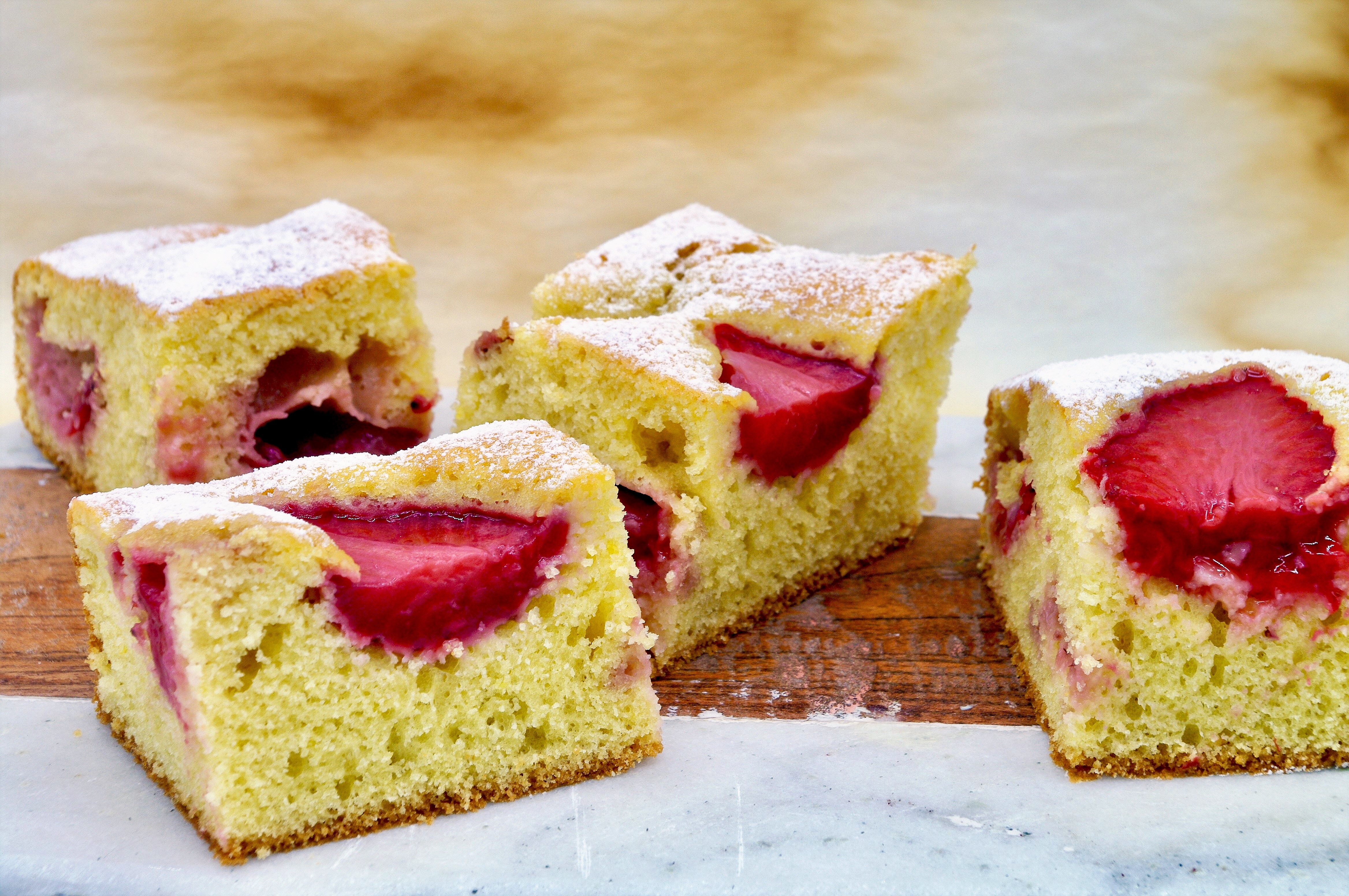 La verità è che i dolci moderni saranno anche fashion, ma spesso la bontà assoluta la si ritrova nelle torte più semplici, che sanno di casa. Scorrendo a caso fra siti di cucina, ho visto una foto di una tortina simile, e mi ha ingolosita tantissimo, quindi l’ho riprodotta con un impasto diverso, che conservo da anni nel mio ricettario. Il risultato è una torta che non solo è bellissima da vedere, ma anche VELOCISSIMA, FACILISSIMA, SOFFICISSIMA. Si prepara in forse 5′, inclusi pesare gli ingredienti ed imburrare la teglia. Io ho usato delle fragole fresche, ma potete usare tutta la frutta che preferite, come mirtilli, lamponi, pere, mele, prugne, pesche e albicocche. Tagliata a quadrotti (ultimamente ho la fissa delle torte quadrate) è perfetta per il dolcetto dell’ultimo minuto, per buffet, compleanni, picnic, facile da trasportare e da conservare. Correte a farla, per festeggiare non solo le donne, ma anche tutti gli altri.