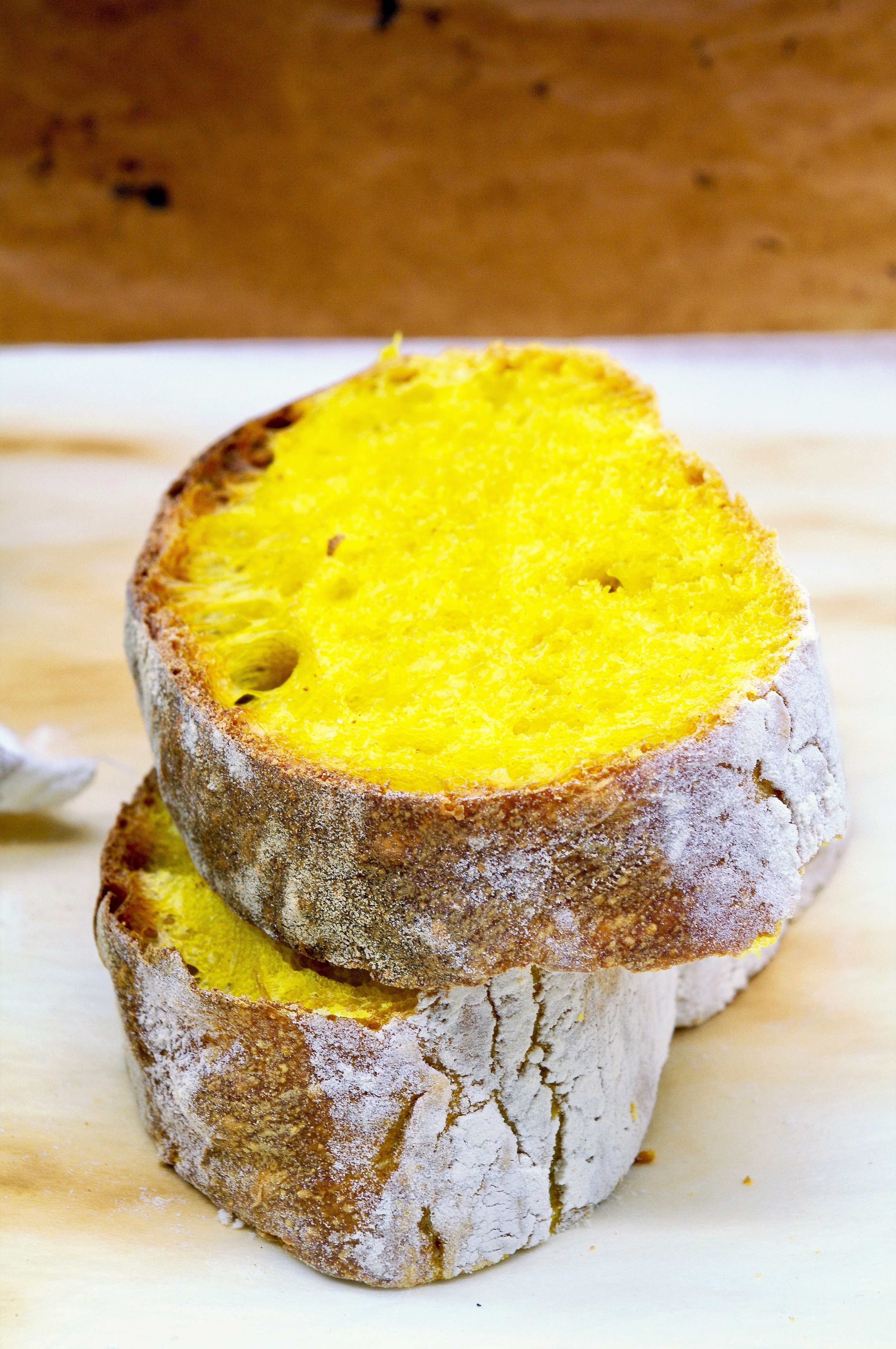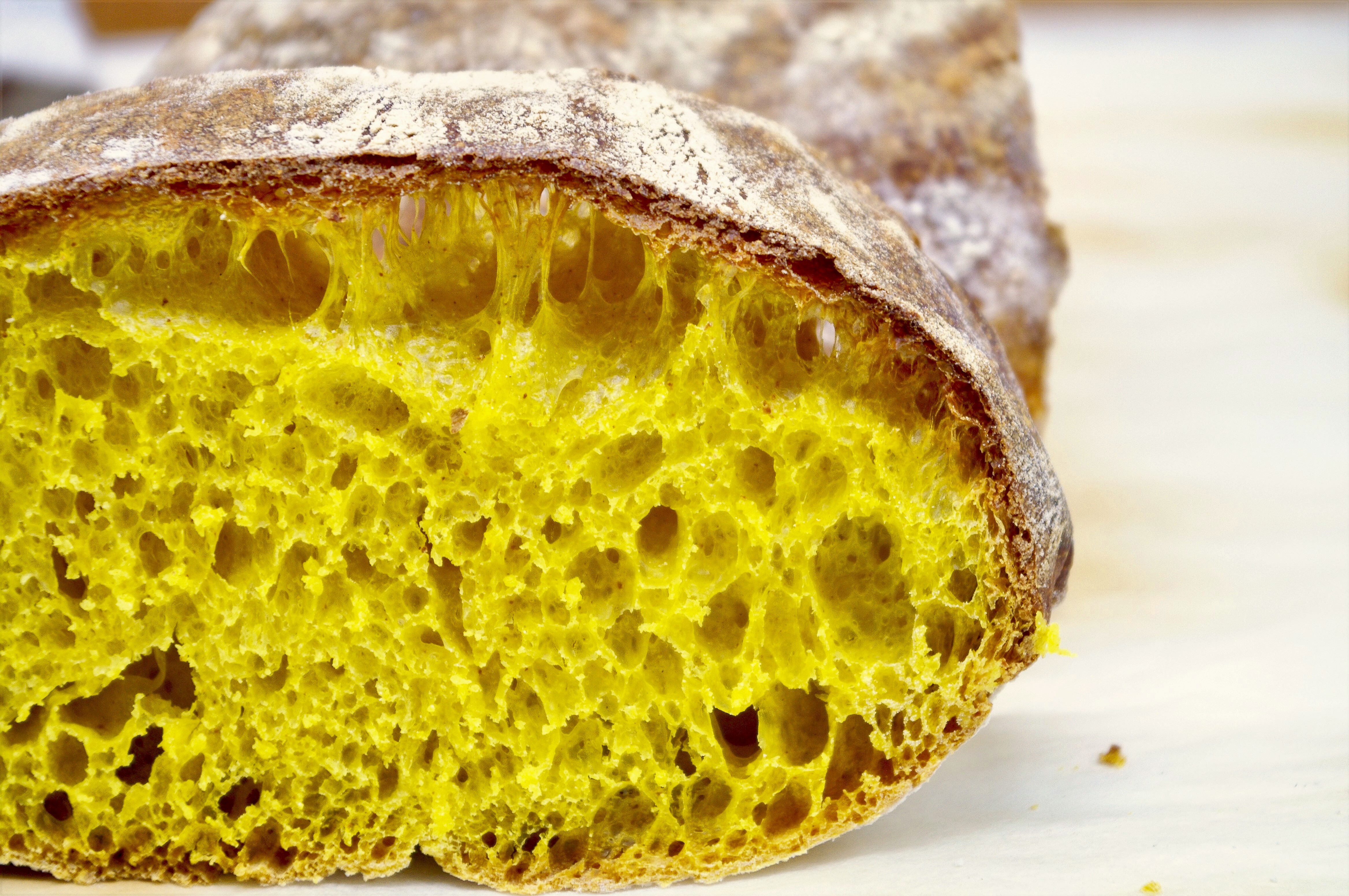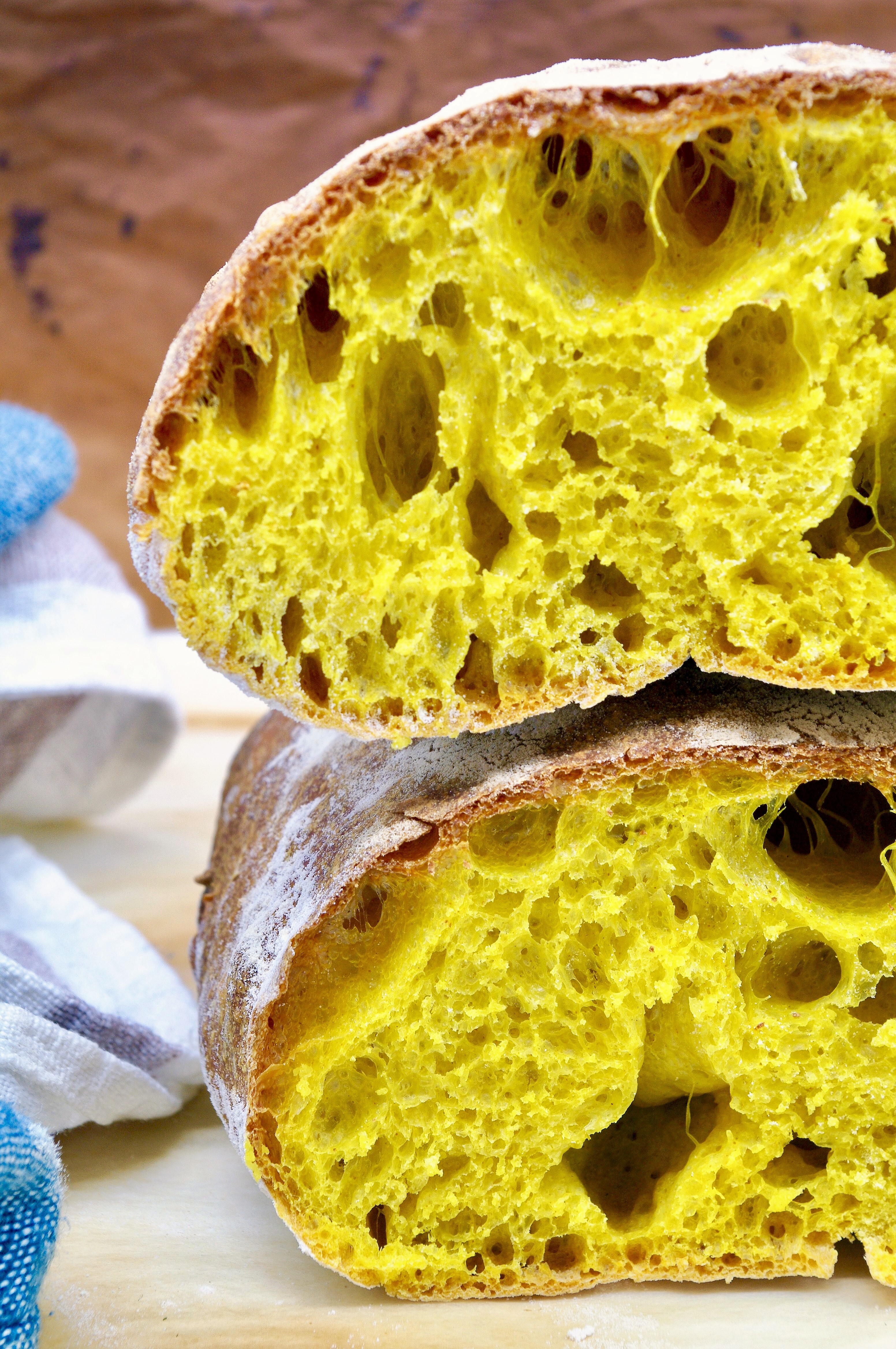 Non di solo pane… ma a volte anche sì! Specialmente se è FACILISSIMO, da sfornare in giornata, ben alveolato, scrocchiarello fuori e morbidissimo dentro, di un bel colore giallo paglierino. Rientra a pieno titolo nelle ricette minimo sforzo, massima resa, che tanto amo. Ho seguito una ricetta trovata sul sito Agrodolce, ma ho aumentato l’idratazione ed aggiunto qualche grammo di curcuma, perché avevo in mente delle deliziose pagnotte che mangiavo sempre l’estate scorsa, come premio dopo ogni gara di corsa, abbondantemente farcite da burro dell’Alto Adige e marmellata fatta in casa. Se la cucina è ricordi e tradizioni, il pane lo è ancora di più.