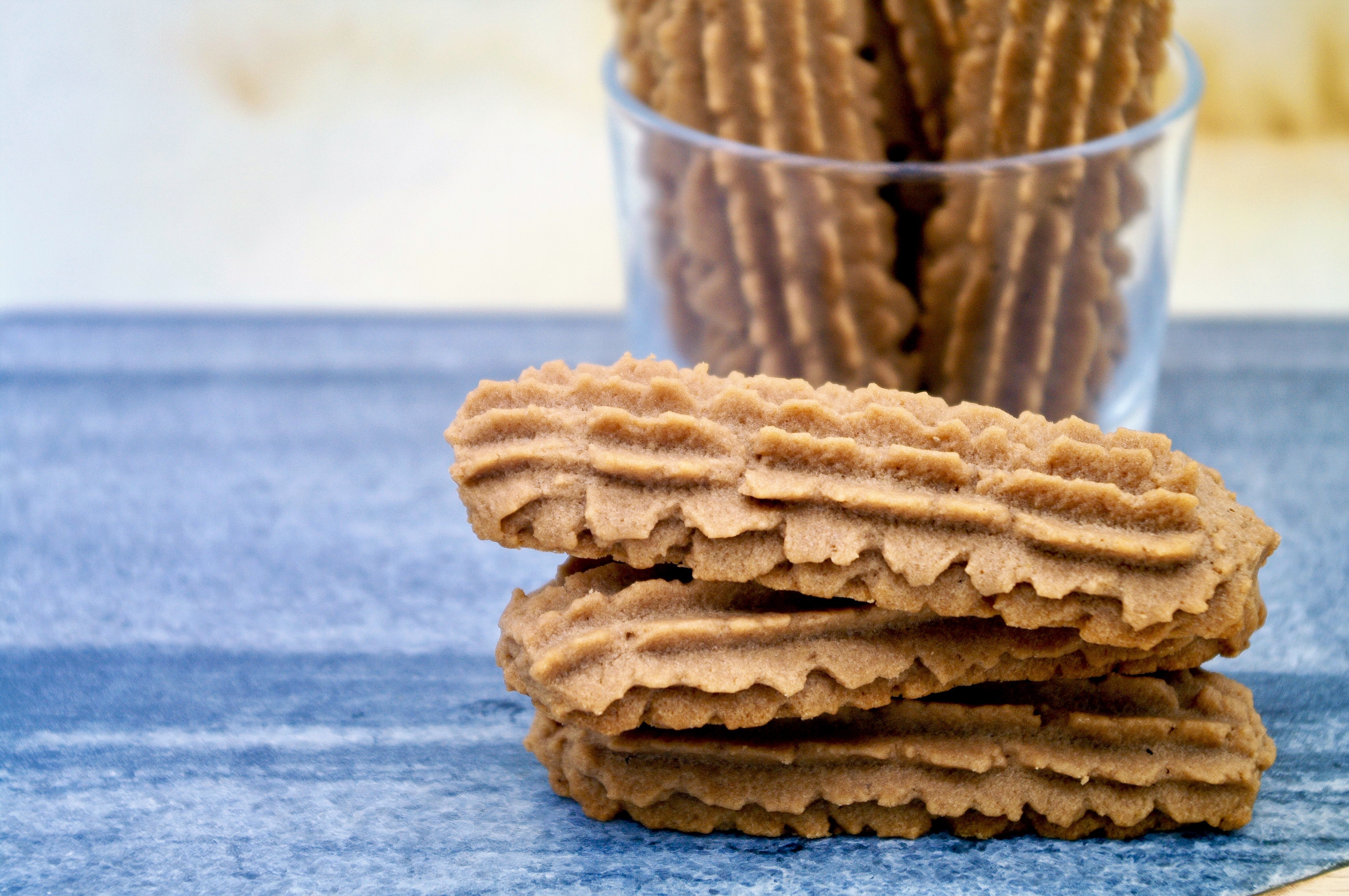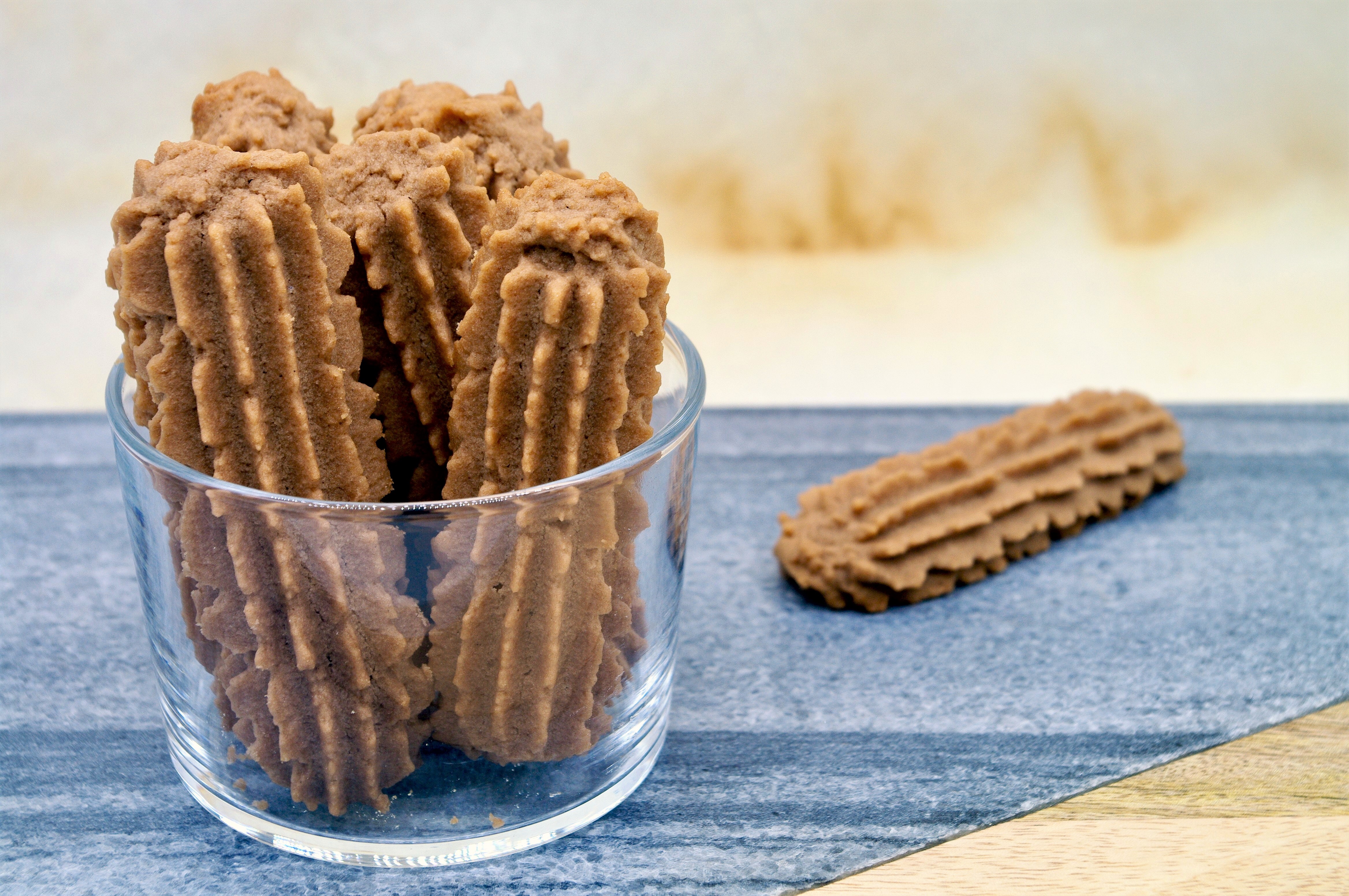 Ultimamente sono fissata con le frolle montate. Dopo averle evitate come la peste per anni, per il terrore che i biscotti perdessero la forma in cottura, mi ci sono riavvicinata a piccoli passi, dopo aver letto delle informazioni tecniche di Iginio Massari in merito. Adesso che sento di padroneggiarle discretamente, mi ci sono buttata a capofitto, con estrema ossessione e compulsione, come sono sempre solita fare prima di disinteressarmene completamente. Dopo la volta dei biscotti di frolla montata, di quelli di frolla montata all’olio, di quelli con farina di mais, era senza dubbio tempo di quelli in versione scura. Sono friabilissimi, si sciolgono letteralmente in bocca: parola mia e dei bambini cui li ho portati. Ho scelto di utilizzare una bassissima quantità di cacao amaro, ma potete aumentarla di qualche grammo, sottraendo il peso aggiunto in più da quello della farina. Inoltre ho usato una bocchetta della sac à poche più grande di come andrebbe, perché a me le tradizioni piacciono relativamente.