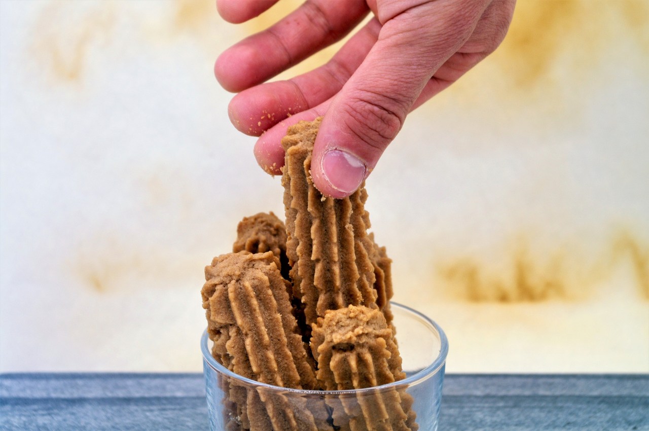 Ultimamente sono fissata con le frolle montate. Dopo averle evitate come la peste per anni, per il terrore che i biscotti perdessero la forma in cottura, mi ci sono riavvicinata a piccoli passi, dopo aver letto delle informazioni tecniche di Iginio Massari in merito. Adesso che sento di padroneggiarle discretamente, mi ci sono buttata a capofitto, con estrema ossessione e compulsione, come sono sempre solita fare prima di disinteressarmene completamente. Dopo la volta dei biscotti di frolla montata, di quelli di frolla montata all’olio, di quelli con farina di mais, era senza dubbio tempo di quelli in versione scura. Sono friabilissimi, si sciolgono letteralmente in bocca: parola mia e dei bambini cui li ho portati. Ho scelto di utilizzare una bassissima quantità di cacao amaro, ma potete aumentarla di qualche grammo, sottraendo il peso aggiunto in più da quello della farina. Inoltre ho usato una bocchetta della sac à poche più grande di come andrebbe, perché a me le tradizioni piacciono relativamente.