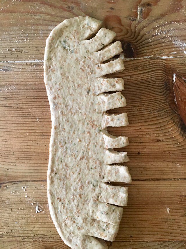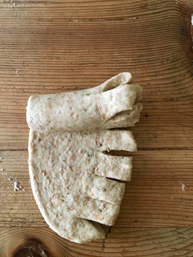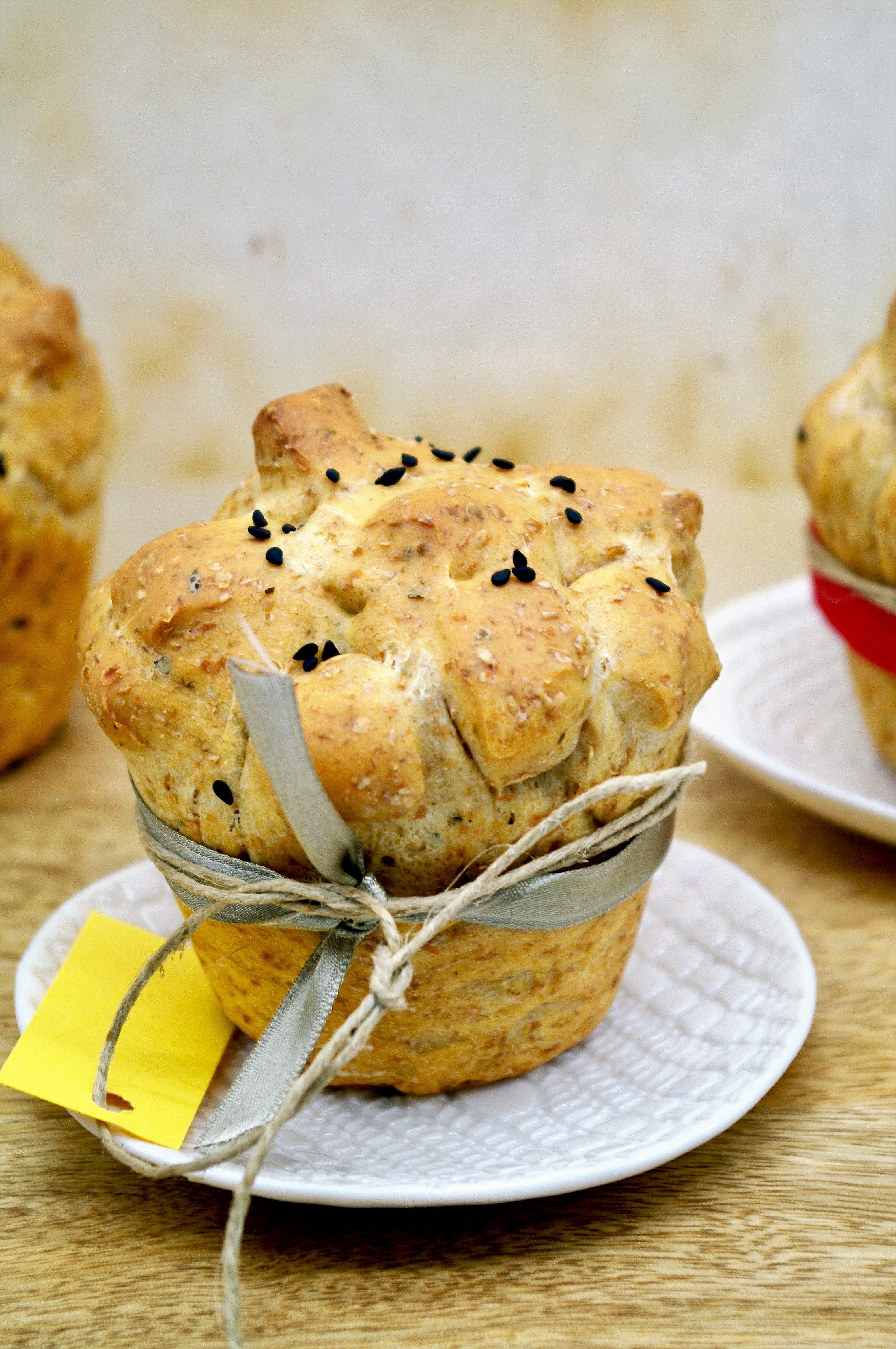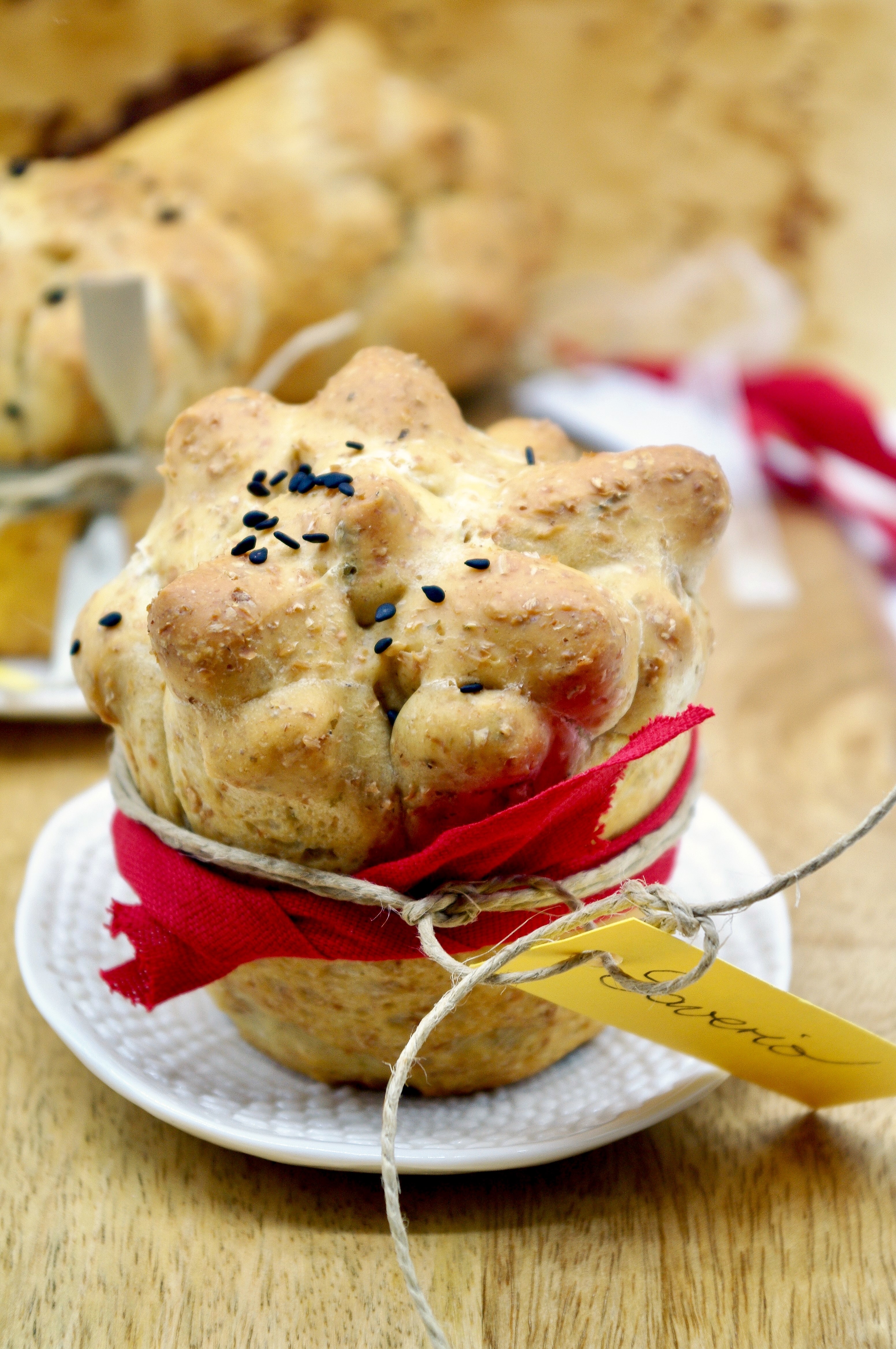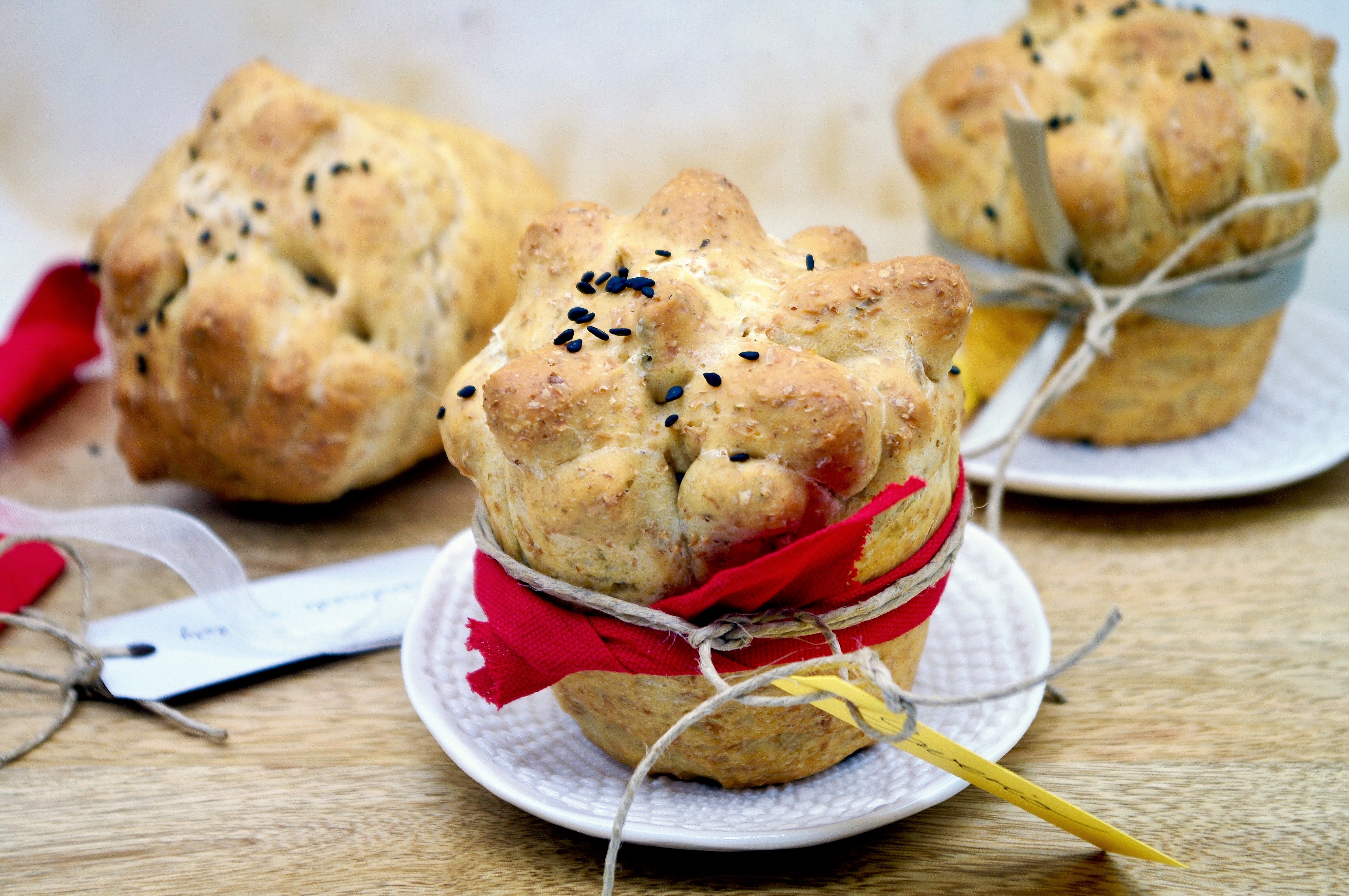 The next day deflate the dough, weigh it and make 8 portions of about 50g each. Roll out each portion with a rolling pin, on a floured surface, in a long, narrow rectangle: with a pair of scissors cut a long side of the rectangle all around, about every 1.5 cm. Roll each rectangle on itself, forming a roll (see photos above). Place each roll in muffin molds, with the notched side on the surface, and sprinkle with black sesame seeds, if you like them. Cover with plastic wrap and let rise for 1h in a warm place. Bake in the preheated static oven at 190° for 20-25′: loaves will be golden brown. Remove from the molds and let cool before serving, with ribbons and cards to your taste. ENJOY!