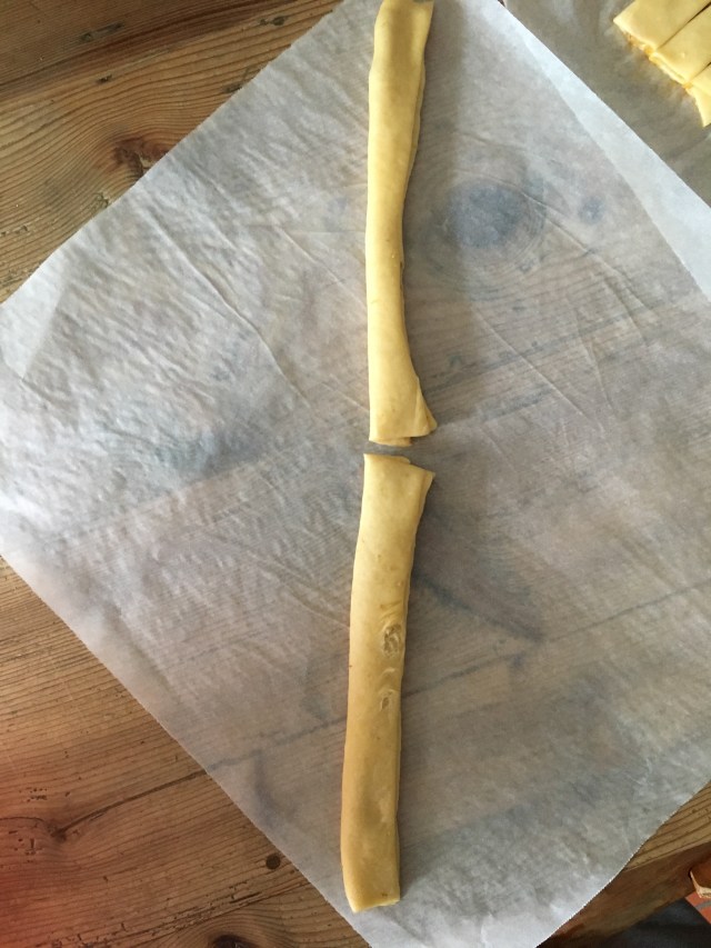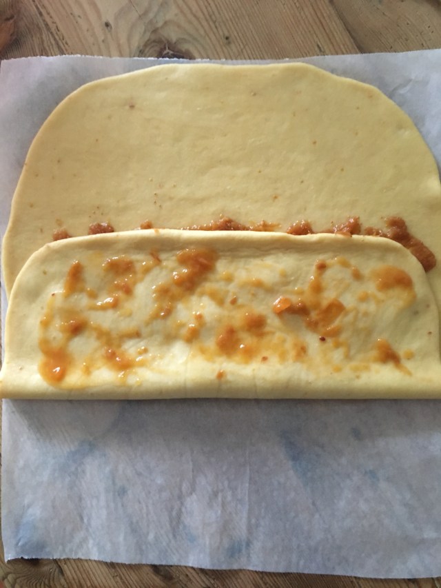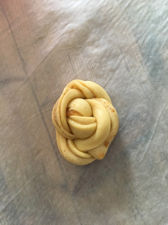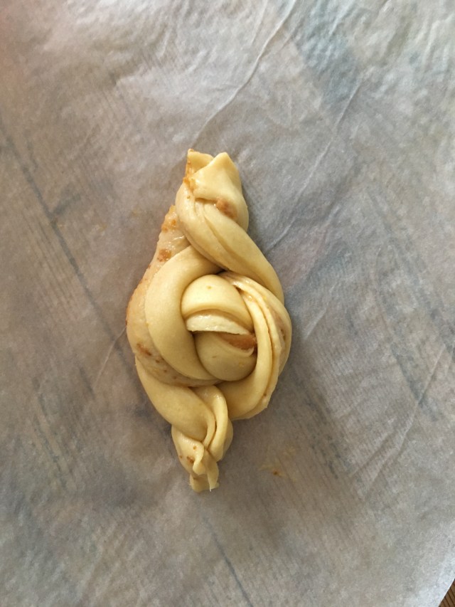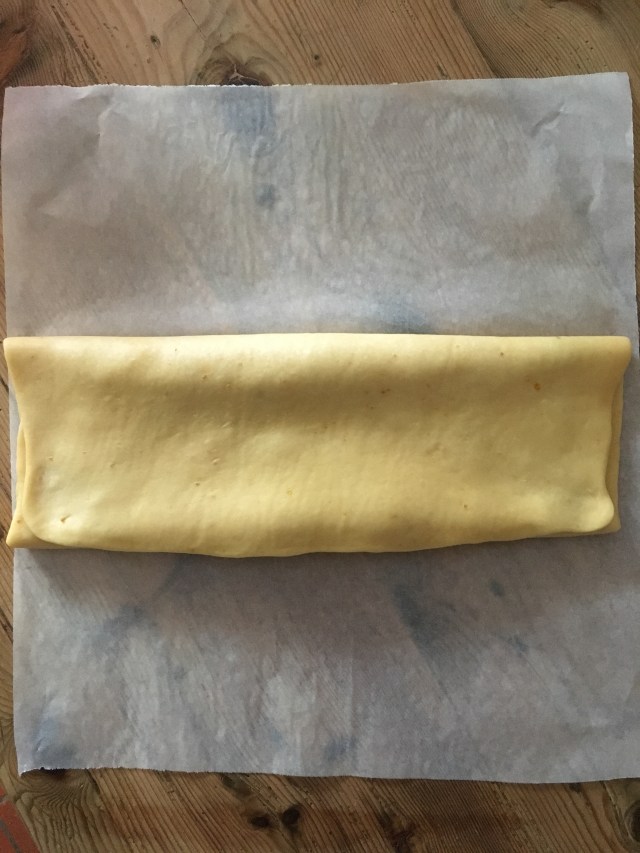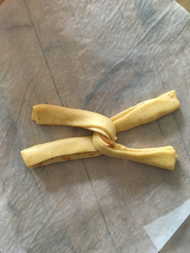 Dopo la lievitazione, sgonfiare l’impasto e stenderlo col mattarello sul piano infarinato in un rettangolo dello spessore di 4mm. Disporre la confettura / crema di nocciole sul terzo medio, come si vede in foto. Ripiegare il lembo inferiore su quello centrale, spalmare anch’esso con la confettura e ripiegarci sopra il lembo superiore. Girare il rettangolo ottenuto di 90° e stenderlo nuovamente col mattarello per ottenere un rettangolo più esteso. Con un taglia pizza, o un coltello affilato, tagliare il rettangolo in 8 striscioline, per il senso della lunghezza. Ogni strisciolina andrà divisa in due e con le due parti si procede all’intreccio, come mostrato nelle foto. Si procede così per tutte le 8 striscioline (diventate 16 dopo l’ultimo taglio).