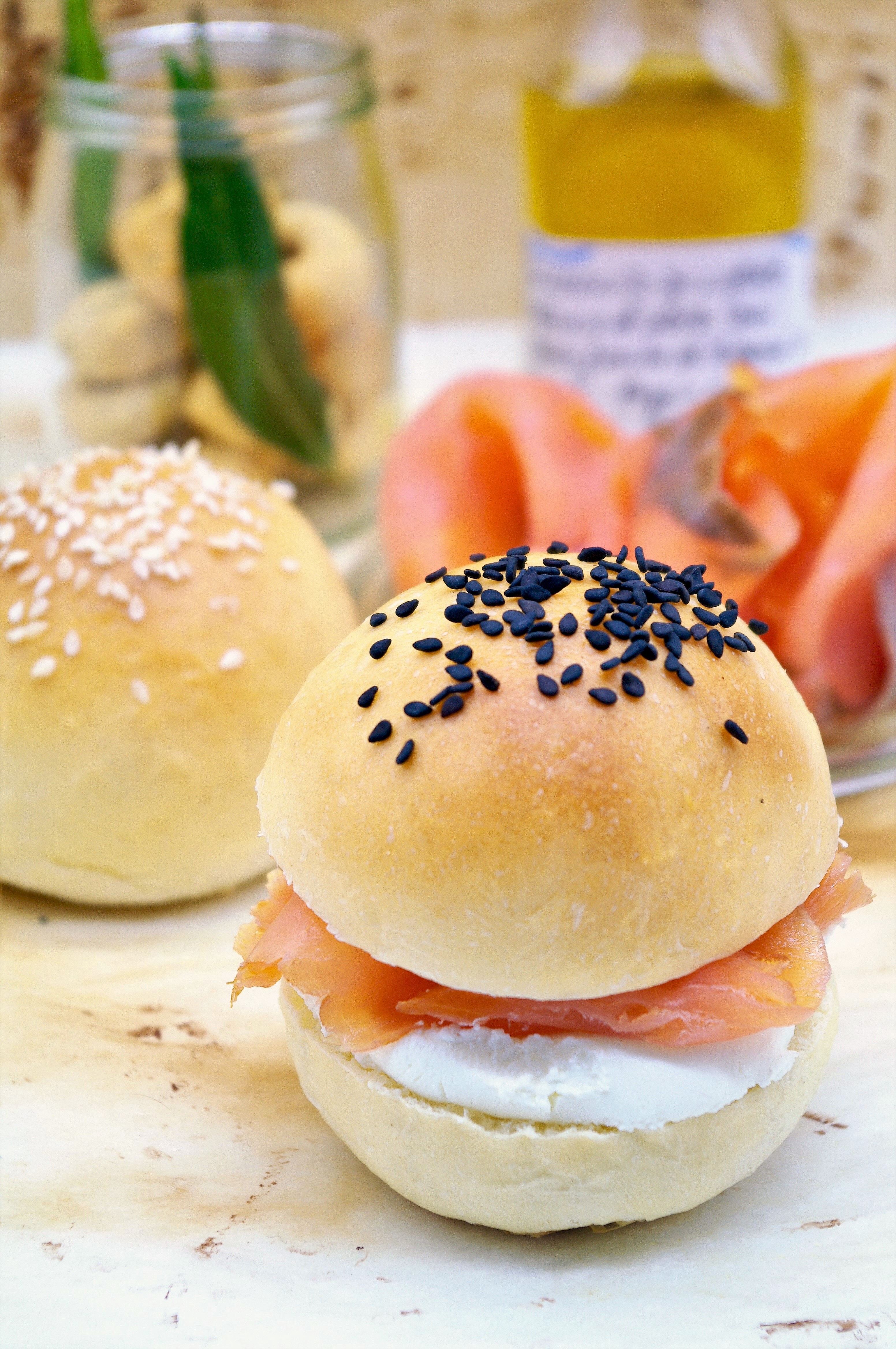 Spennellare la superficie dei panini con un goccio di latte e guarnire (se piace) con i semini. Cuocere una teglia alla volta in forno statico preriscaldato a 200° per 10-12′: i panini devono essere dorati in superficie, ma restare chiari. Far raffreddare bene su una gratella prima di farcire e servire. ENJOY!
