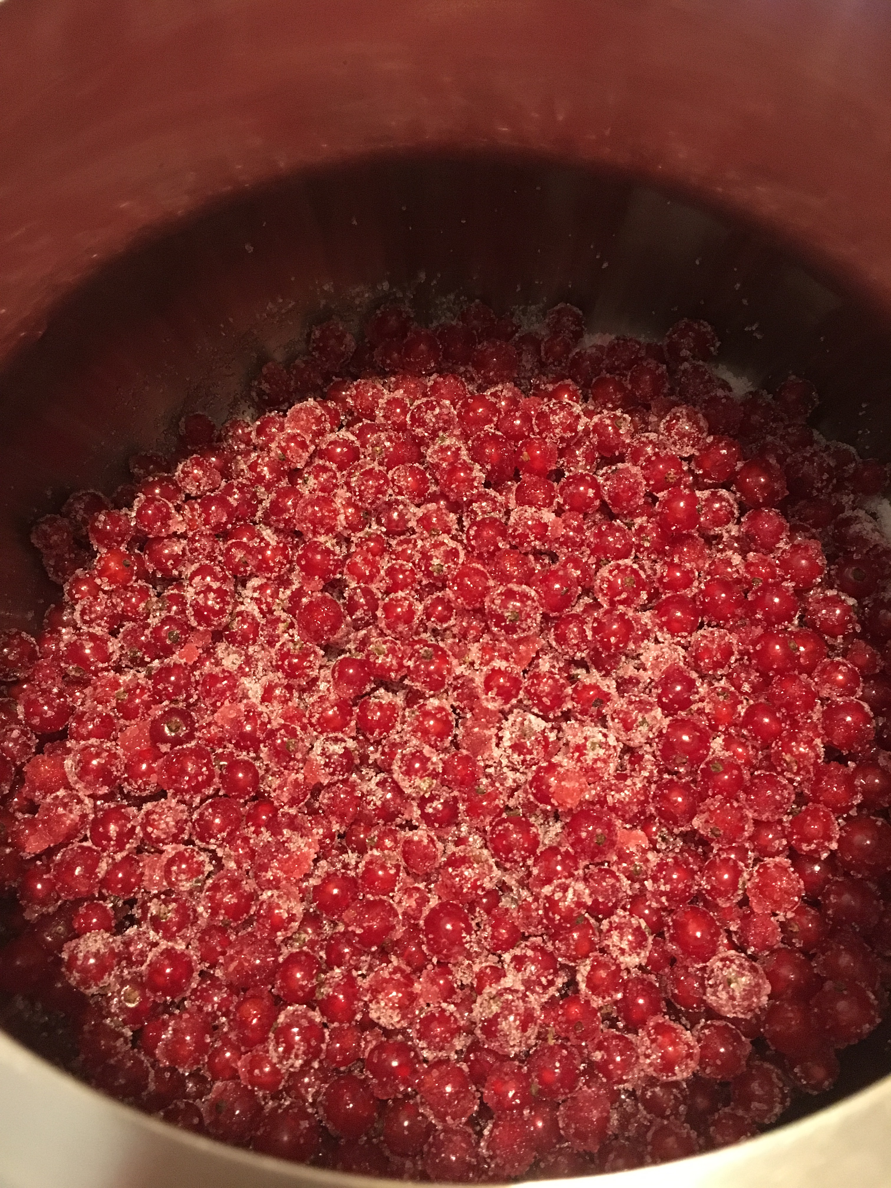 Porre la pentola sul fuoco e portare a bollore, senza coperchio, su fuoco dolcissimo, mescolando di tanto in tanto con un cucchiaio di legno. A partire dal bollore, cuocere fino a che il liquido non si sarà un po’ addensato, senza essere sodo: la consistenza ottimale si ottiene nel raffreddamento, quindi quando è bollente l’aspetto deve essere ancora bello fluido. In totale io cuocio per 30-40′ massimo, compreso il tempo per portare a bollore. Questa confettura non va frullata, perchè i ribes sono molto piccoli e in parte perderanno la forma in cottura, lasciando però una consistenza corposa e piacevolissima al palato.