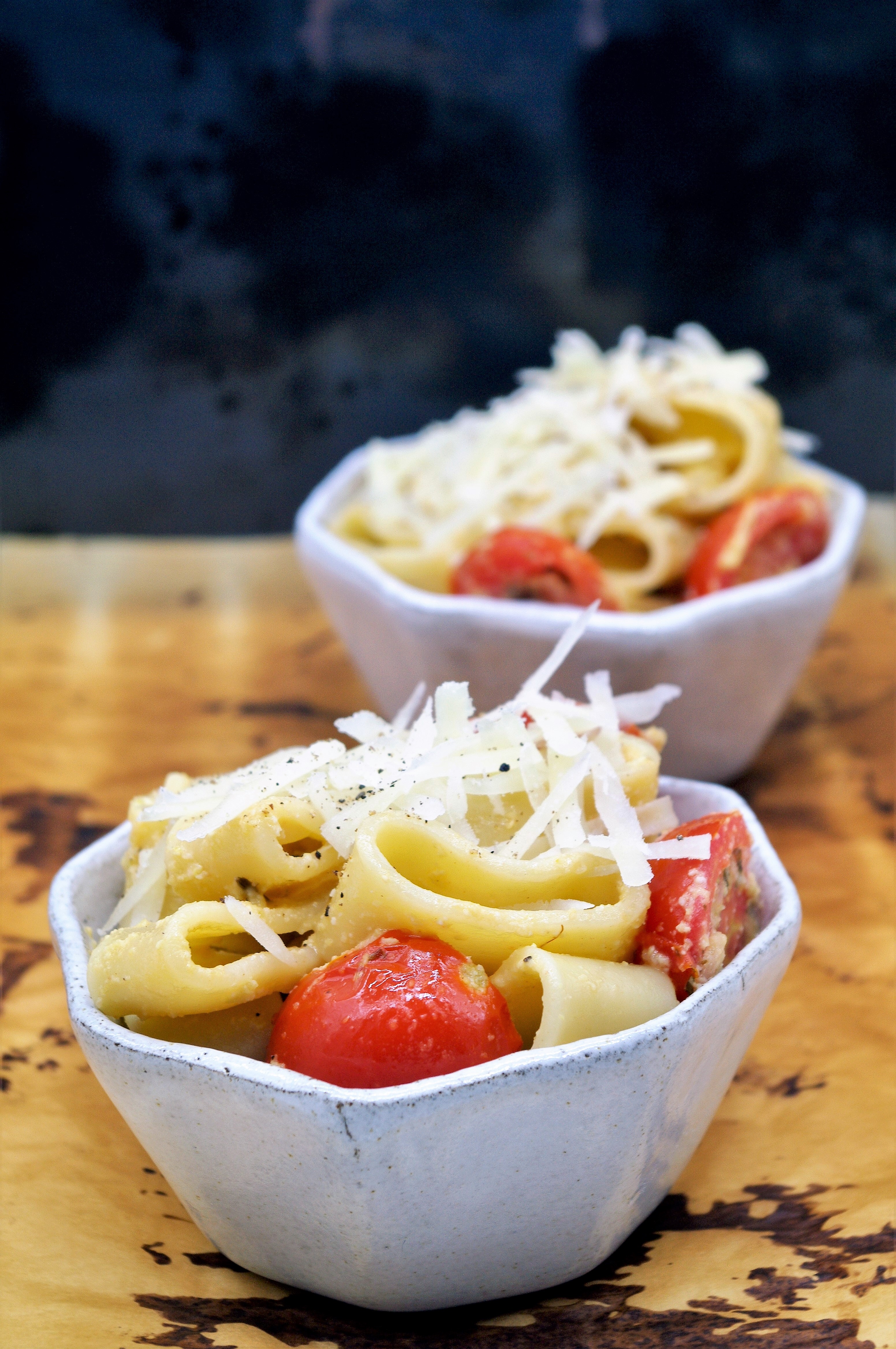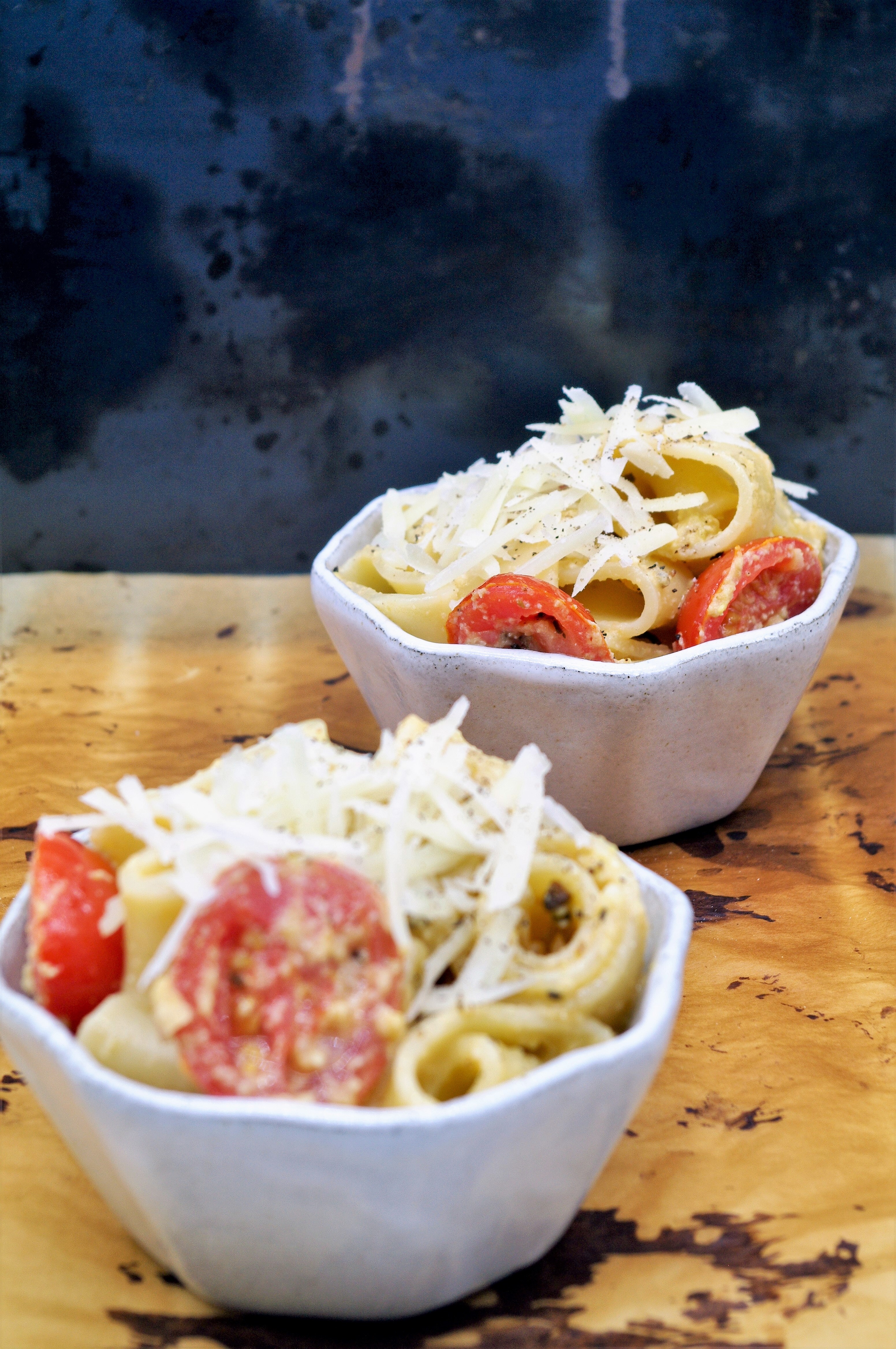 PASTA WITH OLIVE PESTO, CHERRY TOMATOES AND PECORINO ROMANO DOP
