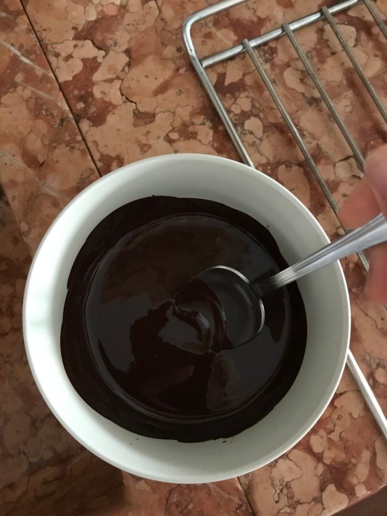 Per la glassa: sciogliere il cioccolato fondente a bagnomaria. Fondere il burro su fuoco dolce. Versare il burro sul cioccolato fuso in 3 volte, mescolando ogni volta a partire dal centro, spostandosi in periferia solo quando si sarà creato un nucleo lucido ed elastico centrale. Ottenuta una glassa uniforme e lucida, farla raffreddare prima di utilizzarla.