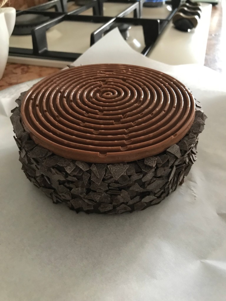 Pour the mousse into the chosen silicone mold (I used the Silikomart Tourbillon mold) which must be slightly smaller in diameter than the cake. Move the mousse in the refrigerator for 1h, then in the freezer for 3h (for convenience you can also do it the previous day).