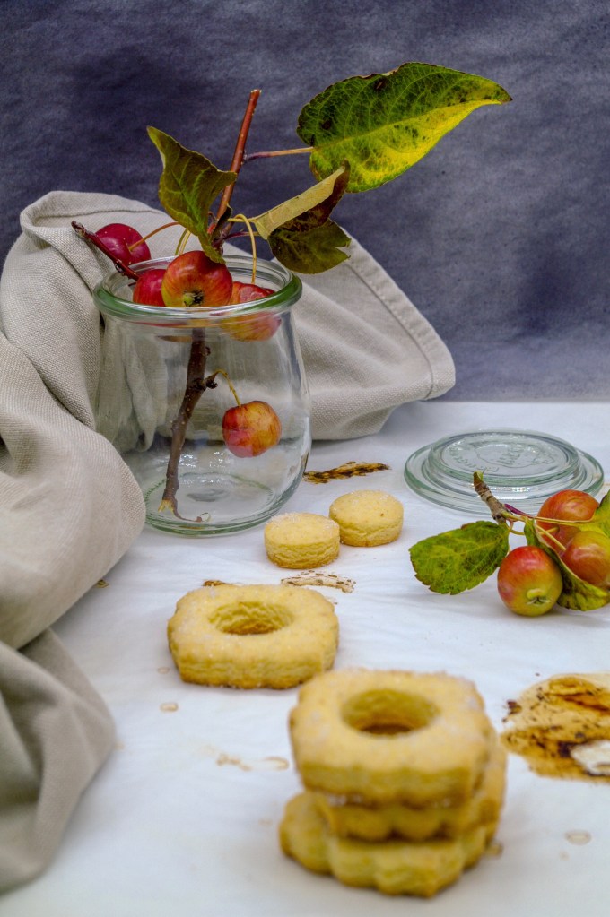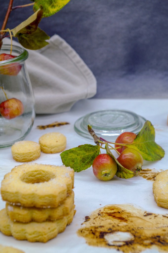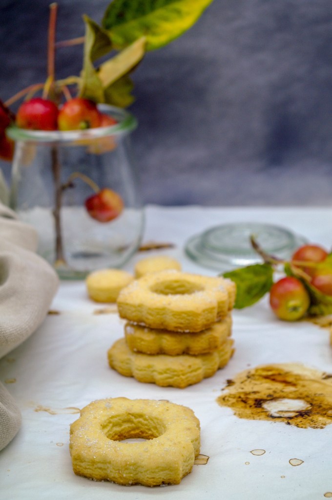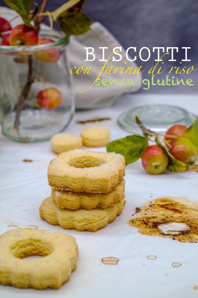 (I biscotti di questa ricetta sono senza glutine, incredibilmente friabili grazie alla farina di riso, ed incredibilmente buoni. Se ve lo steste chiedendo, quei deliziosi fruttini che si vedono in foto sono delle splendide melette autunnali.)