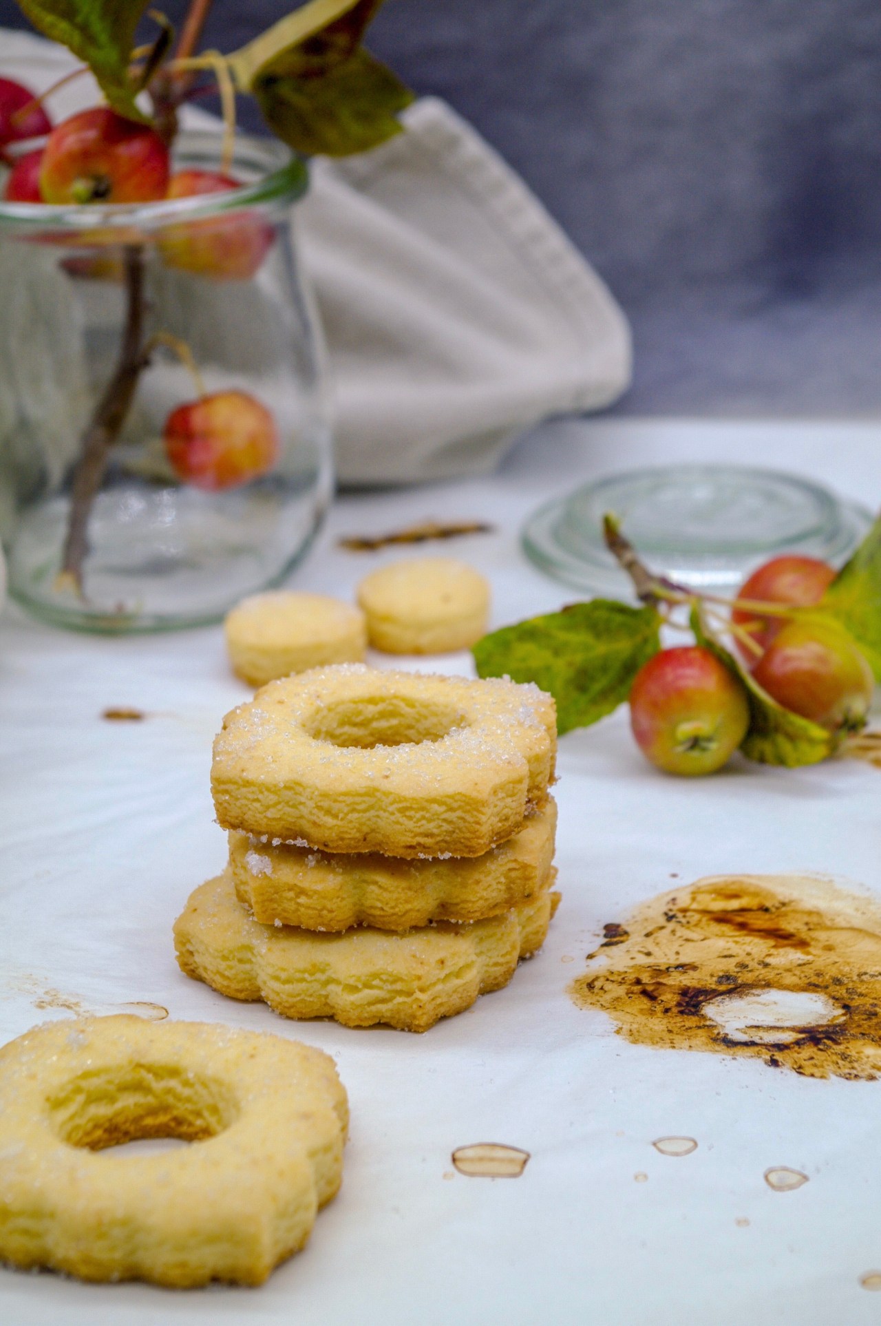 (I biscotti di questa ricetta sono senza glutine, incredibilmente friabili grazie alla farina di riso, ed incredibilmente buoni. Se ve lo steste chiedendo, quei deliziosi fruttini che si vedono in foto sono delle splendide melette autunnali.)