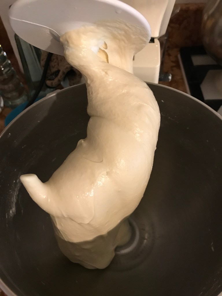 Per l’impasto: nella ciotola della planetaria inserire tutta la biga ben lievitata, malto, lievito e 100g di acqua. Impastare col gancio a bassa velocità fino ad ottenere un impasto liscio ed incordato. Aggiungere la restante acqua (50g) in 3 volte, insieme al sale, impastando ora a media velocità: si deve ottenere un impasto liscio e perfettamente incordato, nonostante l’alta idratazione, con le pareti della ciotola ben pulite. Rovesciare l’impasto in un contenitore ben oliato, quindi coprire con pellicola e far lievitare per 40′.