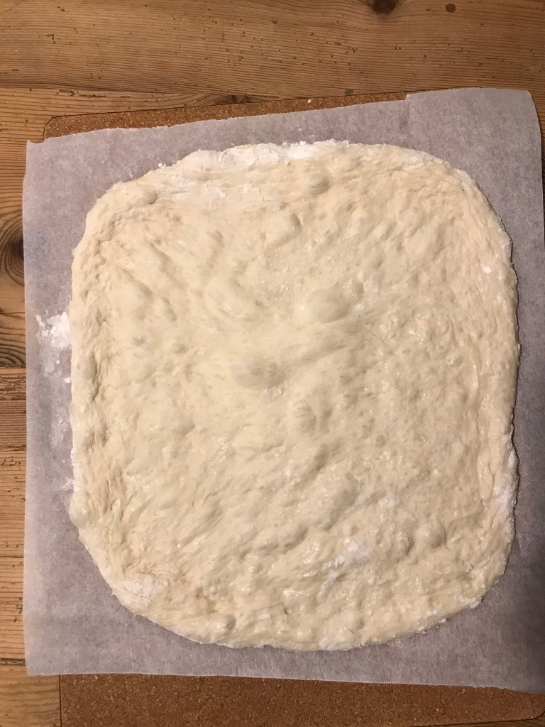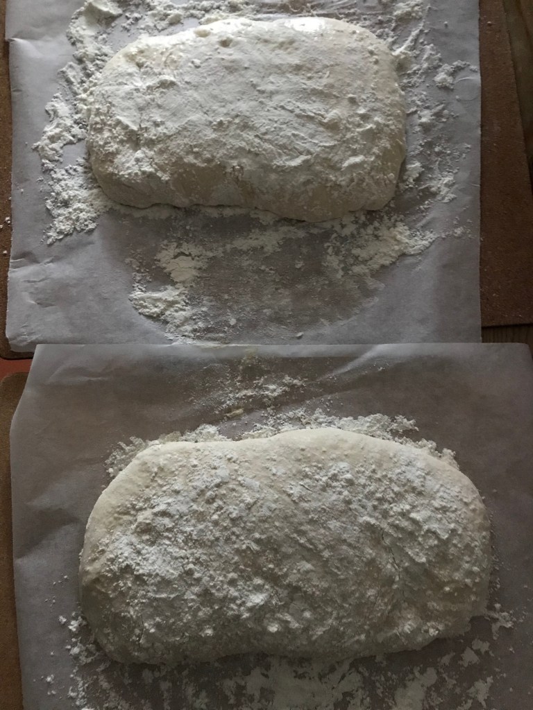 Rovesciare l’impasto sul piano di lavoro BEN INFARINATO, spolverare di farina anche sopra, dividerlo in due pezzi e disporli ben separati, cercando di dar loro una forma rettangolare (io per comodità spolvero con abbondante farina dei fogli di carta forno, su cui disporre i due pezzi). Coprire con pellicola e far riposare altri 40′.
