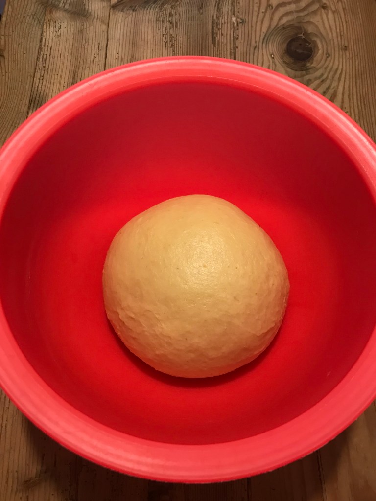 Riprendere l’impasto lievitato, sgonfiarlo e stenderlo col mattarello sul piano di lavoro ben infarinato, in un rettangolo dello spessore di 4mm. Spalmare la farcia su tutta la superficie del rettangolo, quindi piegare una metà impasto sull’altra, premendo sui bordi per farli aderire bene. Con un coltello ben affilato ricavare dei cordoni dal rettangolo ottenuto, tagliando lungo il lato lungo. Ogni cordone va arrotolato su se stesso (come si vede in foto) e poi intrecciato attorno a due dita di una mano, facendo in modo che l’ultima parte vada a posizionarsi perpendicolarmente alle altre (qui trovate un video di come realizzare l’intreccio alla perfezione).