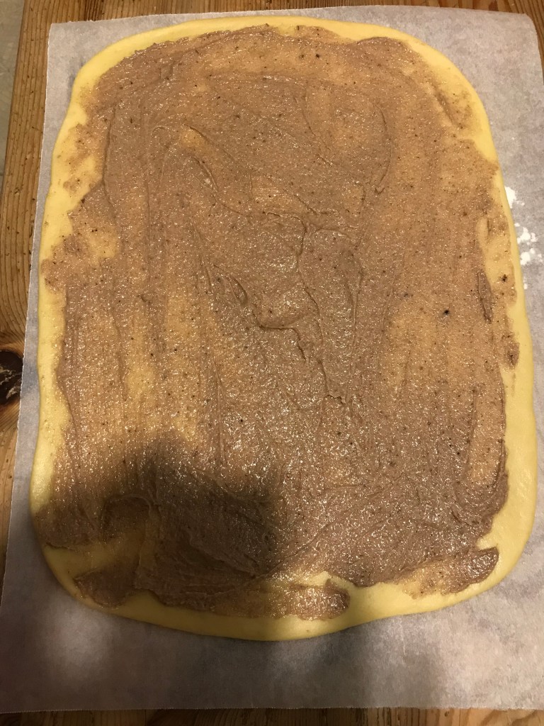 Per la farcitura: lavorare il burro MORBIDO insieme allo zucchero, alla cannella, ai chiodi di garofano ed ai semini di cardamomo (estratti dalla bacca e pestati in un mortaio), appena prima di utilizzarlo per la farcia.