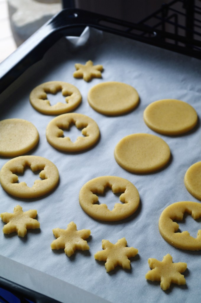Stendere la frolla su una superficie infarinata, allo spessore di 2-3mm (a me piace lasciarla sottile, quindi opto per 2mm). Ritagliare i biscotti col vostro stampino preferito (il mio è tondo, con diametro di 7cm), in numero pari, ricordando di incidere metà dei biscotti con uno stampino più piccolo, per creare un foro centrale (si può usare un piccolo cuore, una stellina oppure un fiocchetto di neve come me).