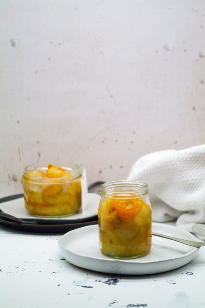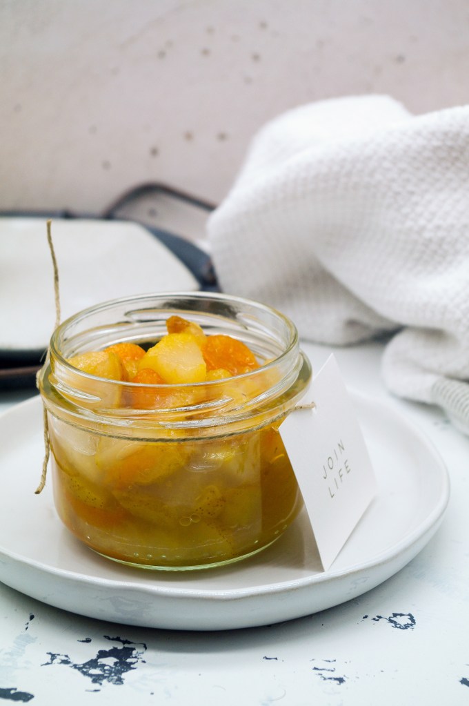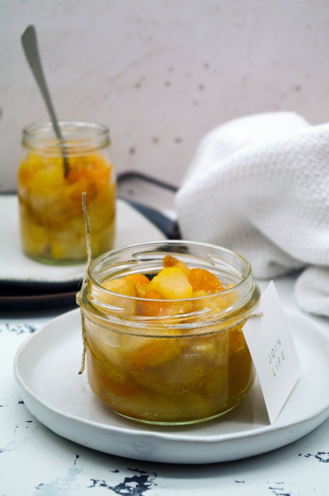 Questa confettura è la sorellina di quella con pere e limoni fatta l’inverno scorso. Eccellenti entrambe, ma quest’ultima ancora più interessante.