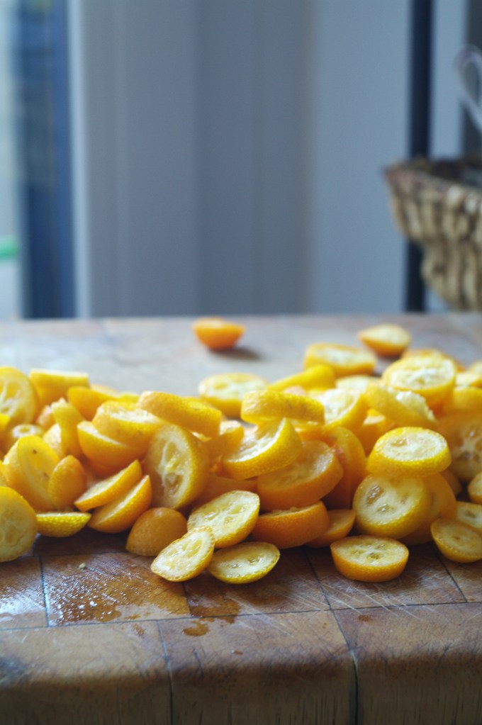 In una pentola capiente inserire acqua e 150g di zucchero e portare a bollore, creando uno sciroppo. Raggiunto il bollore, unire le fettine di kumquat e farle sobbollire a fiamma bassa per 10′. Allontanare dal fuoco, coprire la pentola con un coperchio e lasciar riposare per 24h in luogo freddo (io lo lascio sul balcone).
