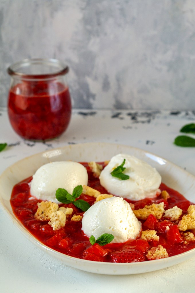 La morbida e delicata mousse di ricotta e yogurt viene arricchita da una composta di fragole e contrastata dalla croccantezza del crumble, in un gioco irresistibile di sapori e consistenze.