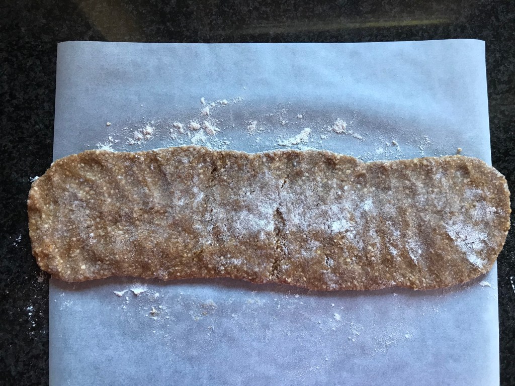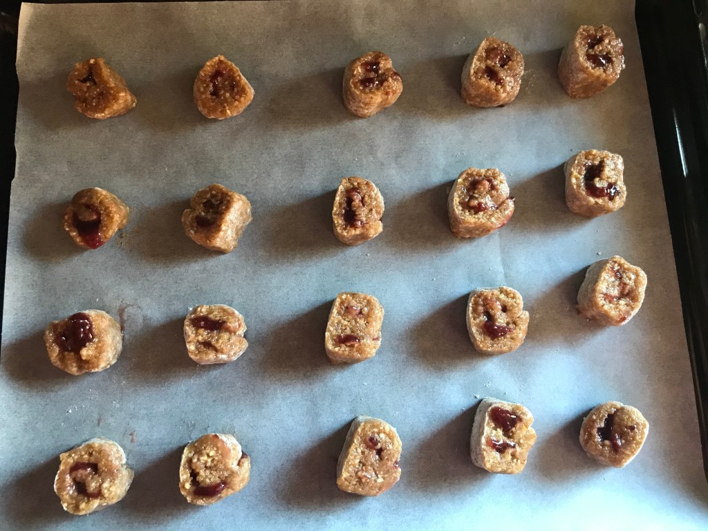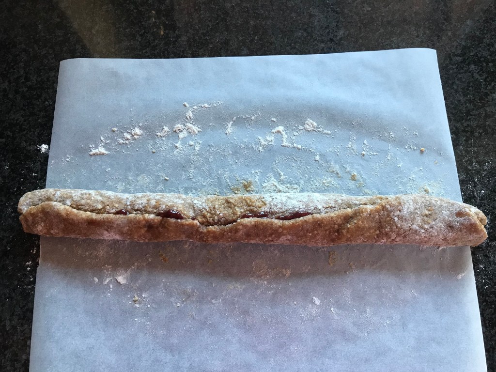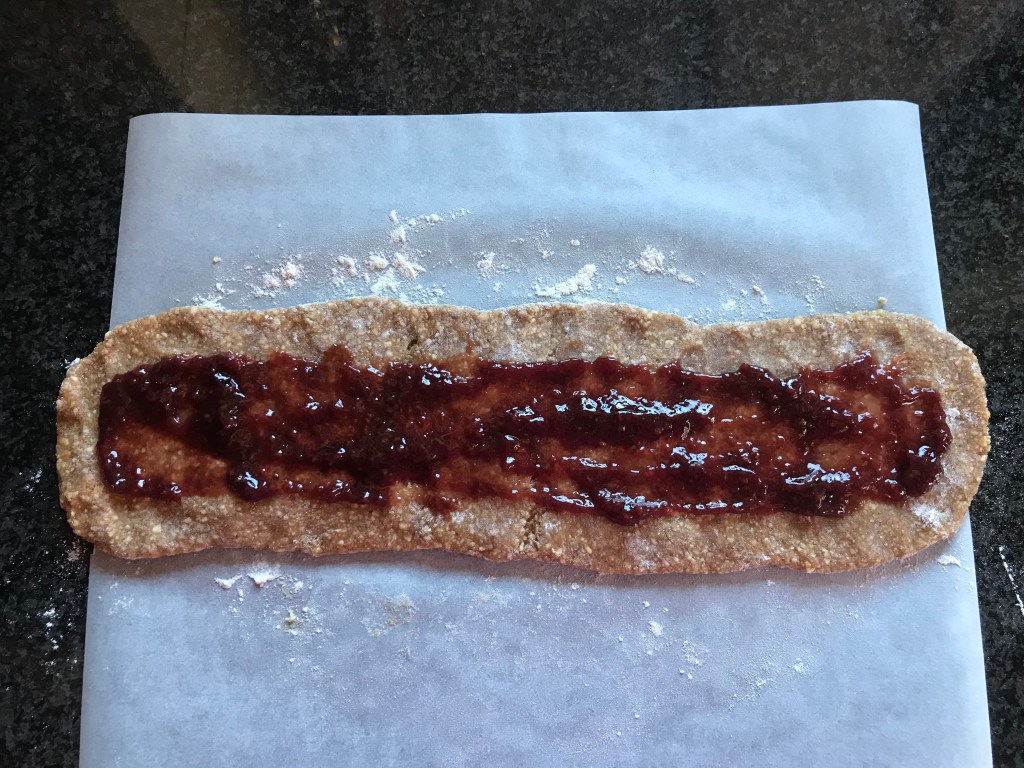 Arrange a sheet of parchment paper on the work surface, sprinkle with rice flour, then place the dough on top and, with floured hands, shape it into a rectangle 1cm thick, 10cm wide and 30cm long (see photos above). Spread the raspberry jam in the center, then roll it up on the long side, obtaining a cylinder. With a sharp knife, cut the cylinder every 2cm, giving shape to the biscuits.
