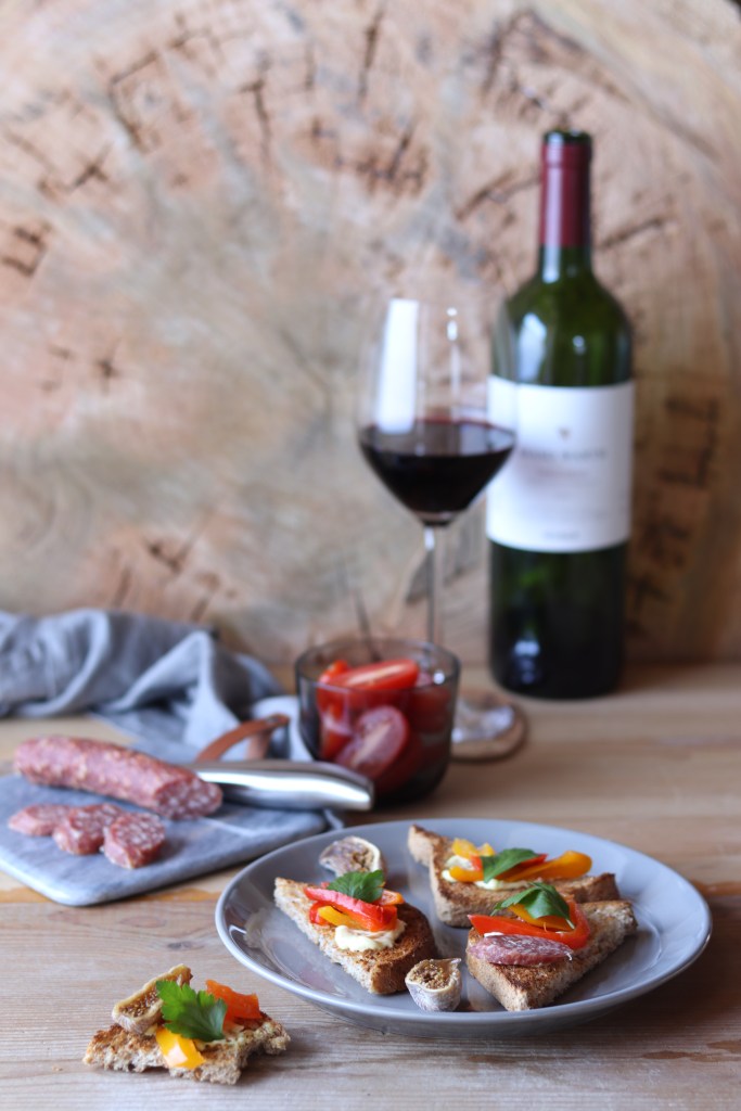 Tostare le fette di pane, per qualche secondo, sotto al grill del forno (stando attenti a non bruciarle, perché il grill scalda tantissimo), quindi tagliarle a metà ottenendo due triangoli per fetta. Farcire ogni triangolo con un po’ di salsa aioli (o maionese classica se preferite), i peperoni sott’olio (ben sgocciolati), qualche fetta di Kaminwurz ed i fichi secchi (tagliati a fettine). Guarnire con prezzemolo fresco e servire subito.