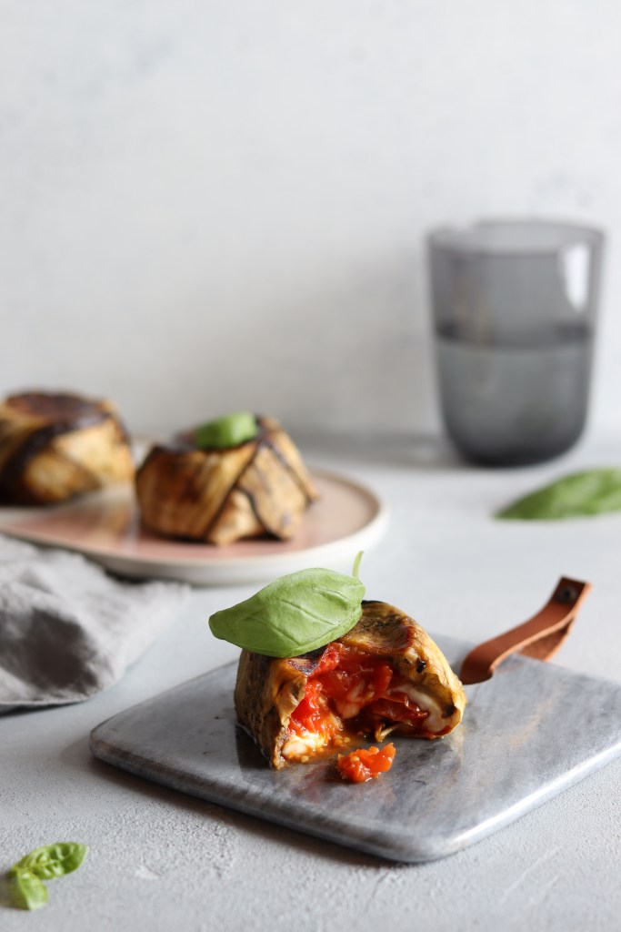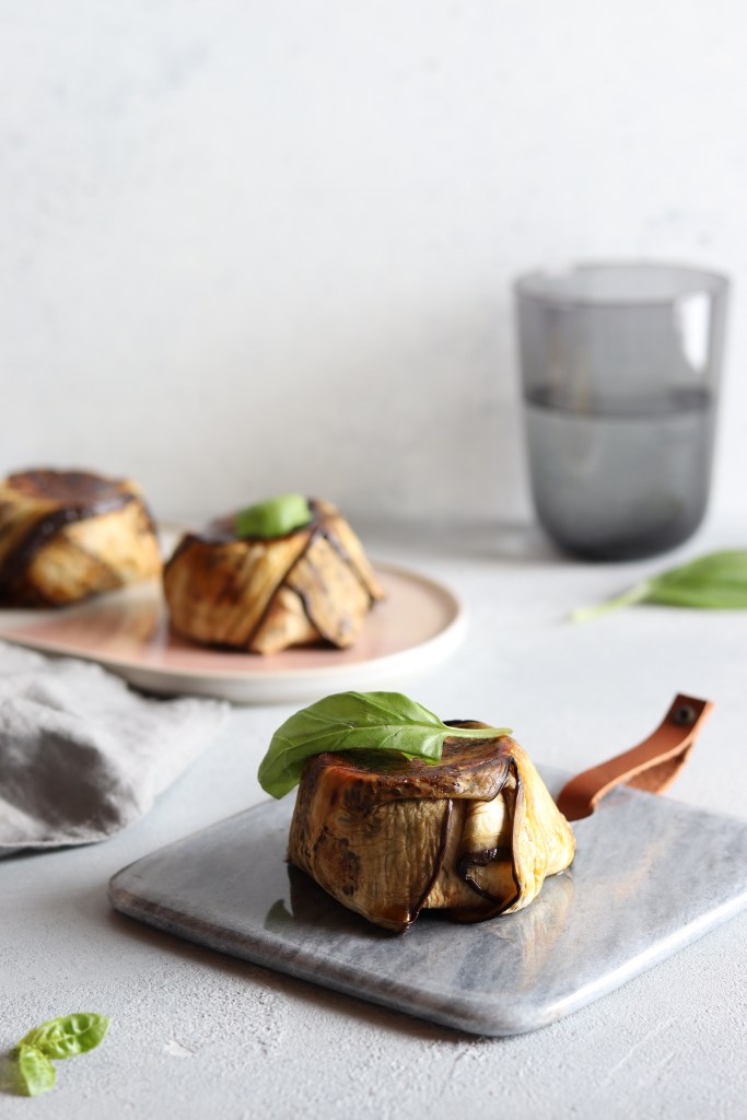 Procurarsi 3 stampini svasati, anche usa e getta in alluminio, ungerli con una goccia di olio extravergine di oliva, quindi disporvi 3 fette di melanzane per stampino, di modo da ricoprirne bene le pareti e facendo sbordare fuori le fette. Riempirli con cubetti di mozzarella alternati a pomodorini spadellati, fino al bordo. Ripiegare sul ripieno i lembi di melanzane che fuoriuscivano dagli stampini, di modo da sigillarne il contenuto.