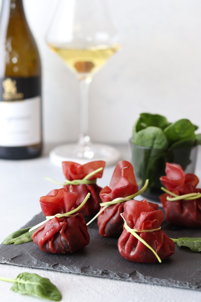 Scrigni di bresaola racchiudono un ripieno di spinaci e pecorino. Antipasto leggero, fresco e senza sensi di colpa.