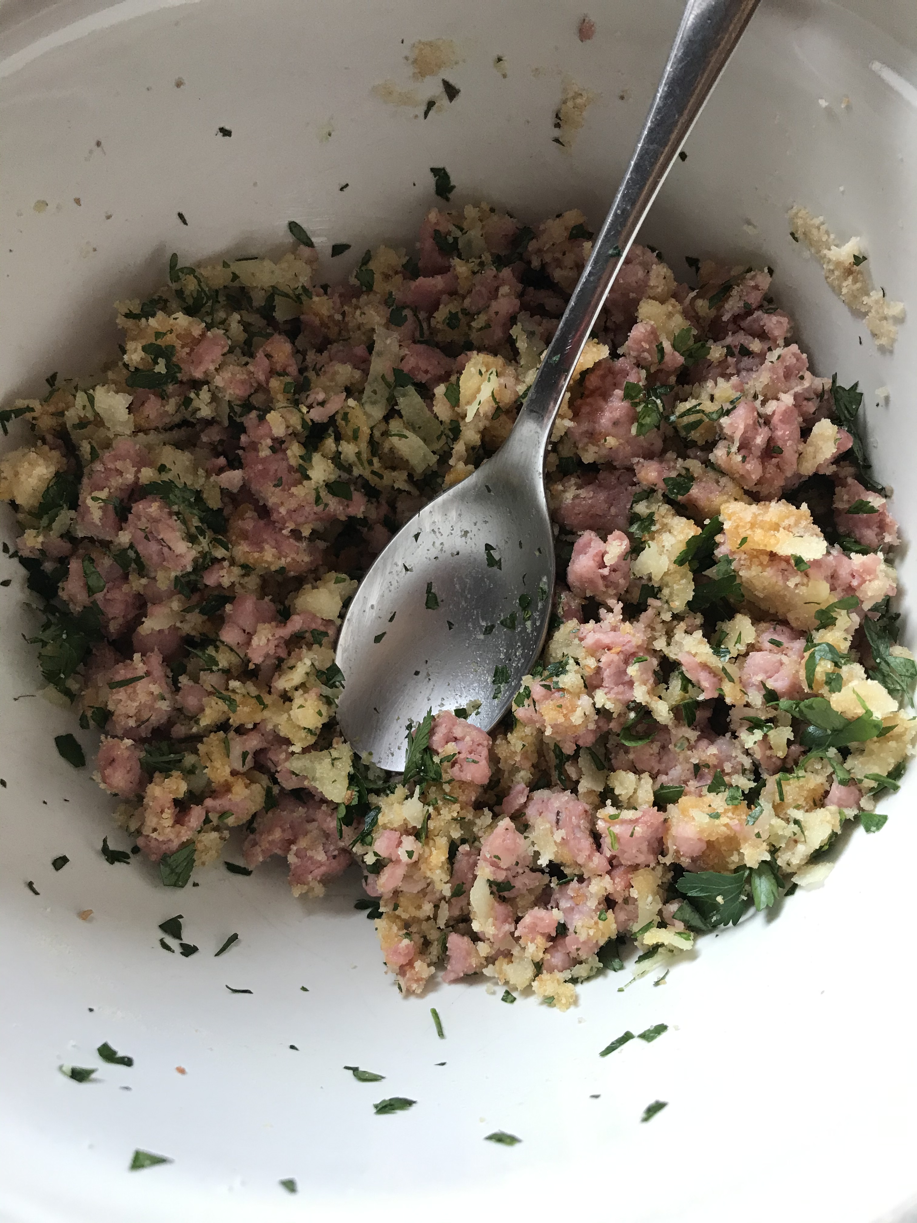 Place lucanica / sausage, crumbled, in a non-stick pan and cook for 5′, over a high flame, so that it becomes crispy, releasing its fat. Put lucanica in a bowl, together with breadcrumbs, grated pecorino, whole egg, chopped parsley and finely chopped garlic. Season with salt and pepper to taste.