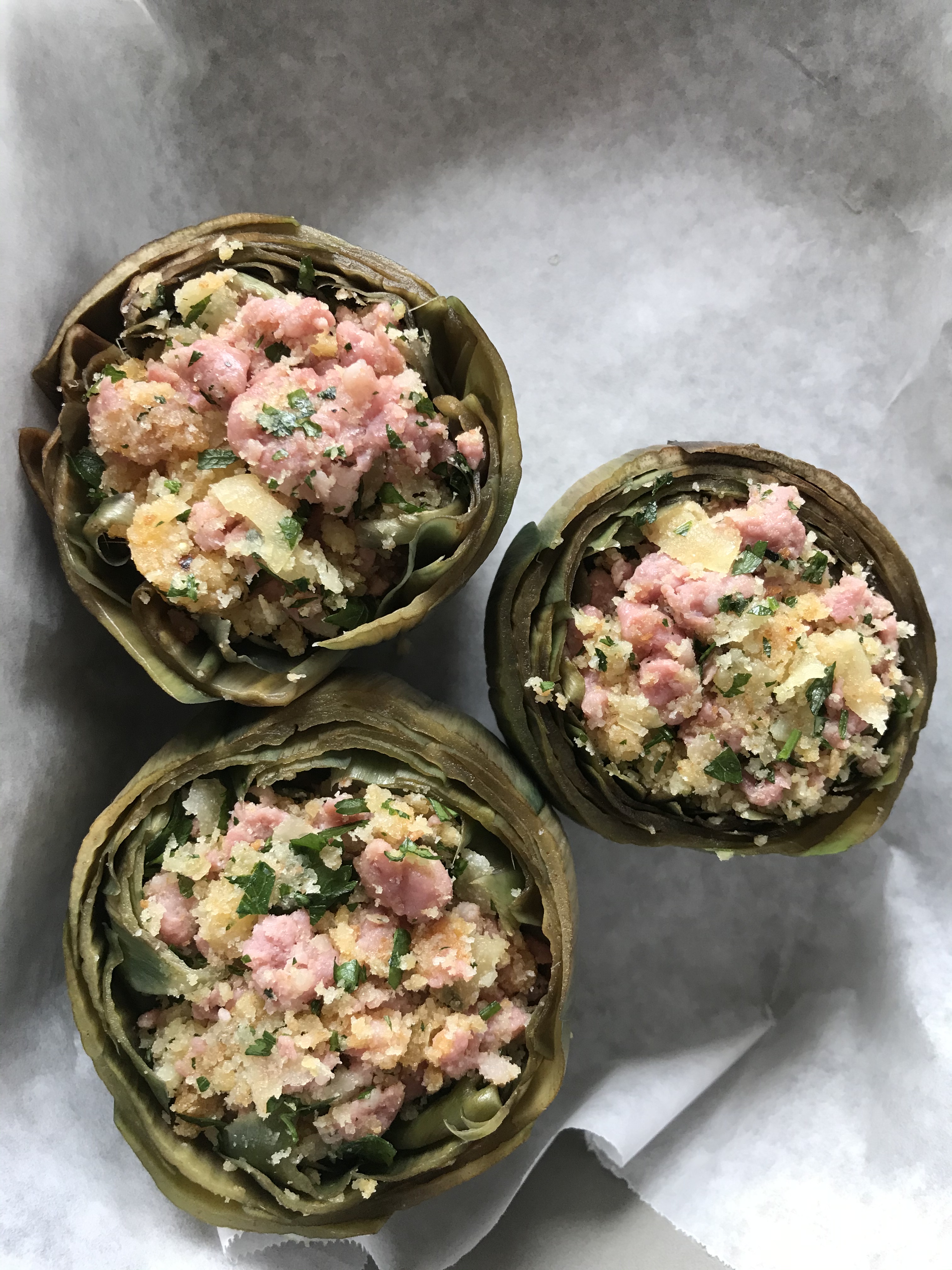 Pulire i carciofi, privandoli del gambo, togliendo le fogli più esterne, quindi aprendoli delicatamente al centro, di modo da togliere la barba interna con l’aiuto di un cucchiaino, creando lo spazio per il ripieno.