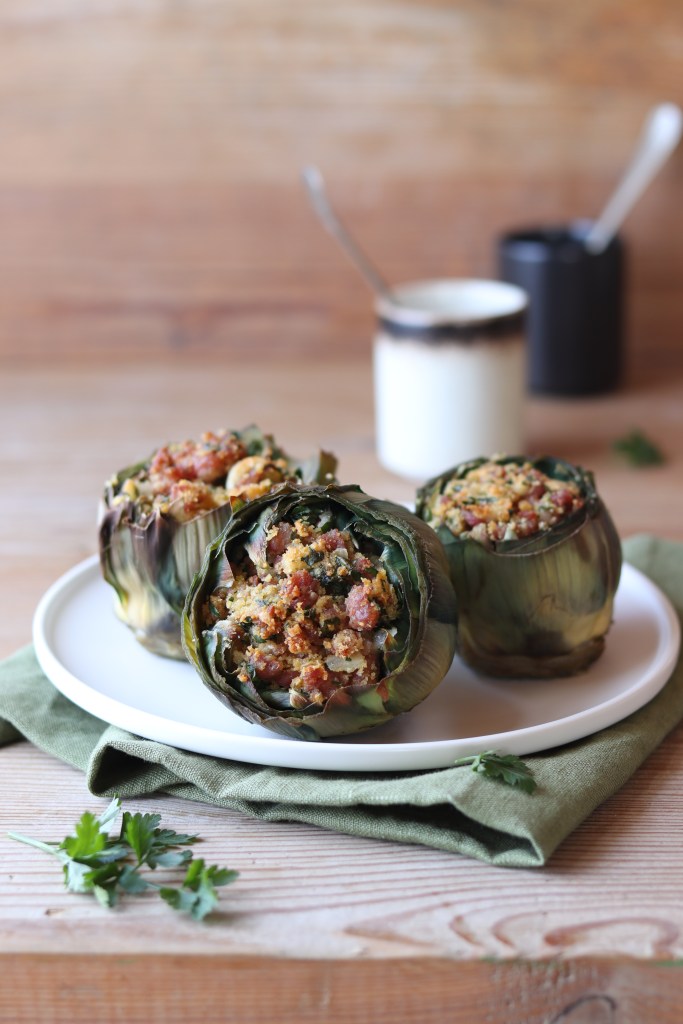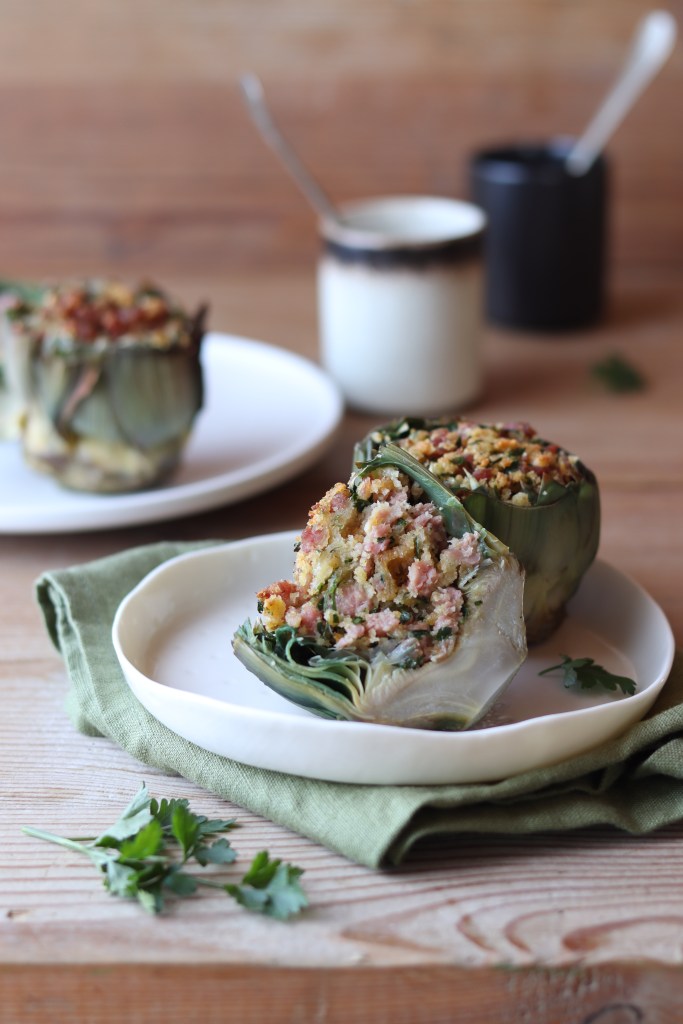 Carefully fill the artichokes with the filling, then place them in a baking dish lined with parchment paper, sprinkle them with a little oil, add 200mL of water on the bottom of the pan and bake in the preheated static oven at 200°C for about 30′.Remove from the oven, allow to cool for a few minutes, then serve.