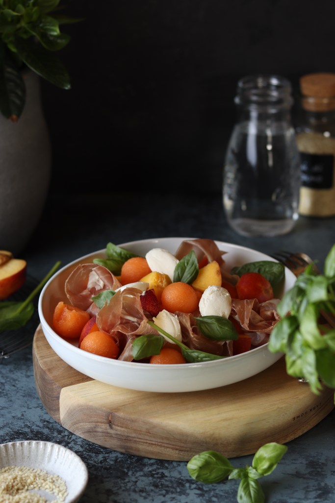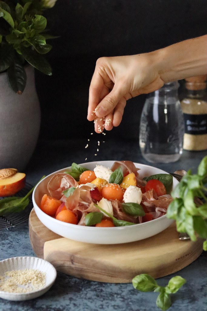 Disporre sul piatto di servizio la frutta, alternandola col prosciutto crudo e delle quenelle di fromaggio spalmabile, ottenute con 2 cucchiai. Guarnire con l’olio aromatizzato, i semi di sesamo, foglie di basilico fresco, pepe macinato al momento. Servire subito.