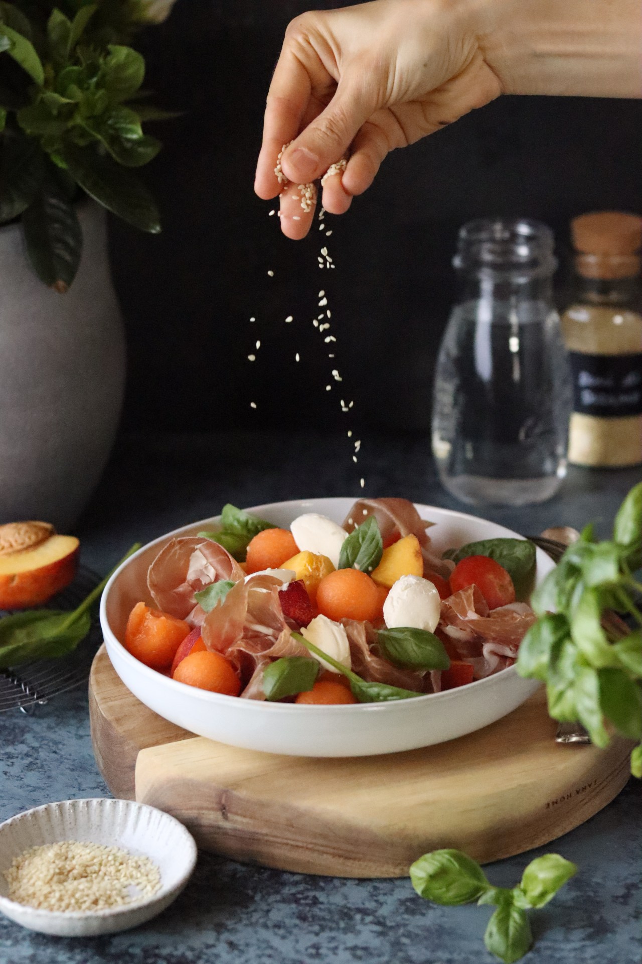 Disporre sul piatto di servizio la frutta, alternandola col prosciutto crudo e delle quenelle di fromaggio spalmabile, ottenute con 2 cucchiai. Guarnire con l’olio aromatizzato, i semi di sesamo, foglie di basilico fresco, pepe macinato al momento. Servire subito.