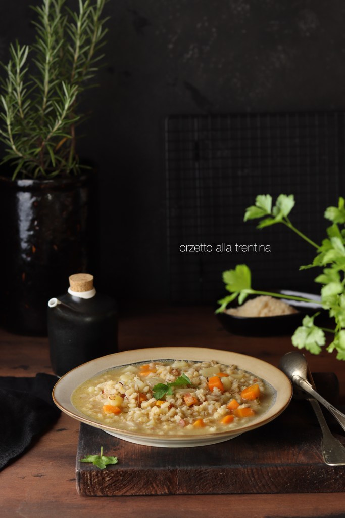 Tipica di tutta la nostra regione, questa zuppa è a base di orzo, con verdure e carne (speck o pancetta): lo speck viene utilizzato di preferenza in Alto Adige, tagliato più grosso, e a me non piace assolutamente il risultato che ne deriva, quindi affetto finemente della pancetta affumicata. La consistenza deve essere bella densa ed è servita con del grana grattugiato. Viene chiamata orzetto, o semplicemente minestra d’orzo ed altrettanto semplicemente è deliziosa.