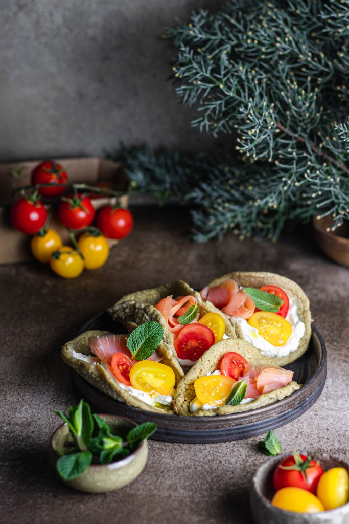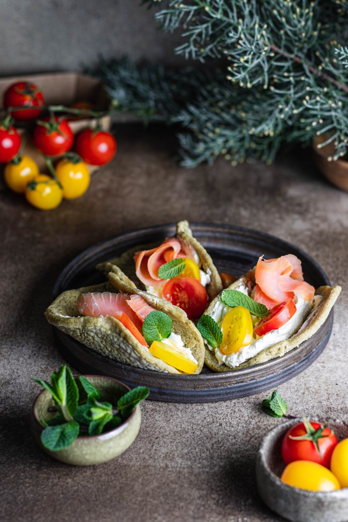 Servire subito, farcendo con formaggio spalmabile, salmone affumicato e pomodorini ed ultimando con foglie di menta e un filo di olio extravergine.
