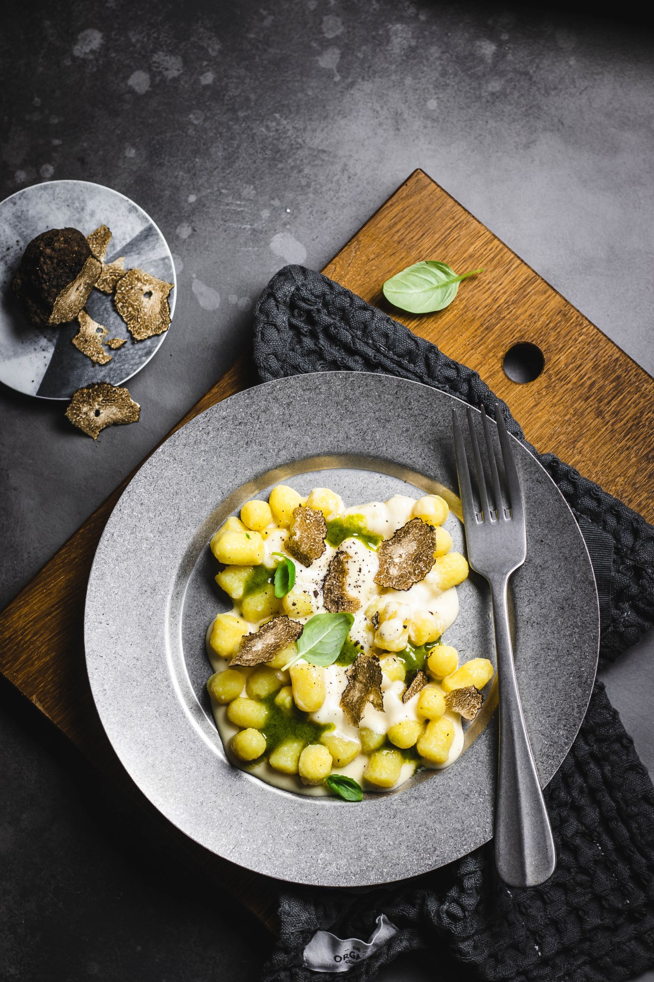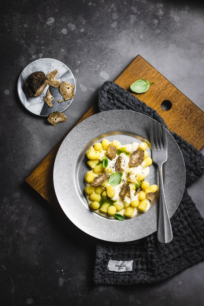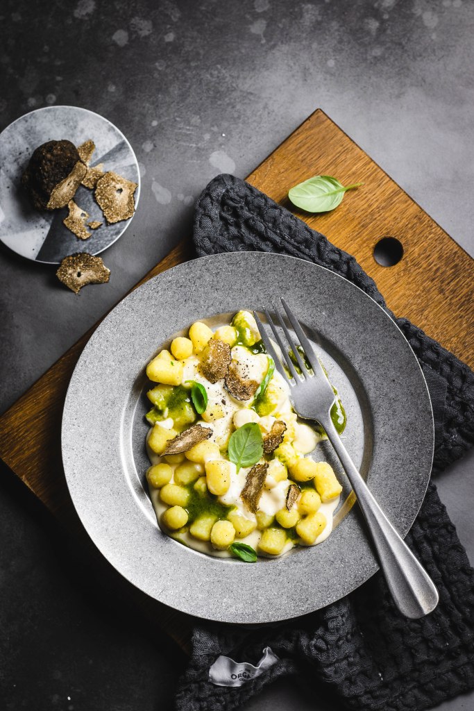 Una volta scolati gli gnocchi condirli con la fonduta di pecorino, impiattare, guarnire con l’emulsione al basilico ed ultimare con scaglie di tartufo fresco.