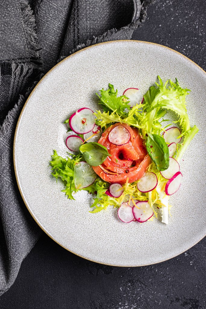 Rimuovere il salmone dalla marinatura, lavarlo velocemente sotto acqua fredda, tamponarlo con carta da cucina, rimuovere la pelle ed affettarlo. Servire subito, con un filo di olio a crudo e delle verdure croccanti.