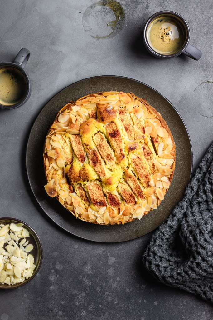 Versare l’impasto in una tortiera ricoperta con carta forno, disporre le fettine di mela sulla superficie, spolverare con cannella quindi disporre le lamelle di mandorle su tutto il bordo esterno.