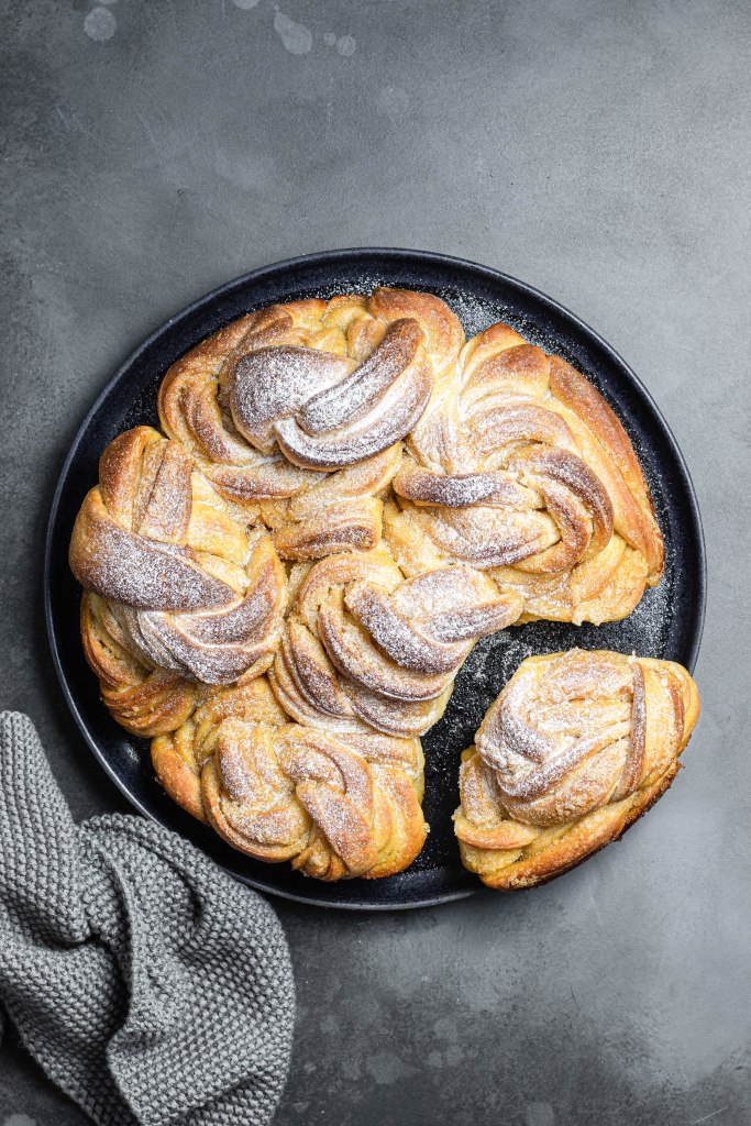 Questo dolce lievitato, tipico del mantovano, viene fatto fin dai tempi delle nostre nonne anche in Trentino, ma con una ricetta più semplice. L’impasto è quello classico di un pan brioche ma la farcitura prevede solo burro e zucchero, senza mandorle. Scenografico e profumato, viene servito per merenda o per una ricca colazione in famiglia.