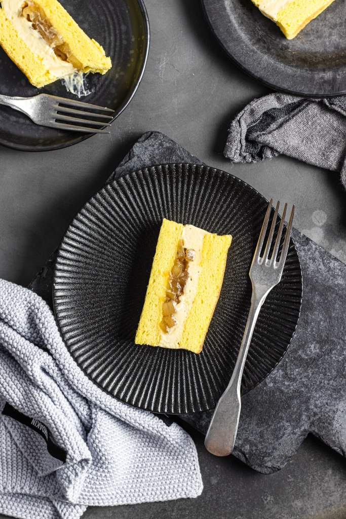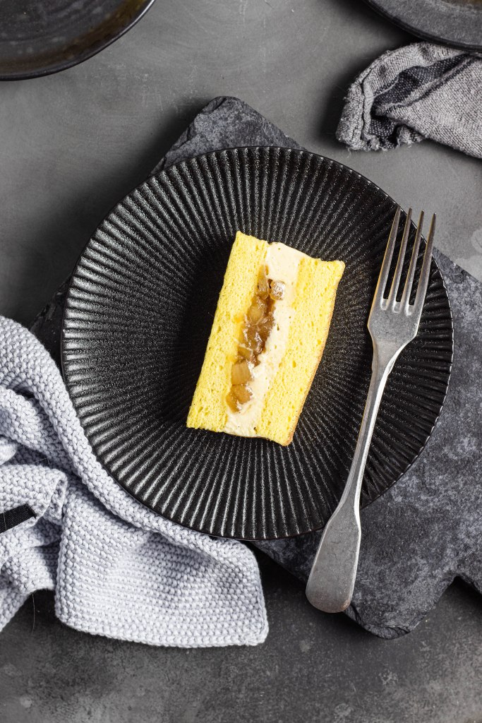 Tagliare il Pan di Spagna in due, partendo dal lato corto, ottenendo due strisce. Posizionarne una sul piatto da portata, distribuirvi centralmente lungo tutta la lunghezza la composta di mele, lasciando i bordi liberi. Posizionare la crema in una sac à poche e dressarla lungo i bordi del ripieno e anche sopra di esso. Ricoprire con l’altro pan di Spagna, premere per compattare bene, rifinire i bordi con una spatola se la crema fuoriuscisse dai lati, quindi coprire con pellicola e spostare in frigorifero per almeno 2h.