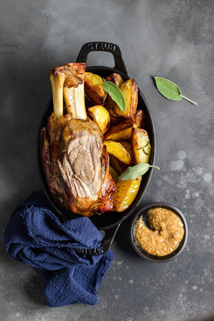 Una volta cotti gli stinchi, toglierli dal forno, avvolgerli in alluminio e farli riposare per 30′. Servirli nappandoli con la loro salsa ed accompagnare con patate rustiche, crauti e senape al miele.