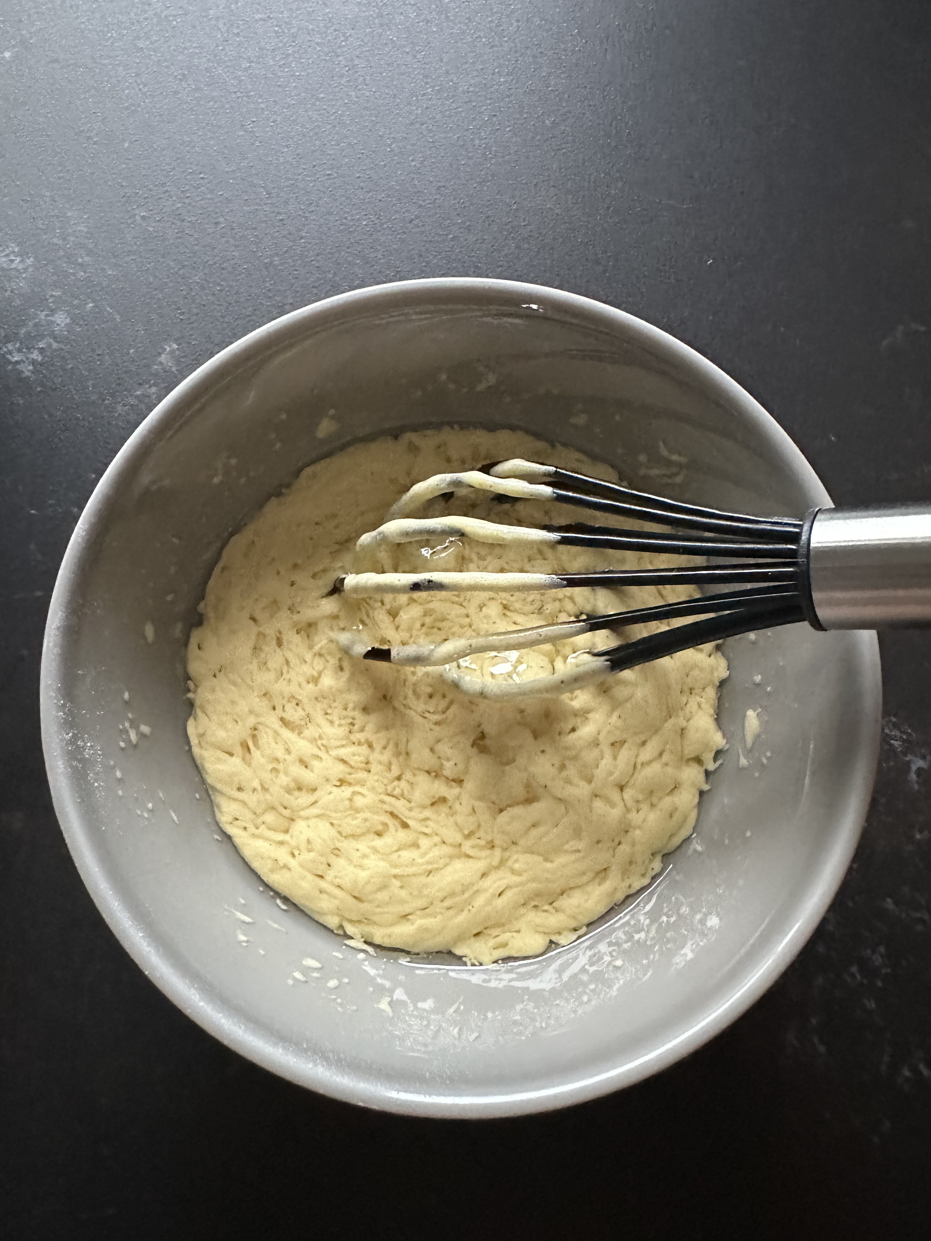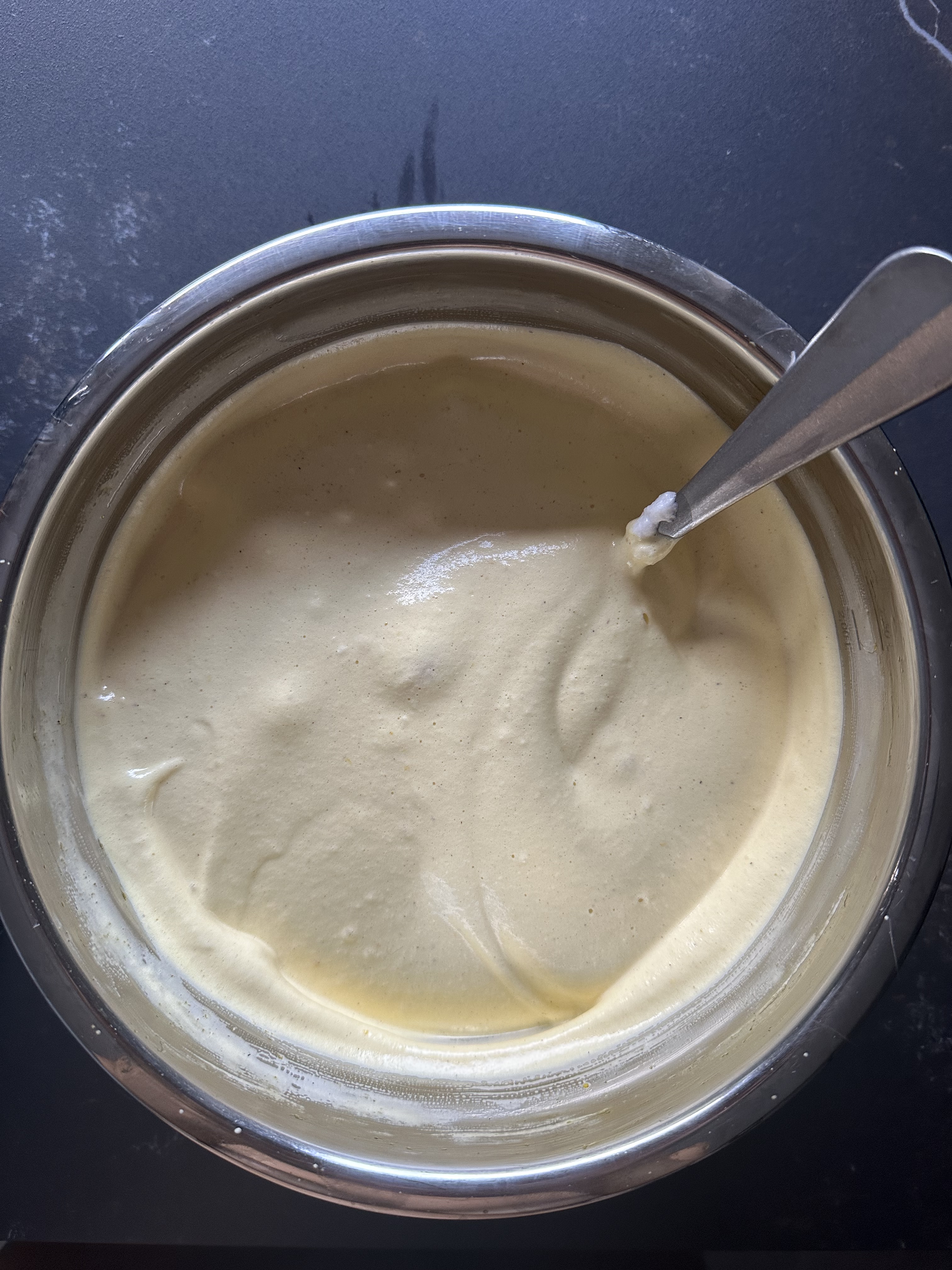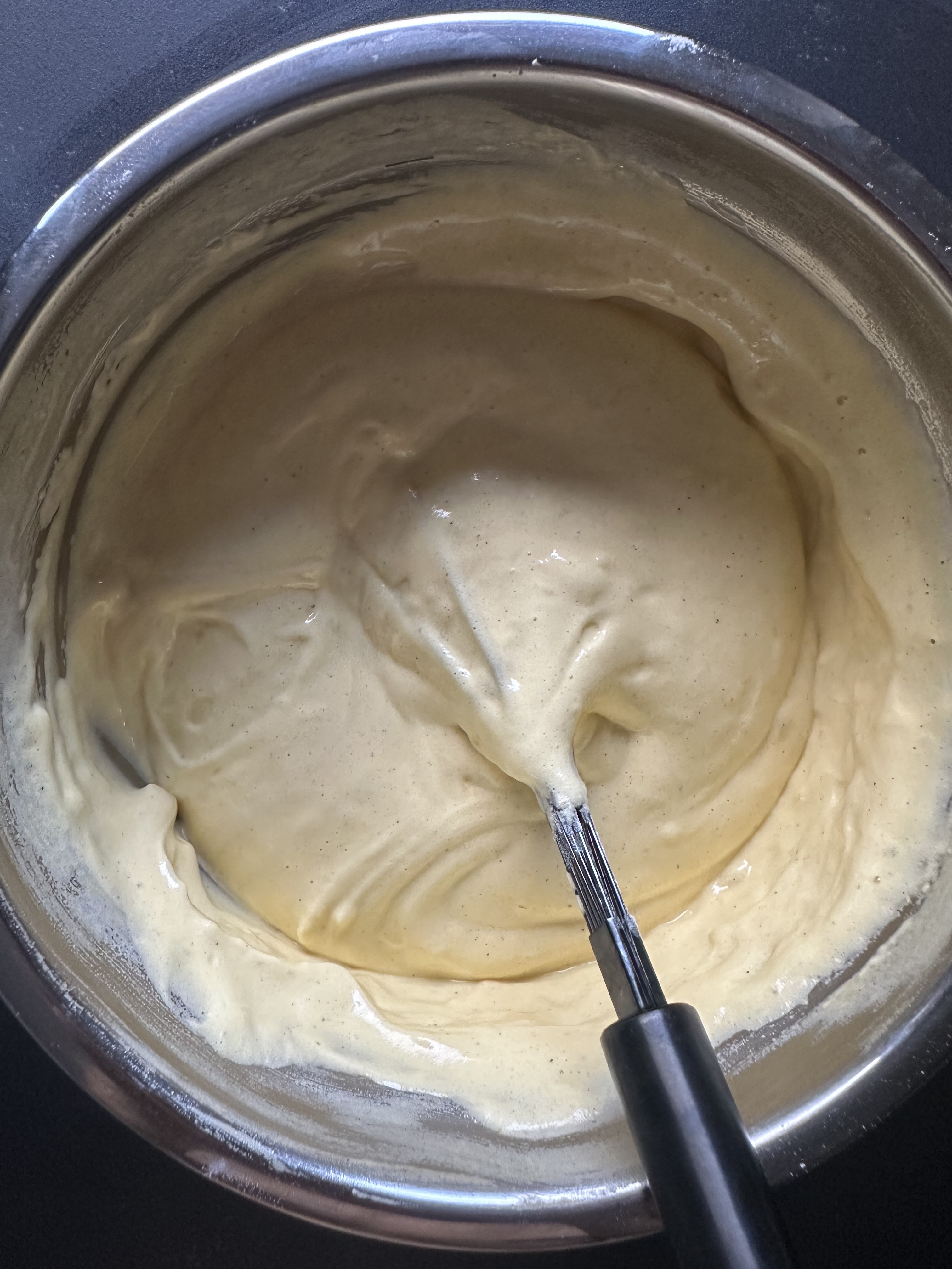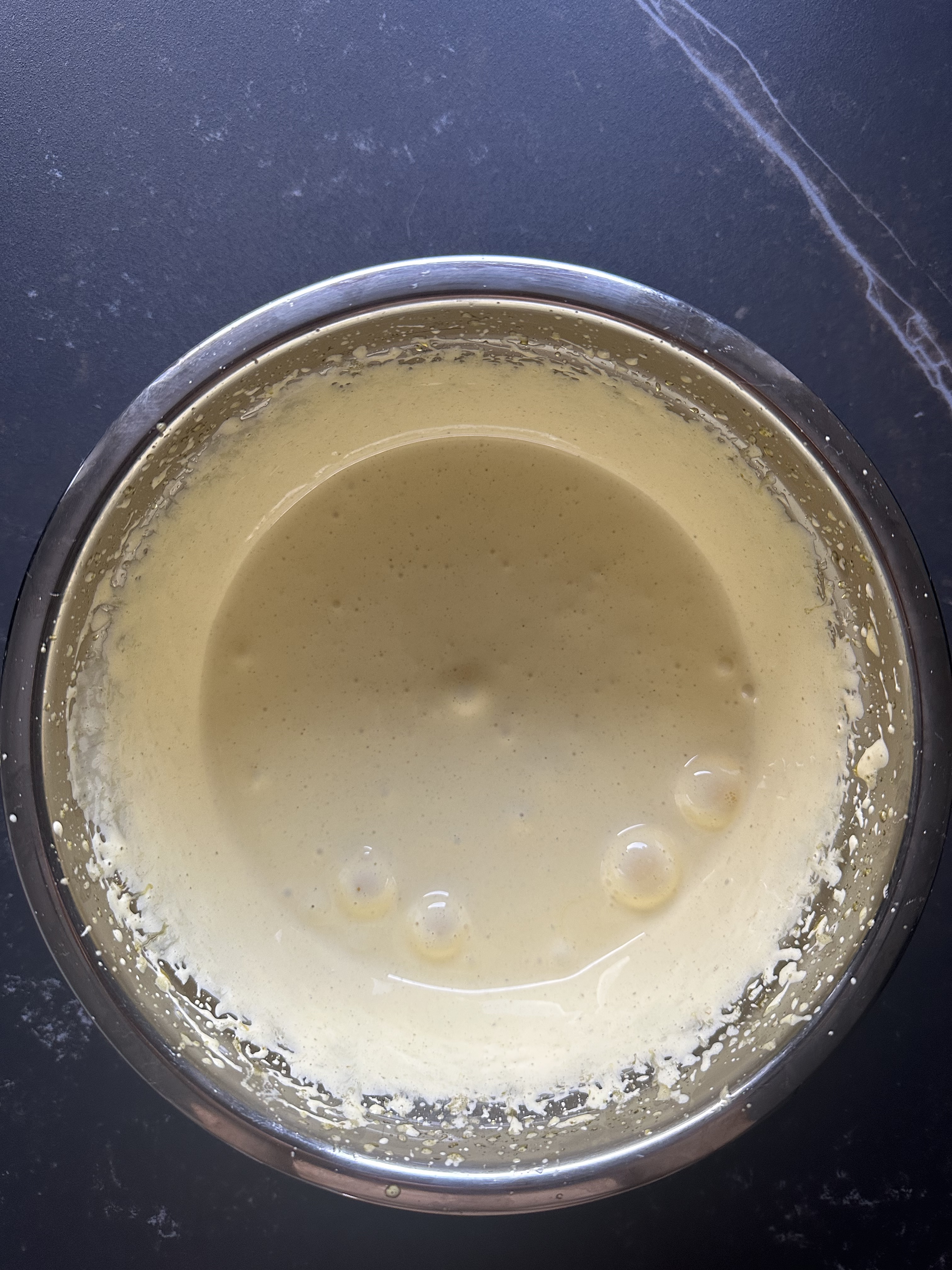 Scaldare l’olio per qualche secondo in microonde, quindi aggiungervi 2 cucchiai del composto e mescolare bene con una frustina: all’inizio l’emulsione sembrerà separarsi (foto 5), ma continuando a mescolare diventerà ben legata, della consistenza di una crema (foto 6). Aggiungere questa crema alla massa.