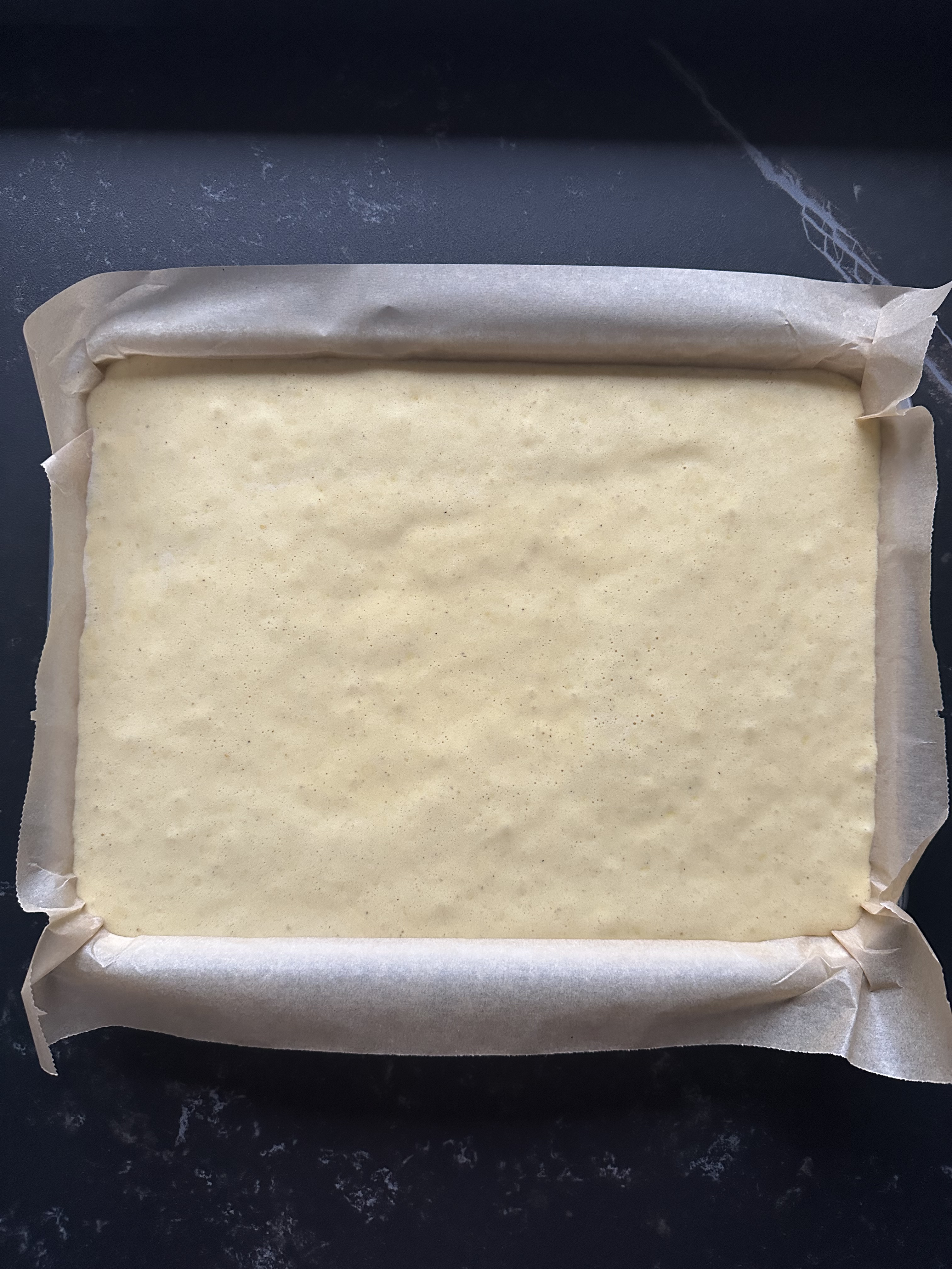 Versare in una teglia da forno (25 x 35 cm), foderata con carta forno, quindi battere due volte la teglia sul piano di lavoro, per eliminare le bolle di aria più grosse (foto 7). Cuocere in forno statico preriscaldato a 170°C per 20′ circa: la superficie deve essere dorata. Regolarsi col proprio forno e controllare la cottura dopo 15′.