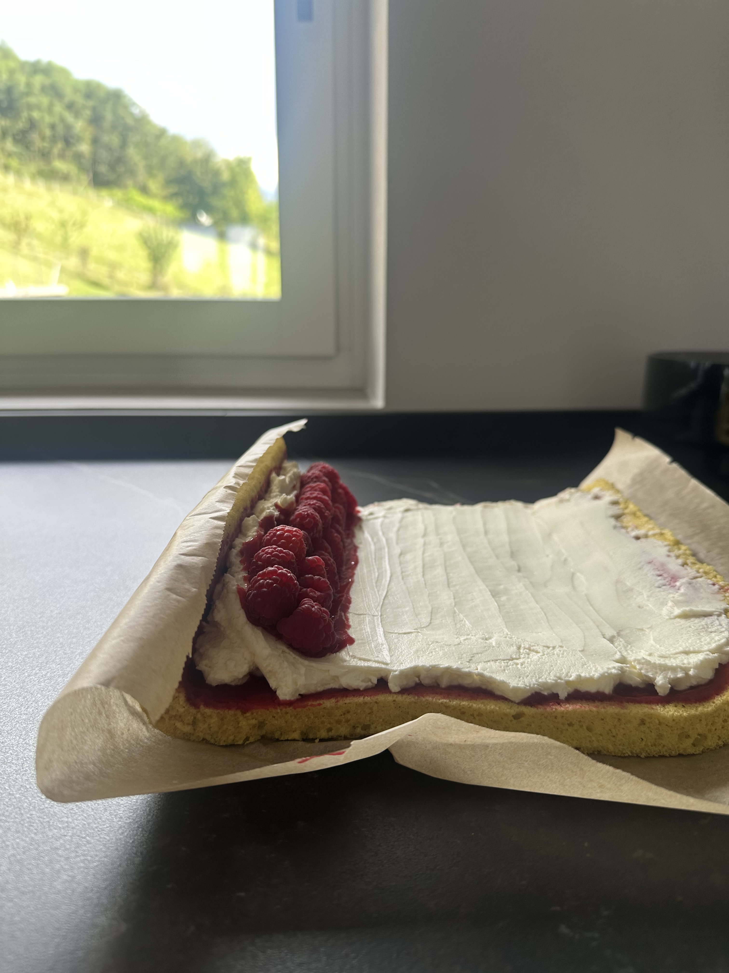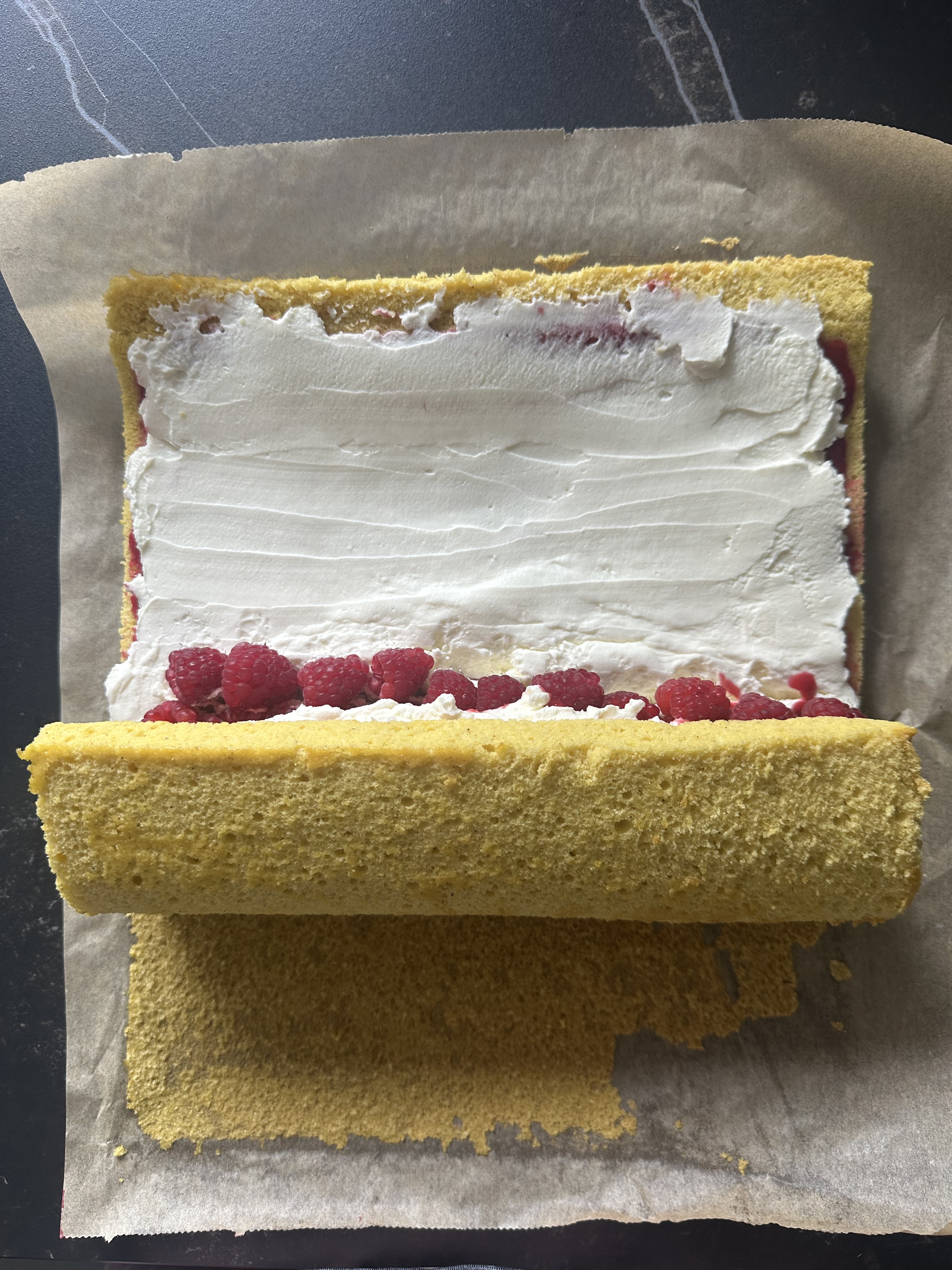 Per la farcitura: montare panna e mascarpone, freddi di frigo, con le fruste elettriche, fino ad ottenere una crema soda. Srotolare con delicatezza il rotolo, spalmare la confettura sulla superficie (lasciandone da parte due cucchiai), farcire con la panna (mettendone di più sul lato corto da cui si arrotola) e distribuire una fila doppia di lamponi sullo stesso lato, insieme ai due cucchiai di confettura tenuti da parte (foto 1 e 2). Chiudere il rotolo (normalmente la pellicina che si forma in cottura si staccherà da sola, altrimenti potete staccarla a mano con delicatezza) (foto 3, 4 e 5), ricoprire con pellicola e spostare in frigorifero per almeno 3h.