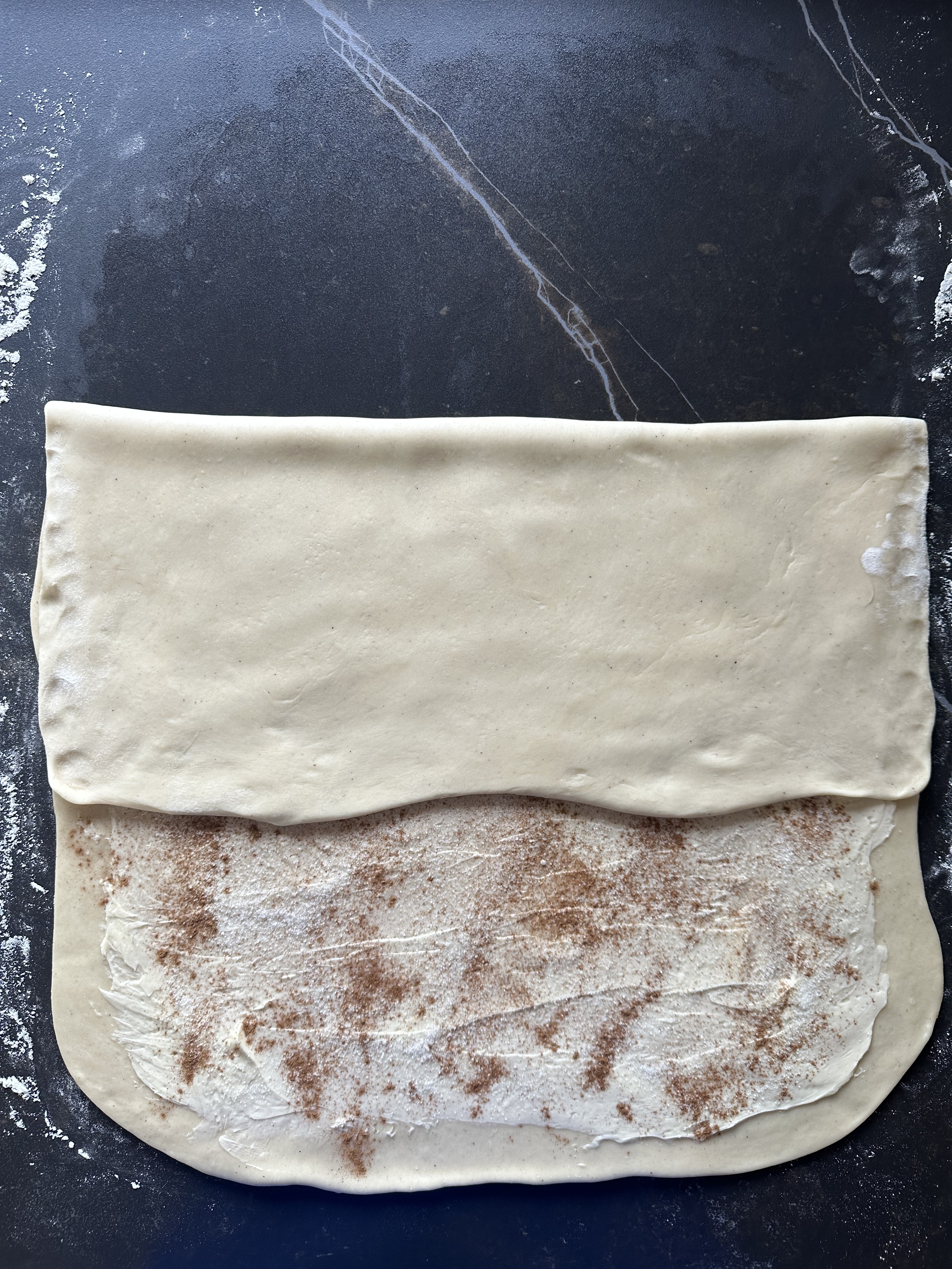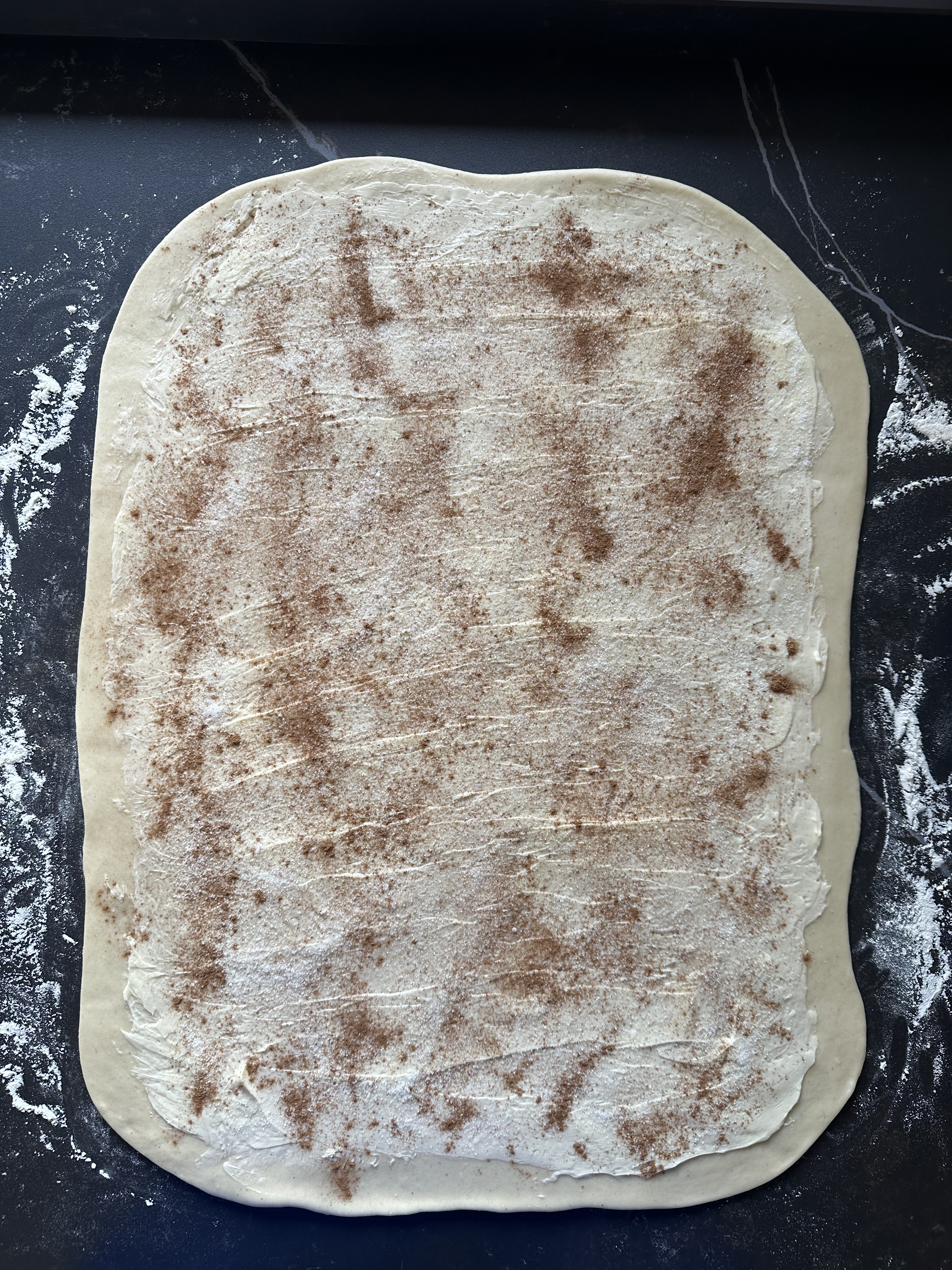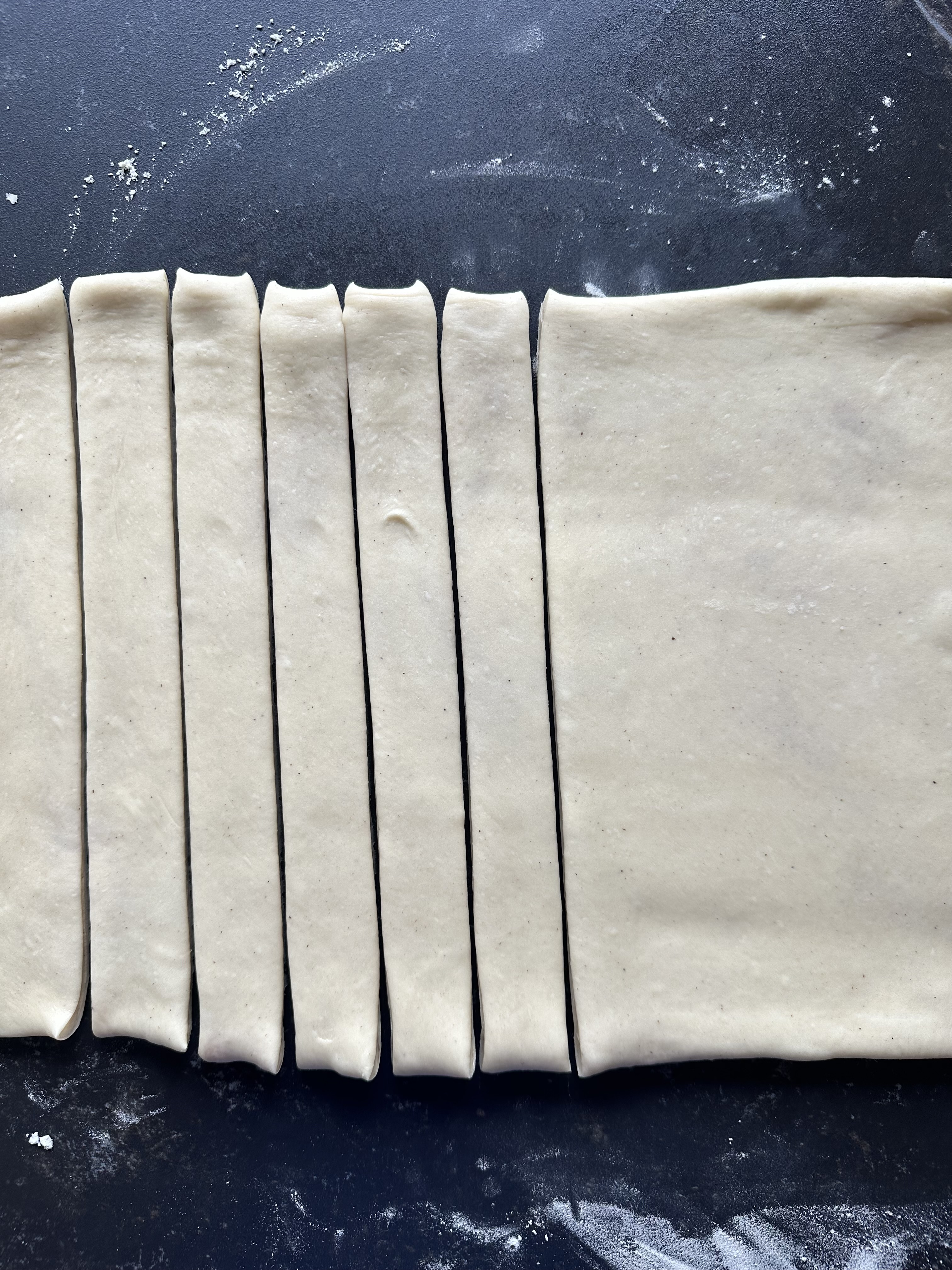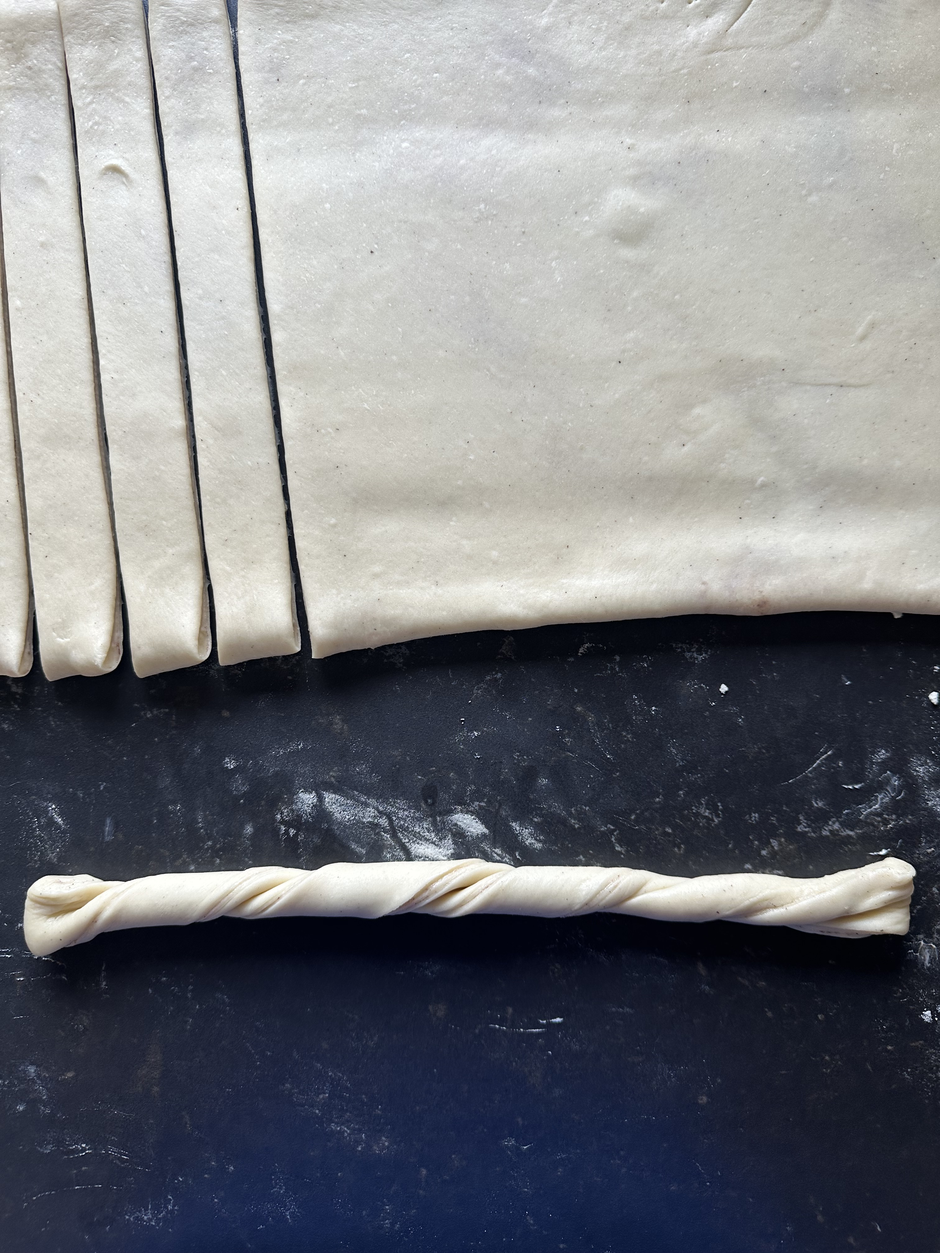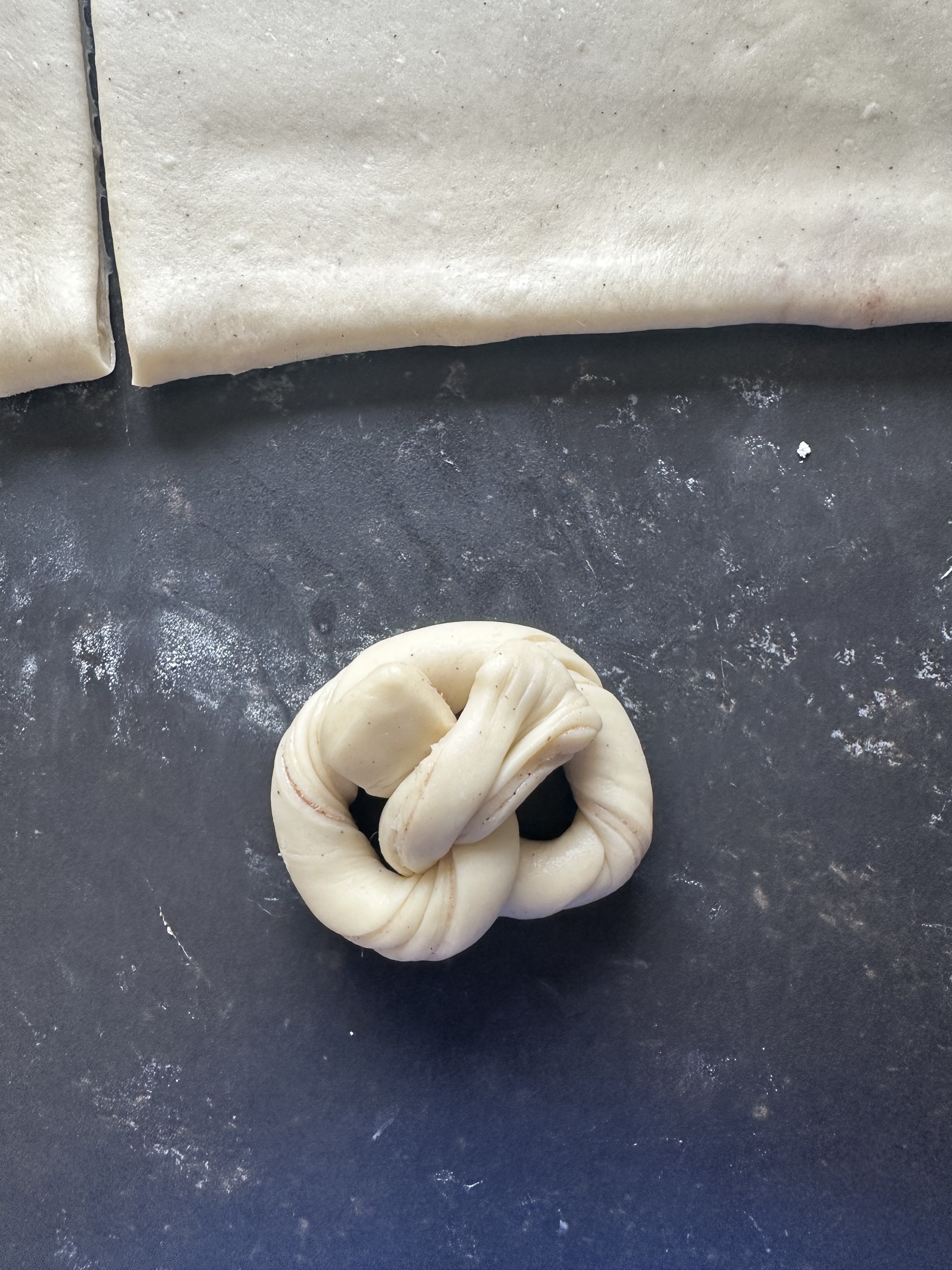 Per la farcitura: in una ciotola disporre il burro morbido e lavorarlo a crema per qualche secondo con una spatola. Riprendere l’impasto dal frigorifero e stenderlo col mattarello sul piano leggermente infarinato, in un rettangolo spesso 7-8mm, col lato corto davanti a voi (foto 1). Spalmare il burro su tutta la superficie, distribuirvi sopra lo zucchero e la cannella (foto 2), piegare un lembo sul ripieno (foto 3) ed il secondo lembo sul precedente, chiudendo bene i bordi (foto 4). Stendere nuovamente di modo da avere un rettangolo lungo, alto circa 25 cm (foto 5). Con una rotella ricavare dei cordoncini (foto 6). Arrotolate ogni cordoncino (foto 7), quindi modellarlo a forma di bretzel (foto 8). Posizionare le brioche, con la chiusura sotto, su teglie ricoperte con carta forno, a debita distanza l’una dall’altra (foto 9). Coprire con pellicola e far lievitare in luogo tiepido fino al raddoppio.