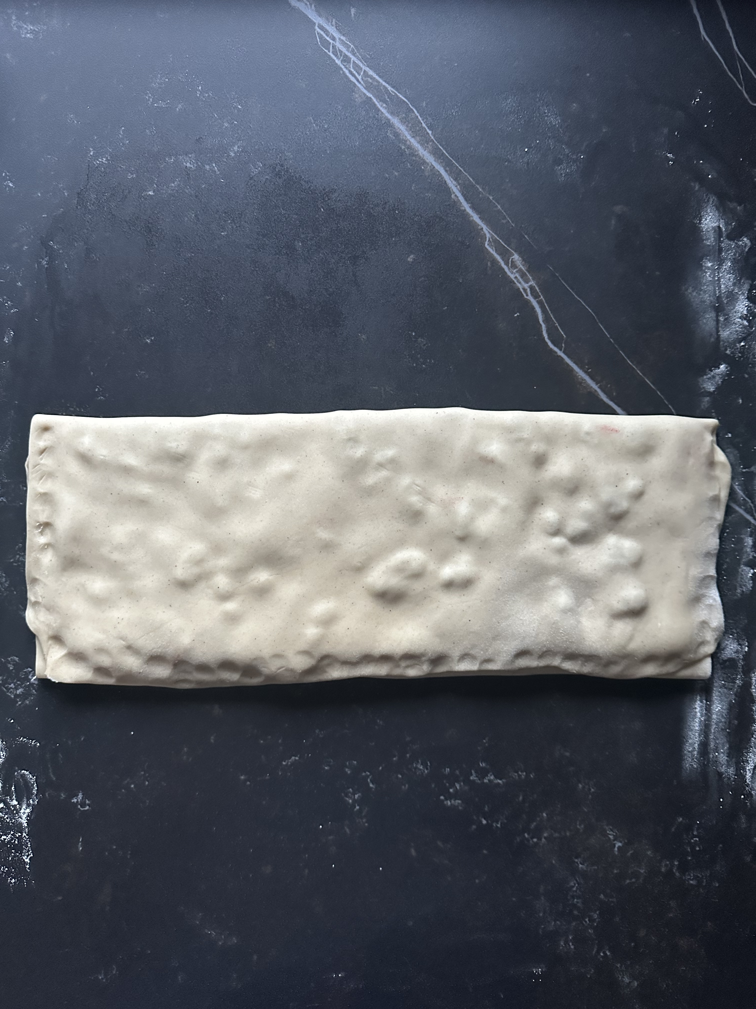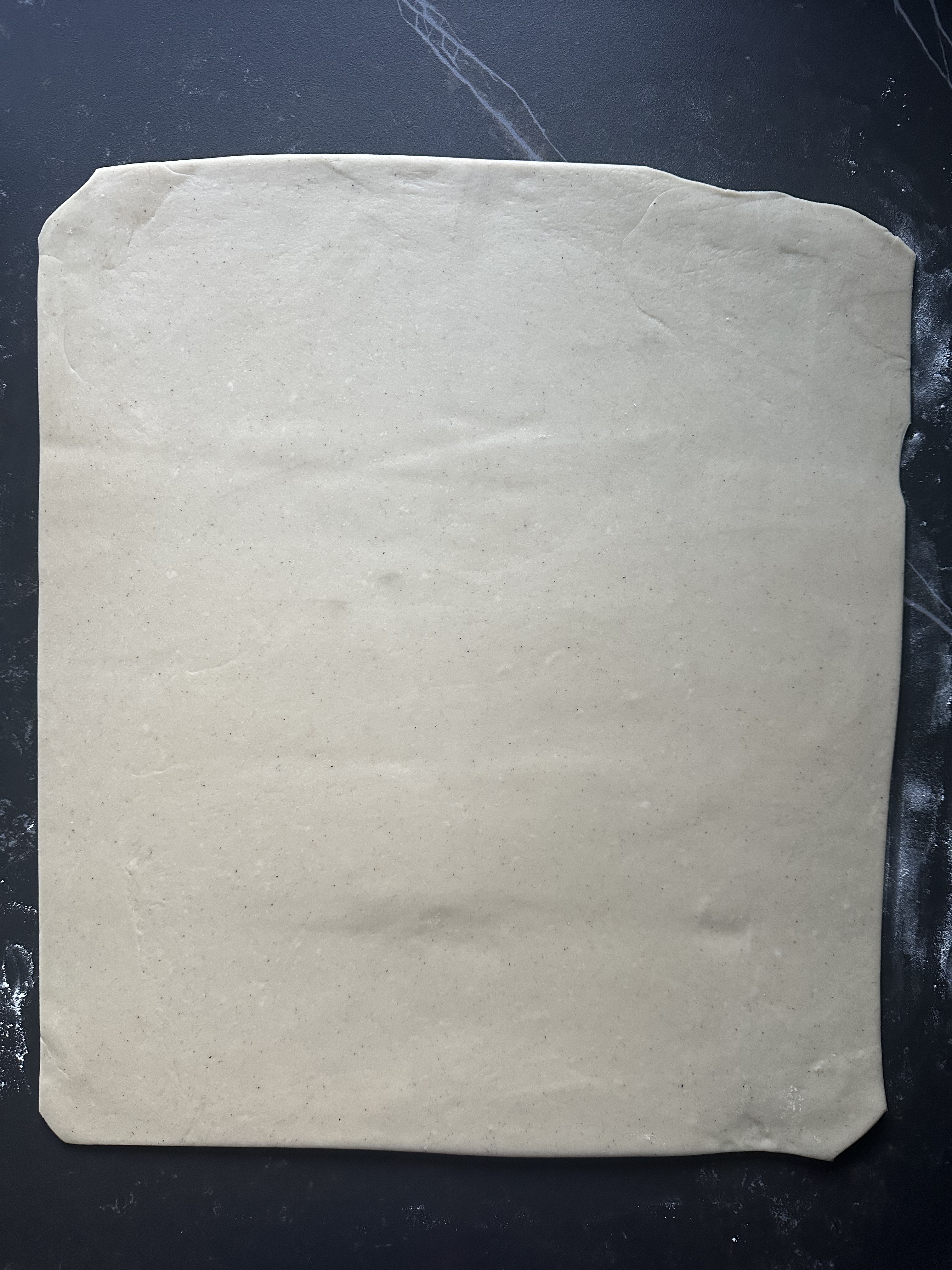 Per l’impasto: intiepidire il latte e scioglierci il lievito. Versare tutto nella ciotola della planetaria, insieme al resto degli ingredienti, tutti insieme (accertarsi che il burro sia morbido, consistenza spalmabile). Impastare prima a velocità bassa per circa 5′, quindi, una volta ottenuto un impasto grossolano, proseguire a media velocità ed impastare per circa 20′: l’impasto deve risultare perfettamente liscio, omogeneo, setoso e ben attorcigliato attorno al gancio. Potete effettuare la prova del velo, ossia prendendo un pezzo di impasto fra le mani e stirandolo fra le dita, esso deve tendersi fino a diventare quasi trasparente, senza strapparsi (foto 1): se così non fosse, proseguite ad impastare per altri 5′. Dare all’impasto la forma di un rettangolo, ricoprirlo con pellicola e spostare in frigorifero per 1 h.