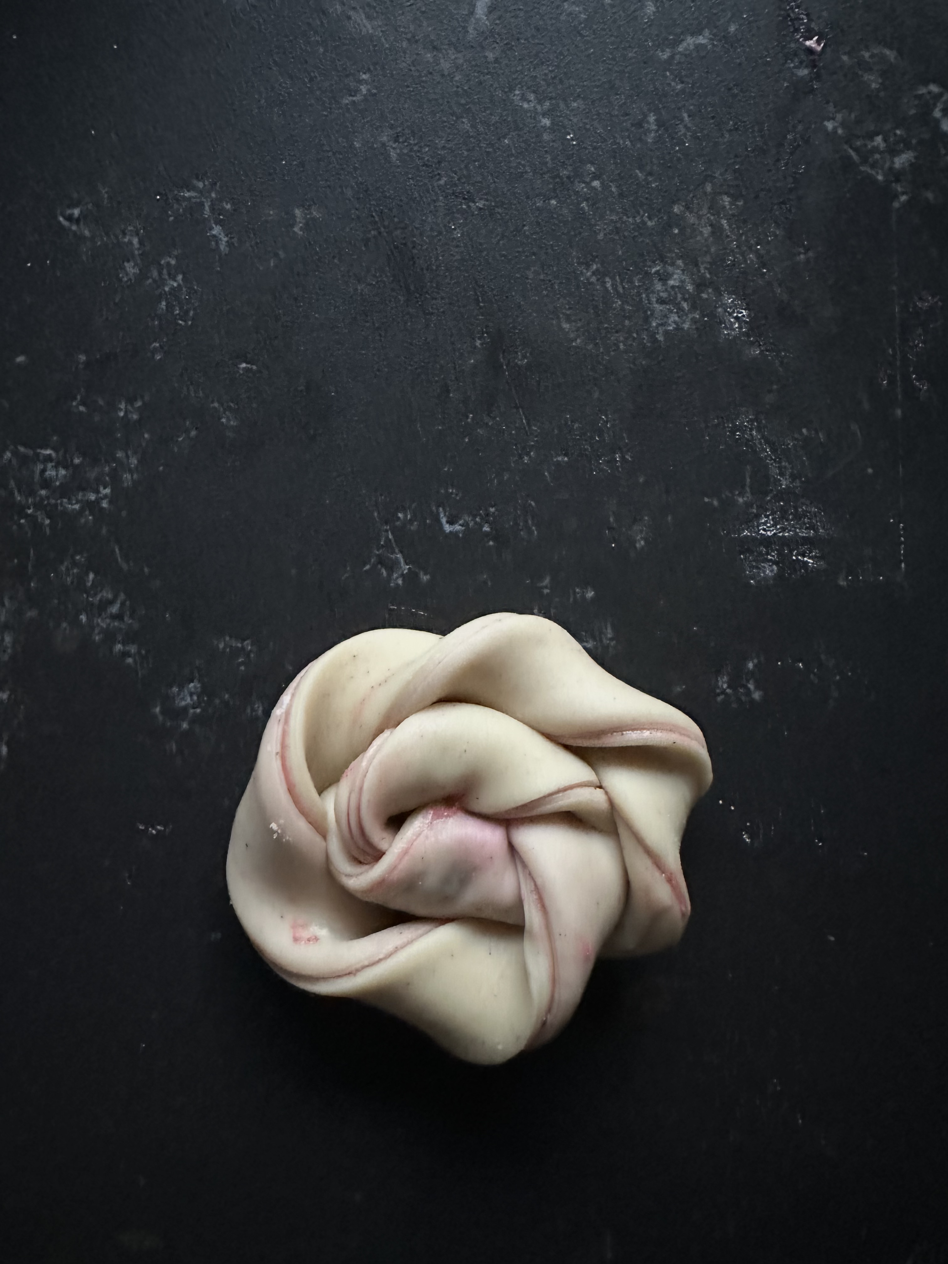 Per la farcitura: in una ciotola disporre il burro morbido e lavorarlo a crema per qualche secondo con una spatola insieme ai lamponi in polvere (o confettura). Riprendere l’impasto dal frigorifero e stenderlo col mattarello sul piano leggermente infarinato, in un rettangolo spesso 7-8mm, col lato corto davanti a voi (foto 2). Spalmare la farcia su tutta la superficie (foto 3), distribuirvi sopra i mirtilli disidratati (foto 4), piegare un lembo sul ripieno ed il secondo lembo sul precedente, chiudendo bene i bordi (foto 5). Stendere nuovamente di modo da avere un rettangolo lungo, alto circa 25 cm (foto 5). Con una rotella ricavare dei cordoncini. Arrotolate ogni cordoncino (foto 6), quindi modellarlo a forma di spirale (foto 7-8). Posizionare le brioche su teglie ricoperte con carta forno, a debita distanza l’una dall’altra. Coprire con pellicola e far lievitare in luogo tiepido fino al raddoppio.